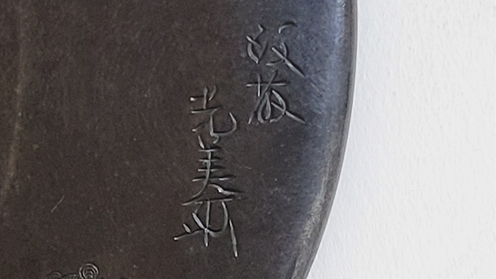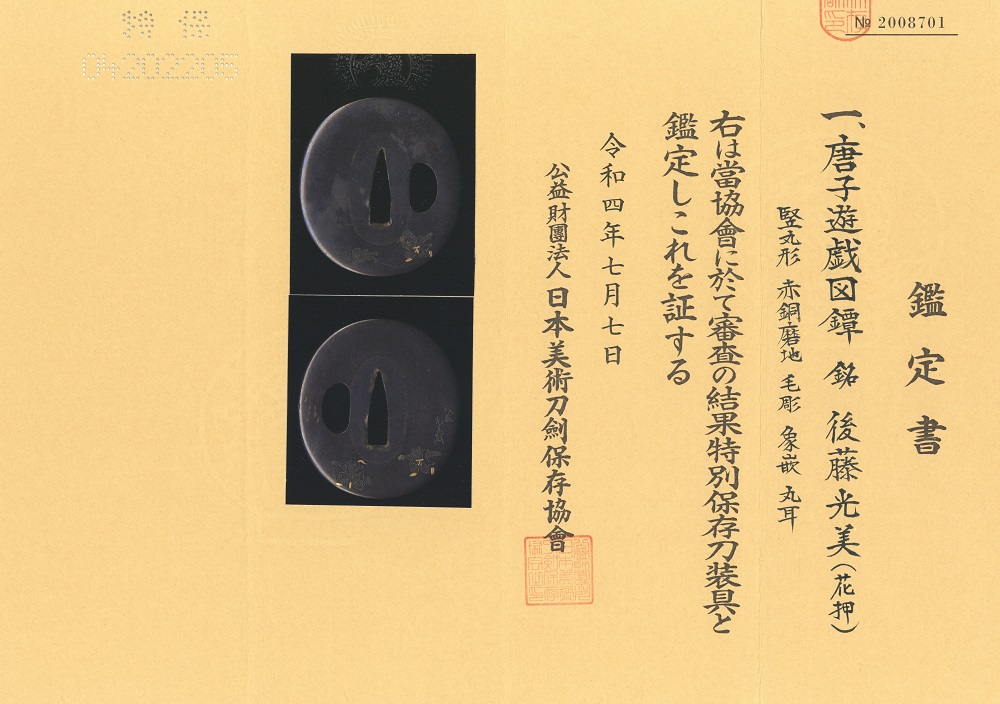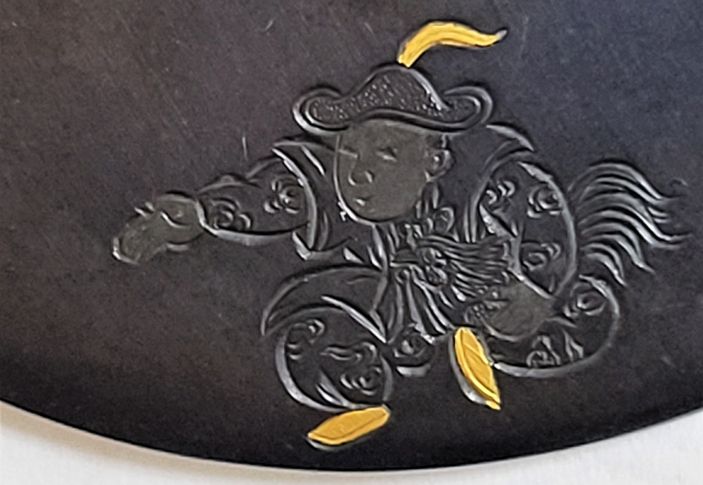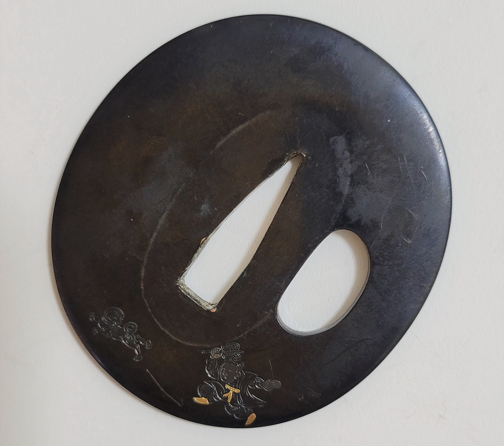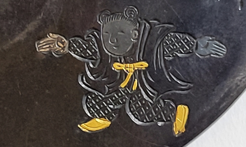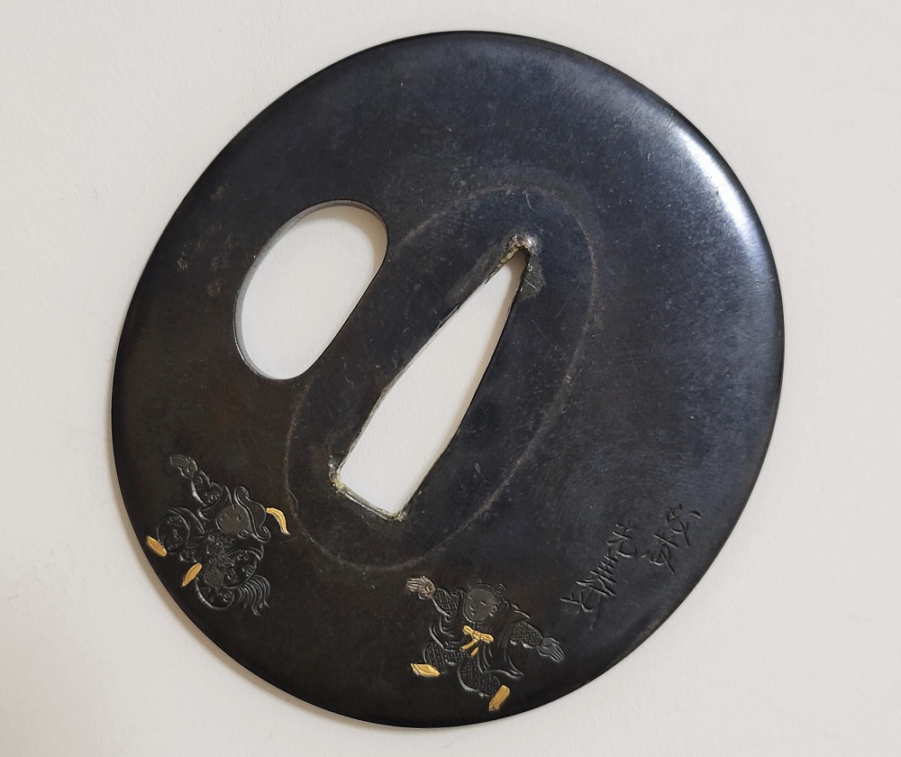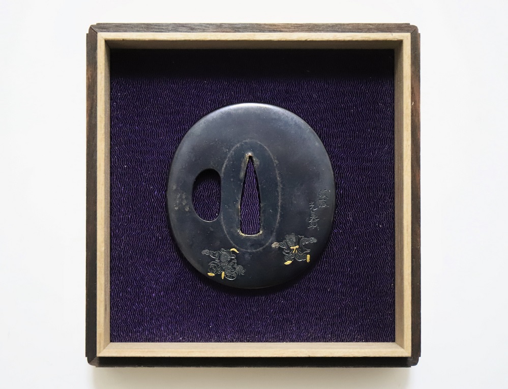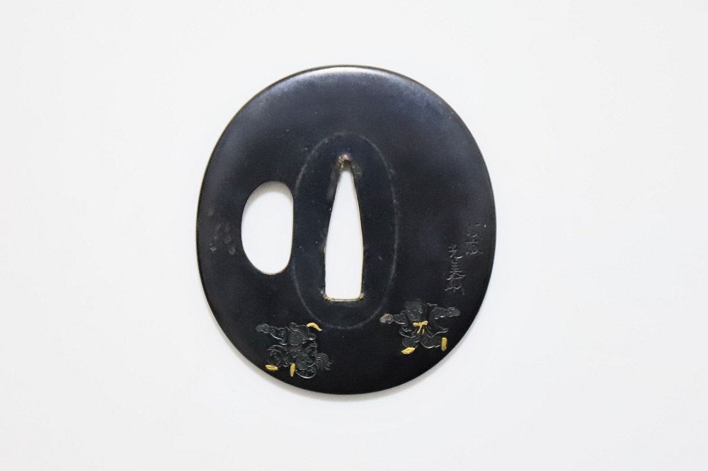 | This crafsman, Goto Mitsuyoshi, was the Soke of the Goto Tradition, fifteenth generation. He was born in 1780 in Edo as the son of Mitsumori, the Soke of the Goto tradition, fourteenth generation. Mitsuyoshi took over as Soke in 1804 and named himself as Shirobei. He passed away in 1843 at the age of 64. Shinjo was his Shigo which was the name given to him after his death. The design of this Tsuba has boys playing dressed in ancient Chinese clothes. It has a mark proving it was crafted by Mitsuyoshi (Mioboe Tagane). A Shakudo Tsuba is rare for a Goto Soke Craftsman. It has passed the Tokubetsu Hozon Shinsa in May 2022. |