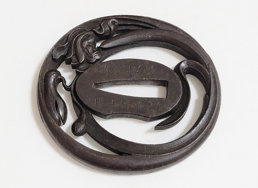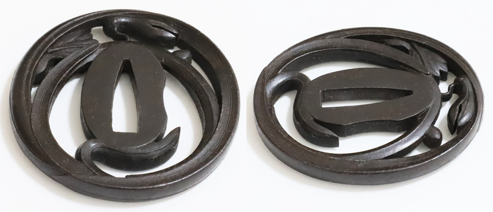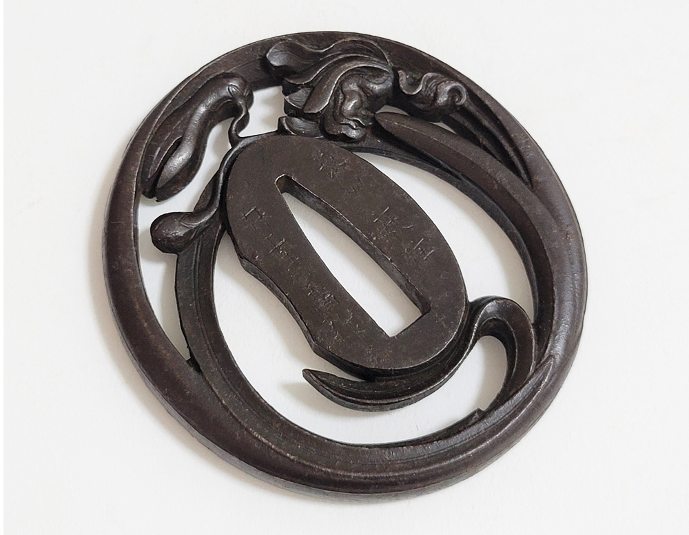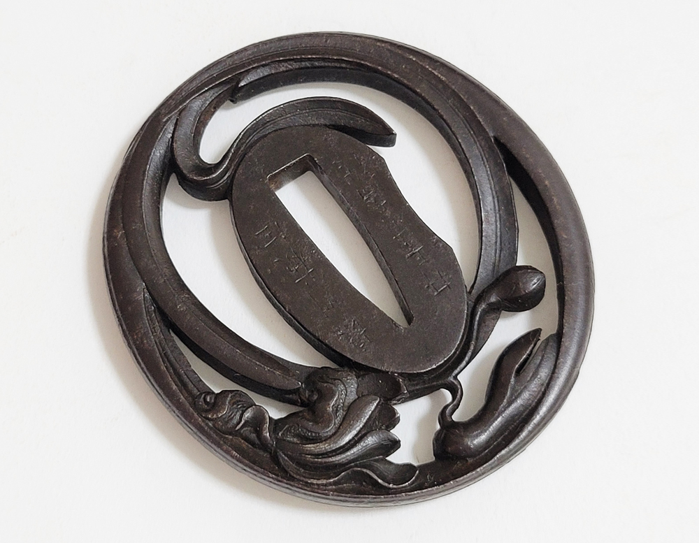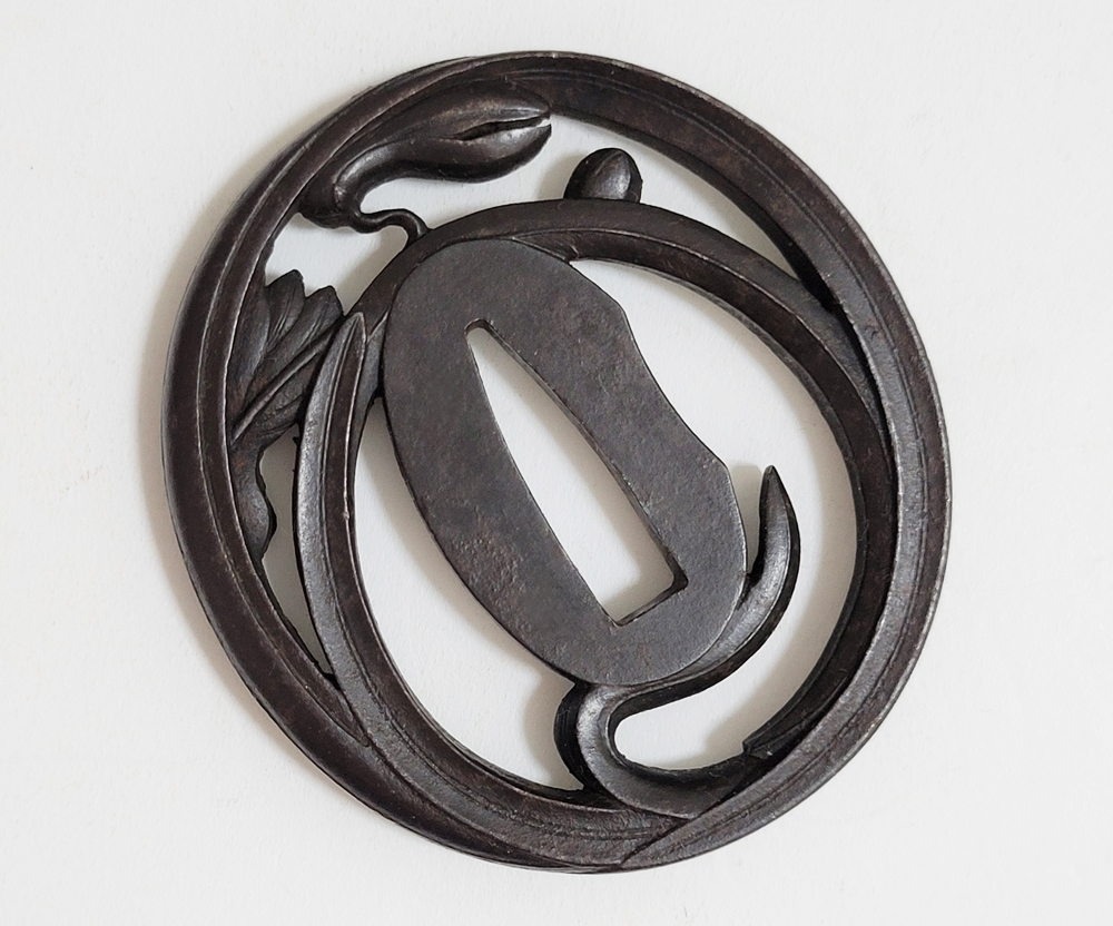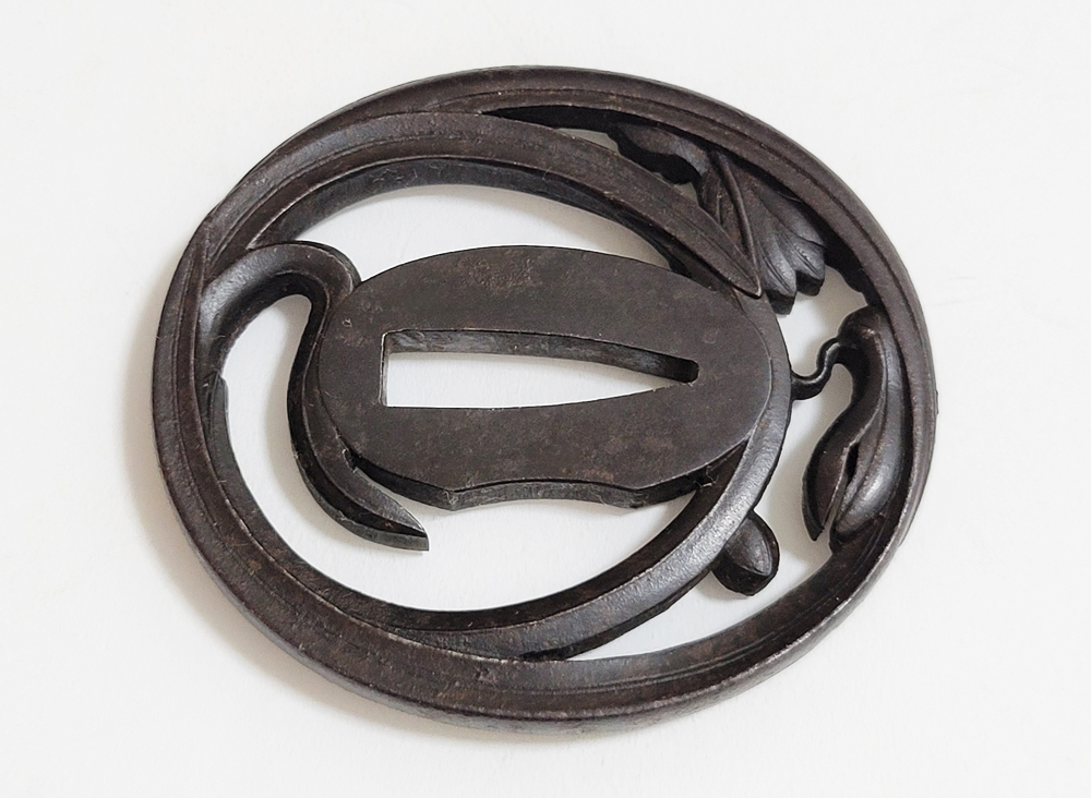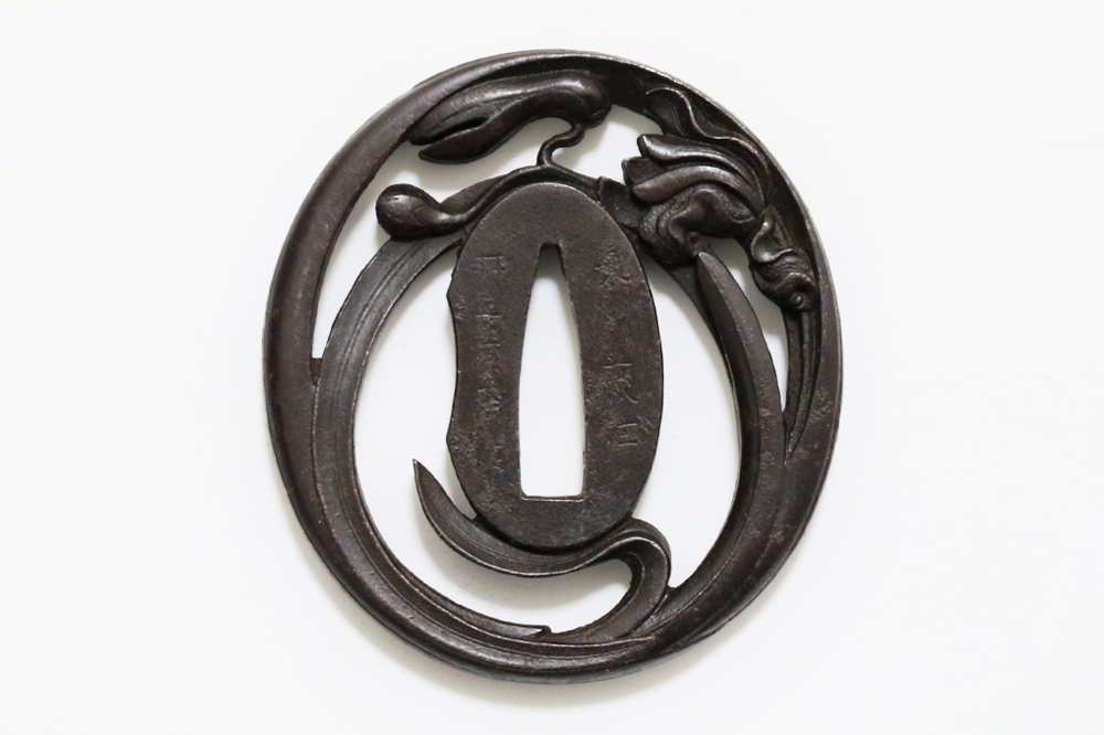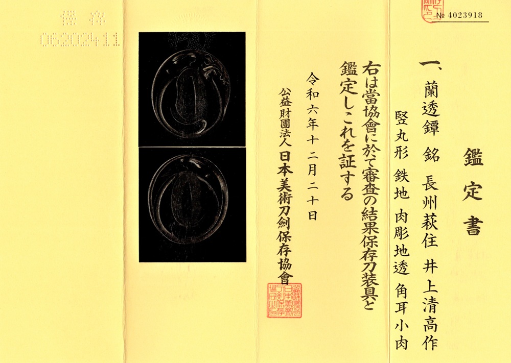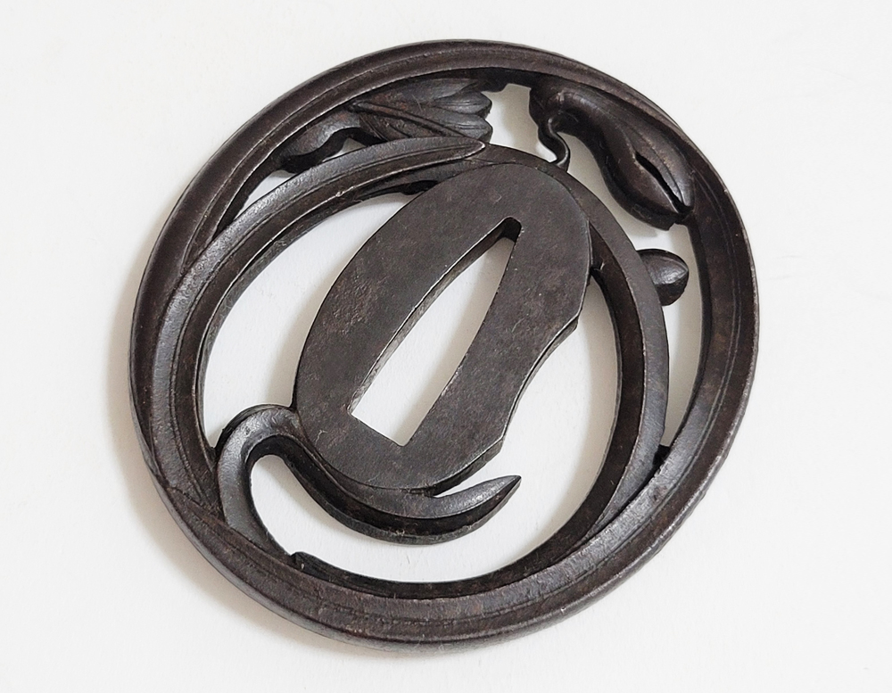 | Orchids are a favorite subject of literati, and along with plum, bamboo, and chrysanthemum, they are called as four noble flowers because of their beauty and elegance. The design of this tsuba is a popular, which depicts orchids with relief engraving and opework techniques. The artist, Inoue Kiyotaka [井上清高], is the first head of the Inoue family. He became a metal artisan for the Choshu domain in 1790. This is a sophisticated tsuba. It passed the Hozon Tosogu shinsa in 2024. |
