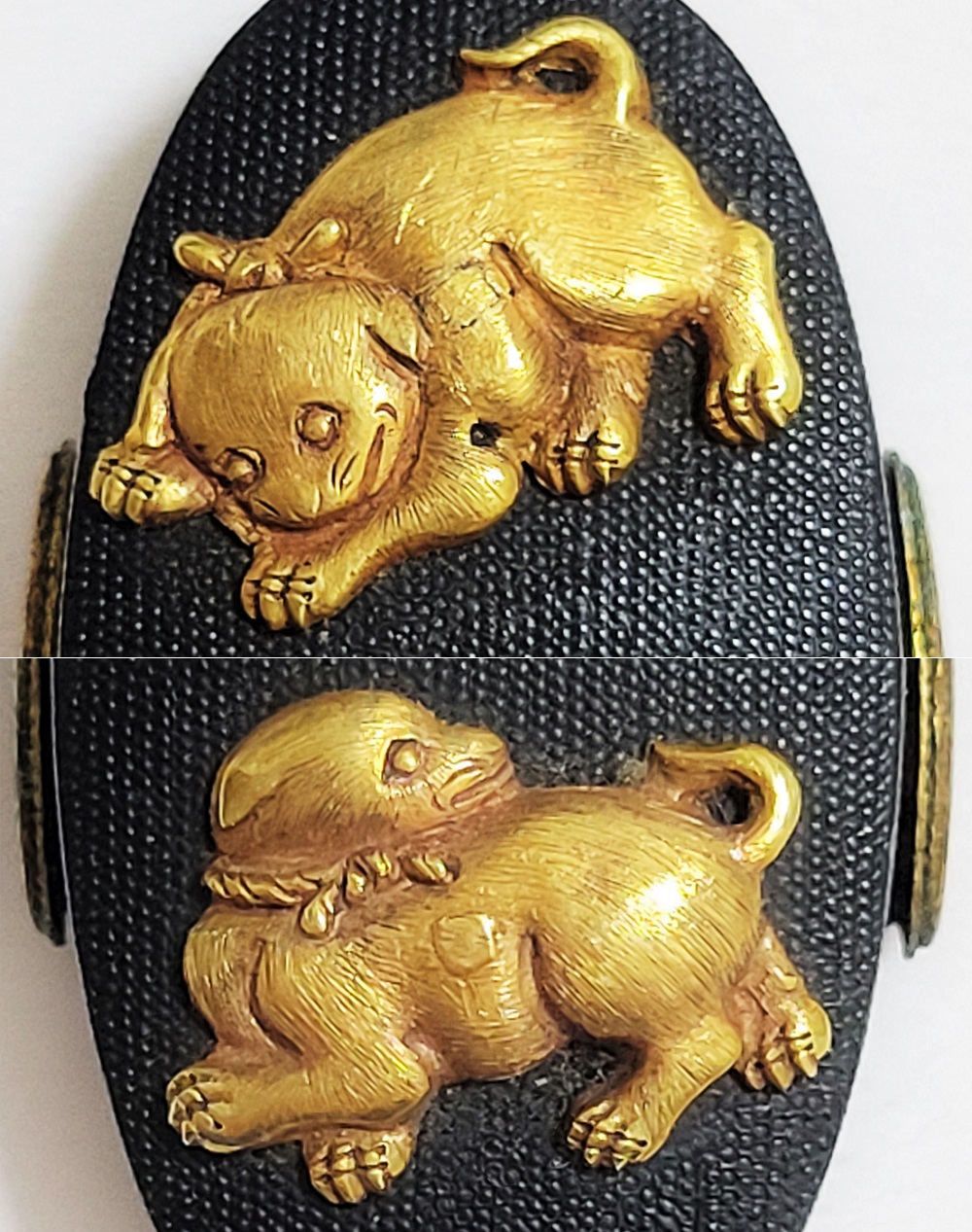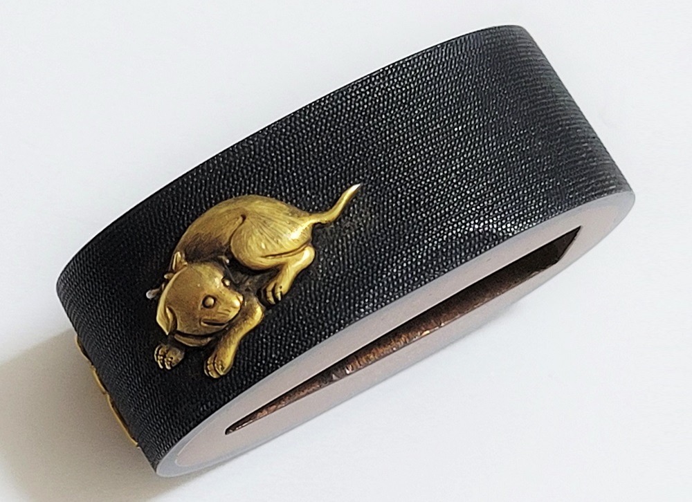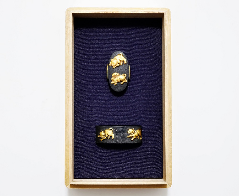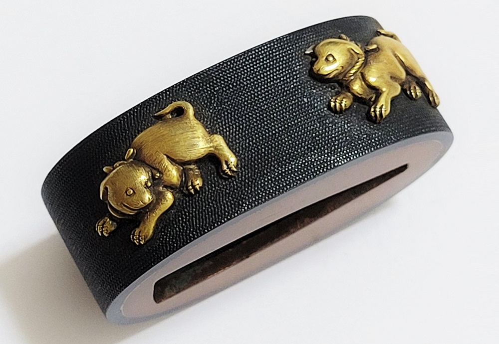 | 江戸時代、犬公方(いぬくぼう)と呼ばれた五代将軍徳川綱吉(1680年 - 1709年)の治世下では、江戸城で座敷犬、抱き犬として犬が大切にされた。本作は、愛らしい金の仔犬を据紋した仔犬図縁頭。金据紋の足が赤銅魚子地の裏側に貫通して留めがわかる希少品。赤銅地に魚子が微細に打たれ金紋の仔犬は動きがあり上手。2024年5月刀装具審査で京金工に極められて特別保存合格。 |