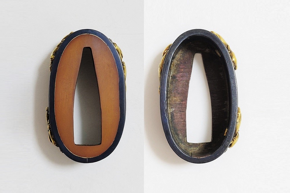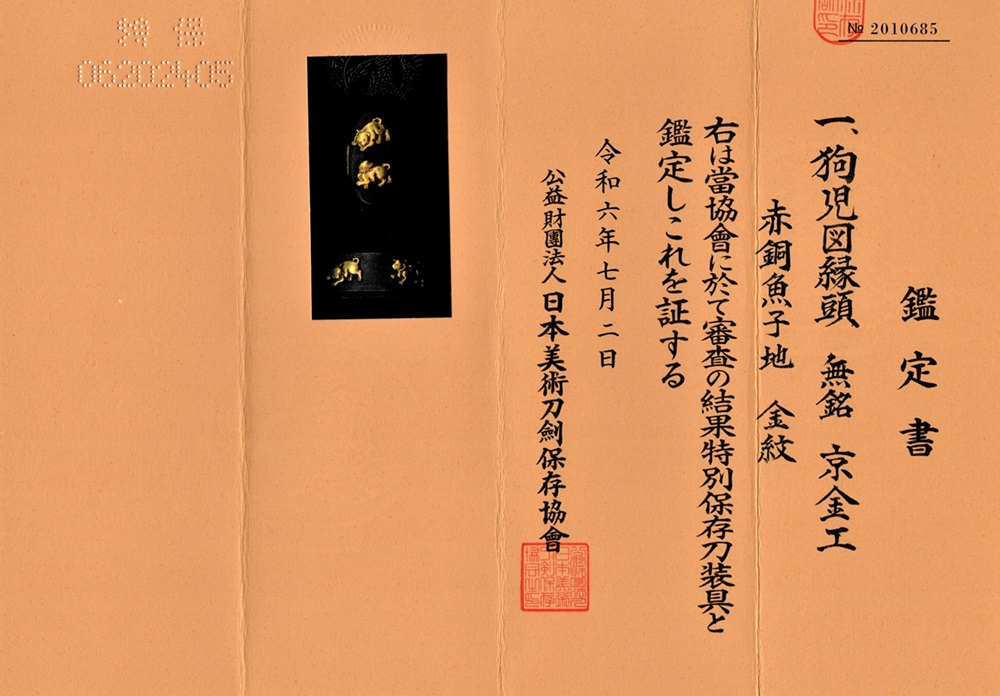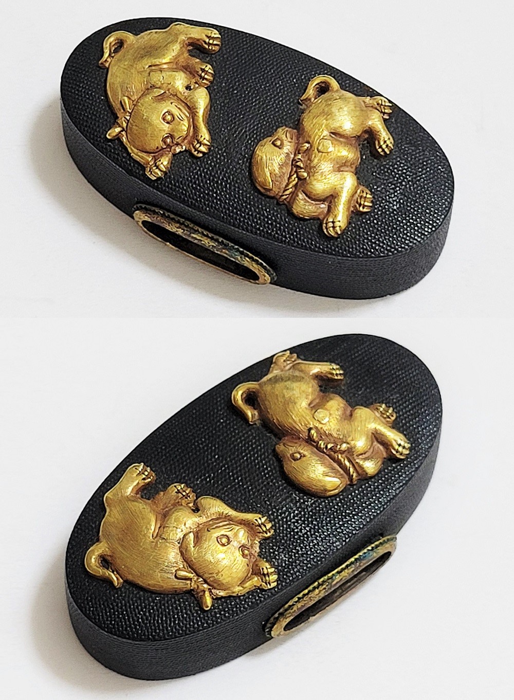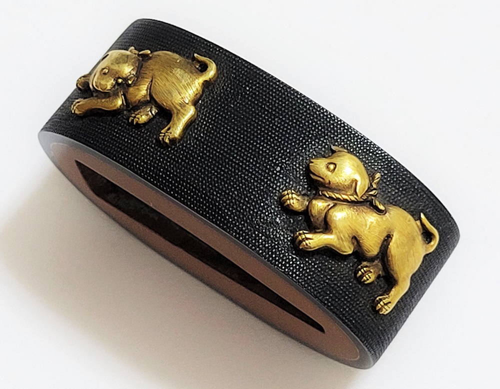 | 江戸時代、犬公方(いぬくぼう)と呼ばれた五代将軍徳川綱吉(1680年 - 1709年)の治世下では、江戸城で座敷犬、抱き犬として犬が大切にされた。本作は、愛らしい金の仔犬を据紋した仔犬図縁頭。金据紋の足が赤銅魚子地の裏側に貫通して留めがわかる希少品。赤銅地に魚子が微細に打たれ金紋の仔犬は動きがあり上手。2024年5月刀装具審査で京金工に極められて特別保存合格。 |