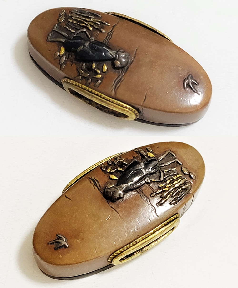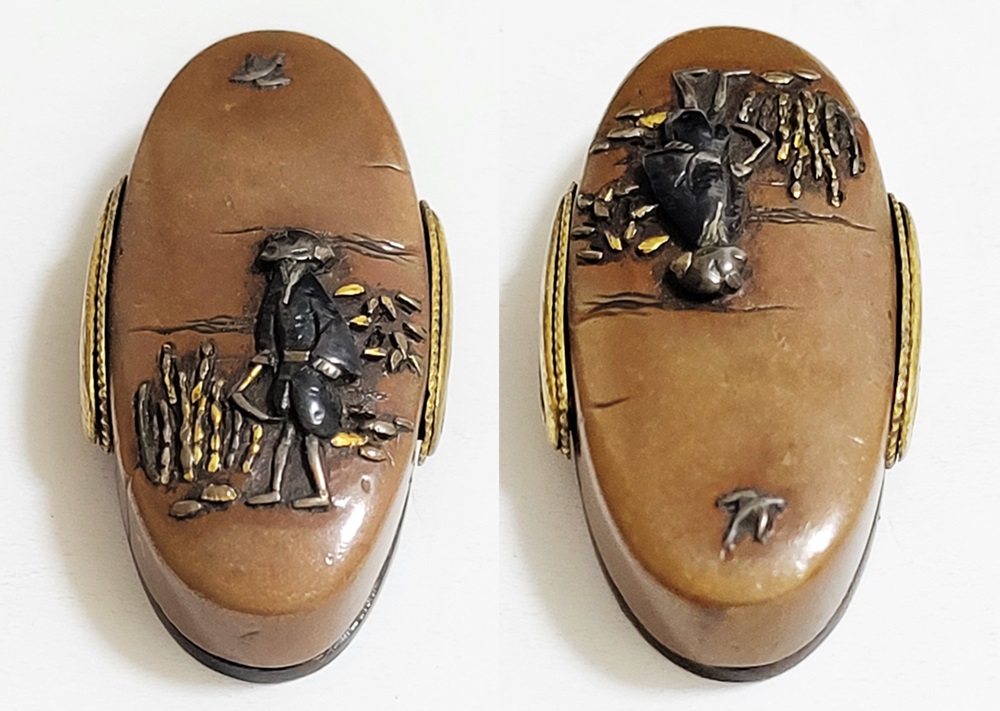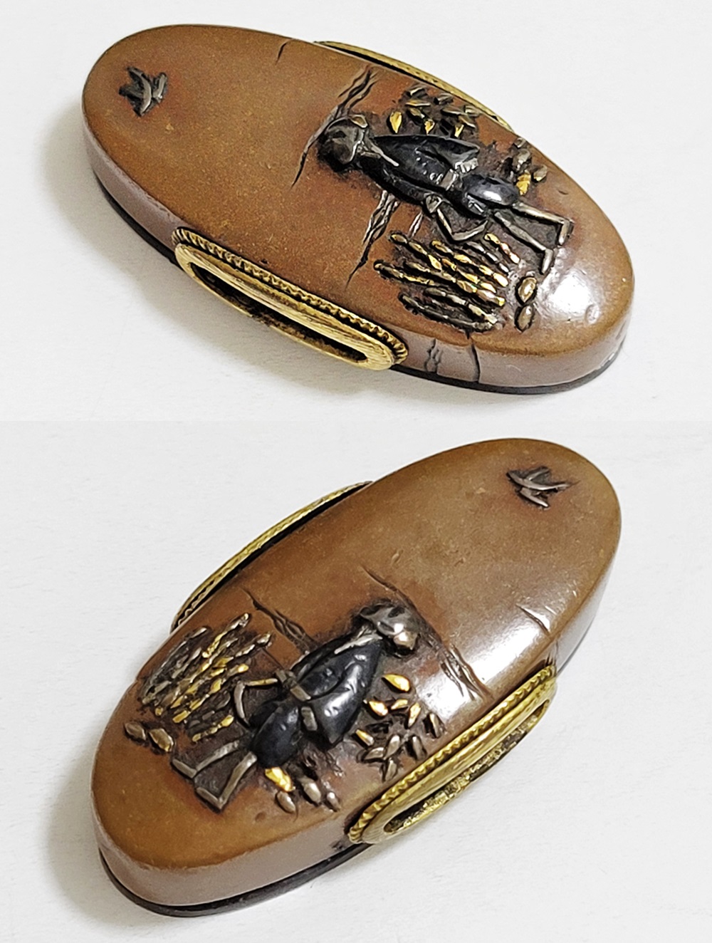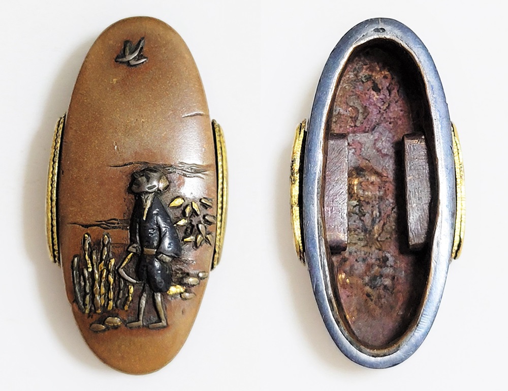 | 鎌を手にした仕事着姿の老人が天を仰ぎ、その足元に群生する木賊(とくさ)を配する画題は「木賊刈(とくさがり)」。古くは金家に始まり、安親が得意とした画題。木賊は水辺に生える植物で縦刻みの線があり、強靭で木など物を磨くことに使われた。「木賊刈」は、「謡曲木賊」で、子をさらわれひとり寂しく木賊を刈る老人が、往来の旅人に息子の消息を尋ね続けて年月が経ち、今日も息子の消息が分からずに日が暮れると天を仰いで一日の仕事を終えた疲れと虚無感が滲み出た場面。やがて老人は都から来て道に迷った若い僧に会うと、その僧が我が息子とわかり父子再会、喜びの物語りとなる。本作は、無銘木賊刈図縁頭。 |