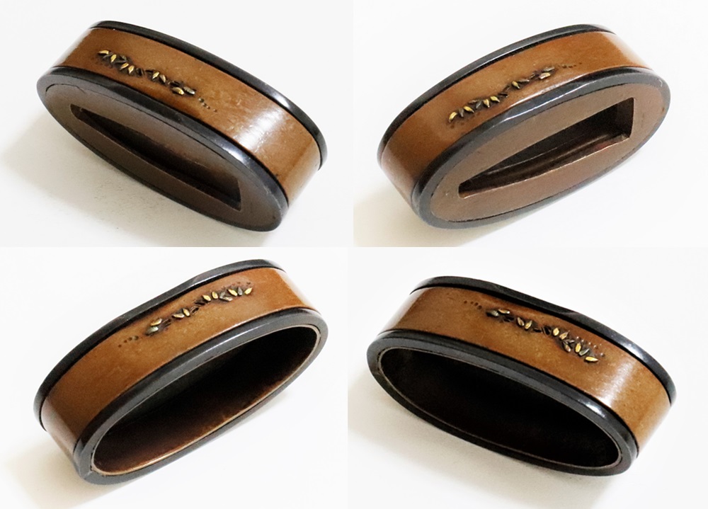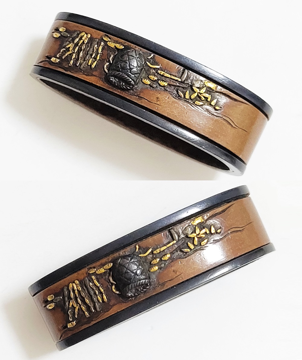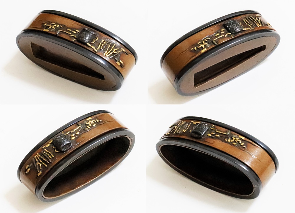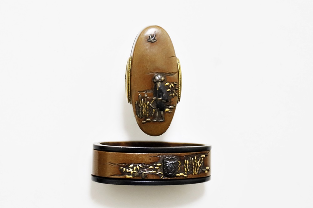 | 鎌を手にした仕事着姿の老人が天を仰ぎ、その足元に群生する木賊(とくさ)を配する画題は「木賊刈(とくさがり)」。古くは金家に始まり、安親が得意とした画題。木賊は水辺に生える植物で縦刻みの線があり、強靭で木など物を磨くことに使われた。「木賊刈」は、「謡曲木賊」で、子をさらわれひとり寂しく木賊を刈る老人が、往来の旅人に息子の消息を尋ね続けて年月が経ち、今日も息子の消息が分からずに日が暮れると天を仰いで一日の仕事を終えた疲れと虚無感が滲み出た場面。やがて老人は都から来て道に迷った若い僧に会うと、その僧が我が息子とわかり父子再会、喜びの物語りとなる。本作は、無銘木賊刈図縁頭。 |