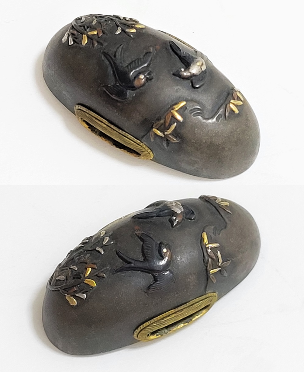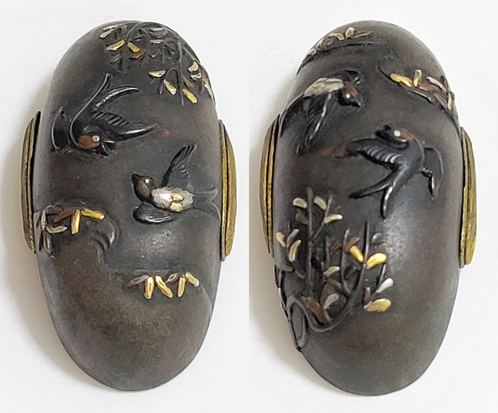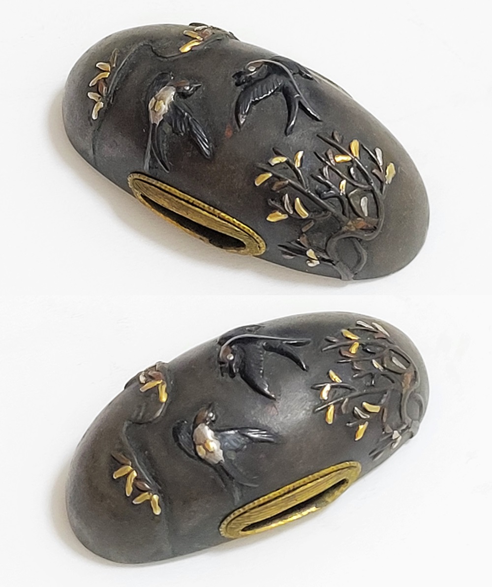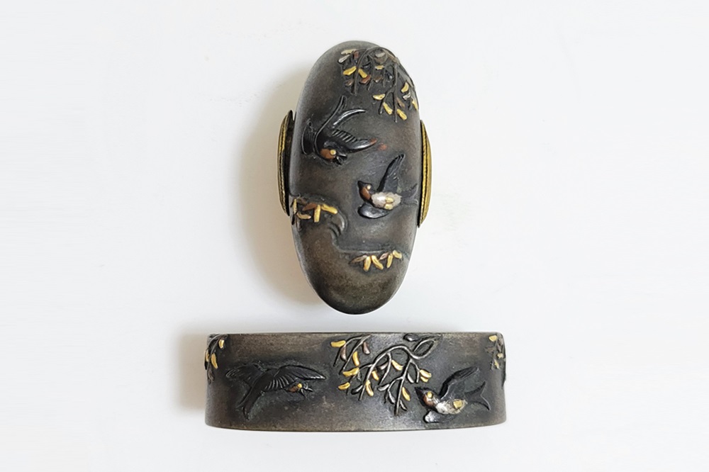 柳は春の訪れを告げ古くから愛され日本の風景や文化に深く根付いた植物。燕は農作物を生育する3月中旬ごろから南方より日本に渡って来る夏鳥。害虫を沢山食べることから人にとって益鳥とされ、燕が巣を作ることでその年は豊作になると言われ、商売繁盛や幸運の象徴として大切にされた。本作は柳の傍を飛行する番の燕図。初夏の情景をあらわす図。