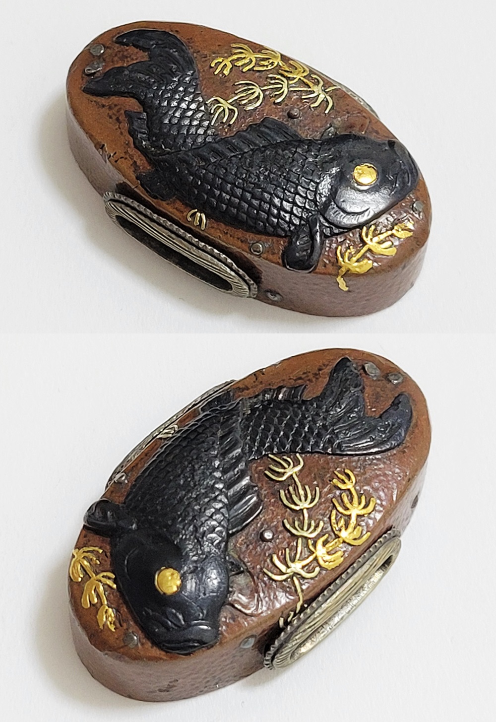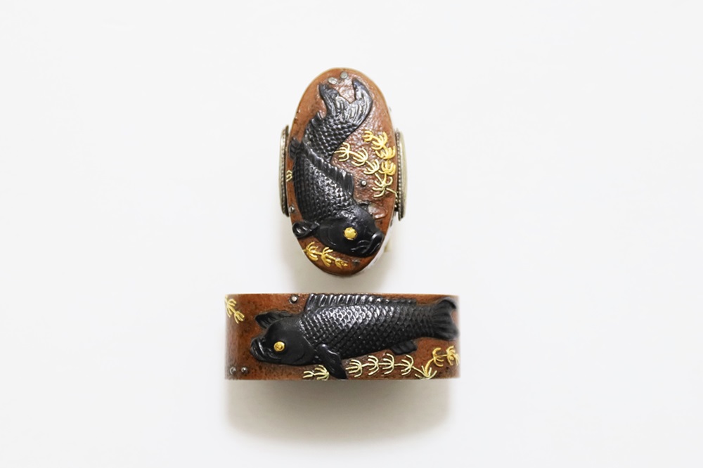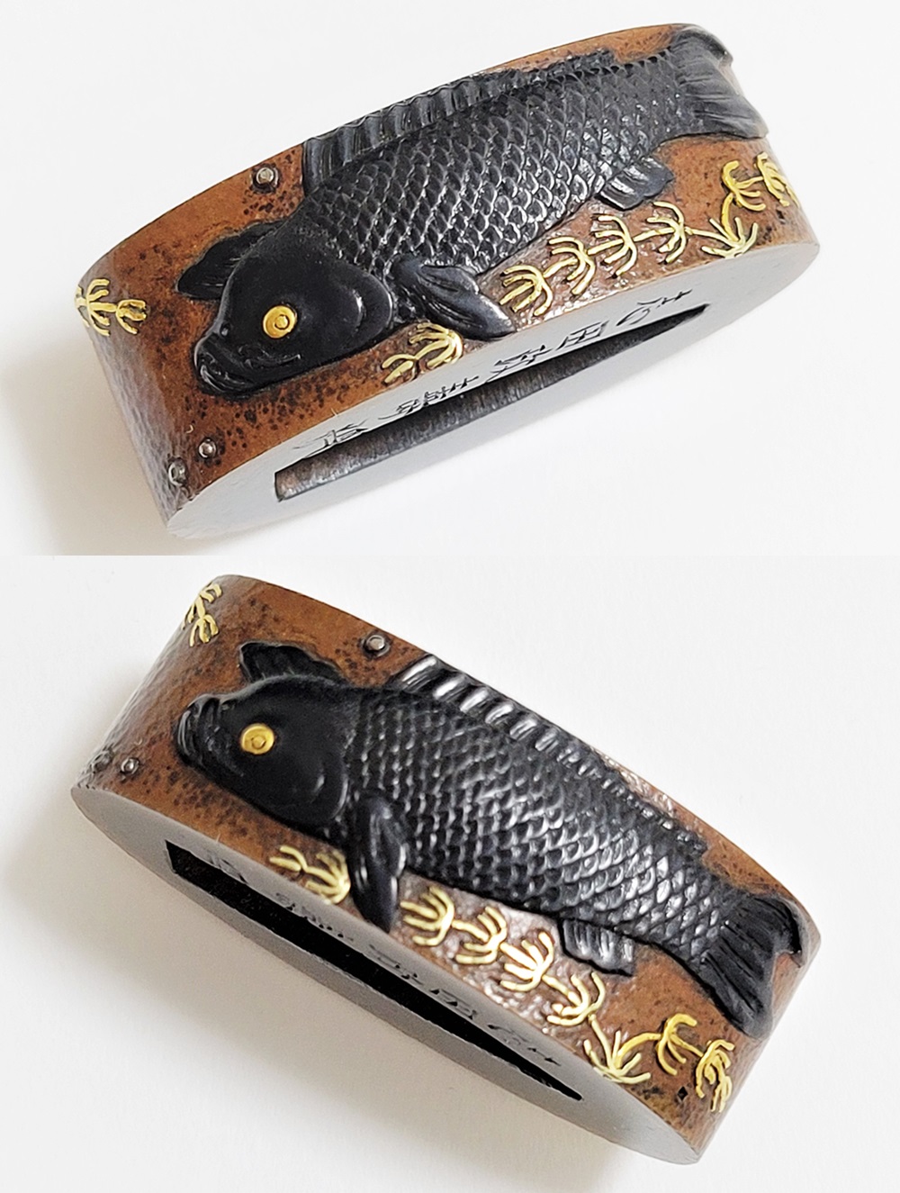 | 藻鯉図は吉兆図。鯉は普段深みに棲むが春から夏の一時期産卵のため川藻の浅瀬にあらわれる。それを古人は「藻出鯉(もいでこい)」として愛でた。あまり見る事のない川魚の長である鯉をみる目出度い徴(しるし)であり、産卵は子孫繁栄の吉祥事。本作は、素銅磨地に雄渾な藻出鯉をあらわす縁頭。作者の志田政寿は江戸後期の金工であろう。2019年特別保存刀装具審査合格。 |
