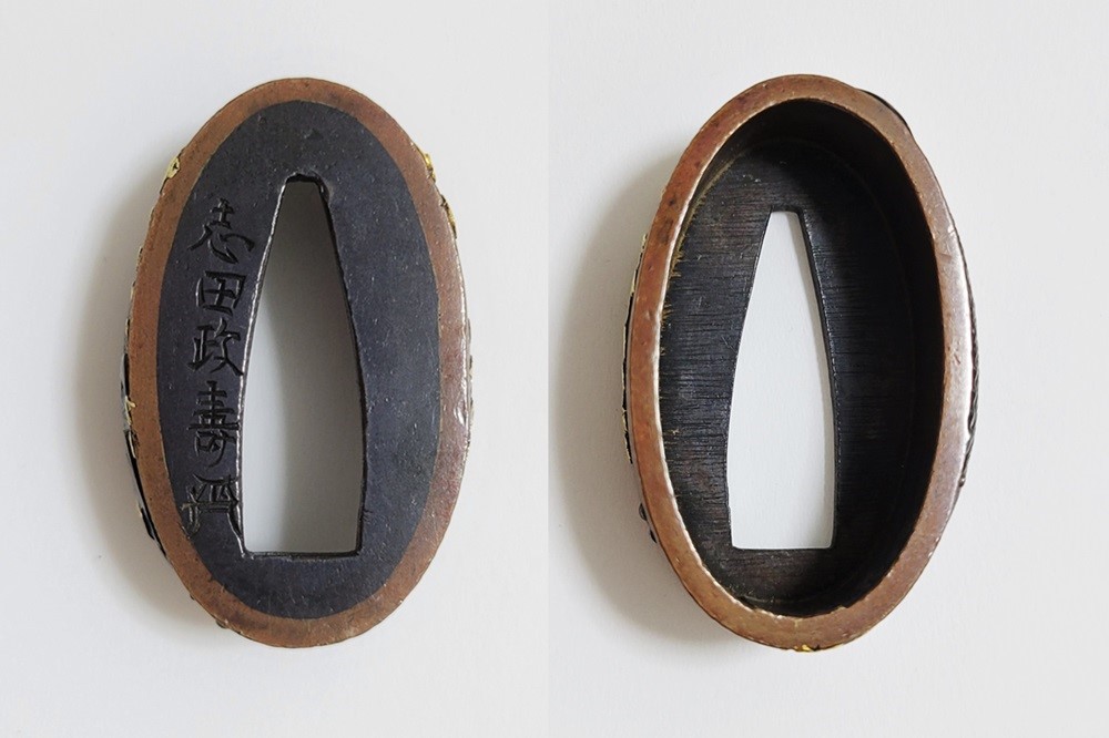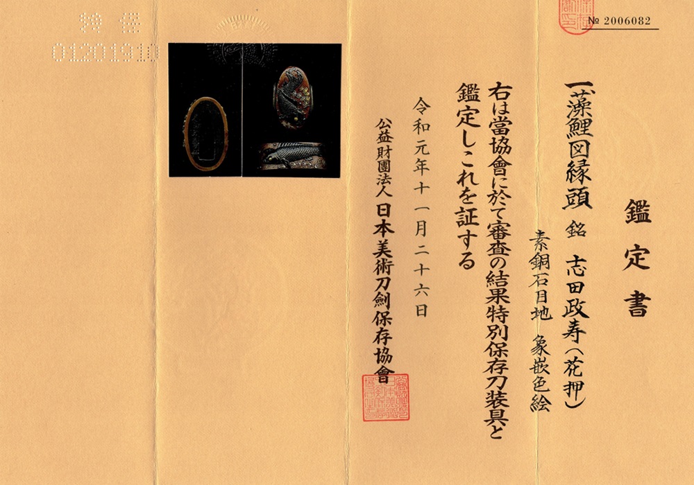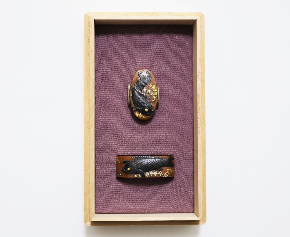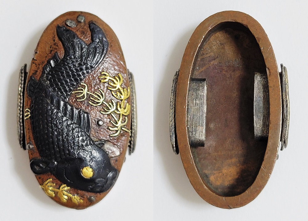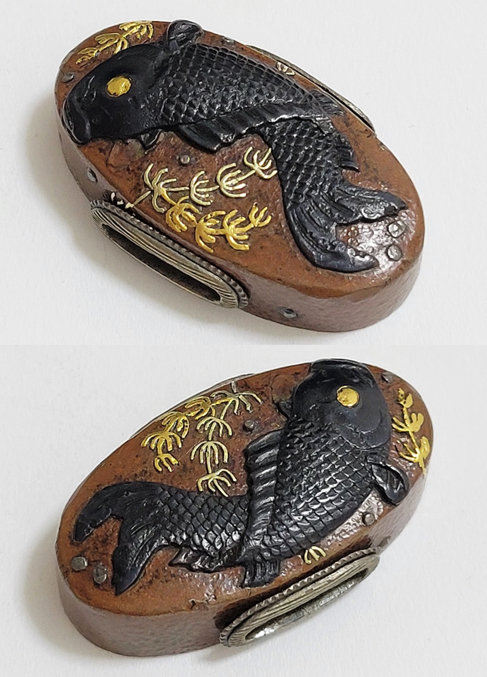 | 藻鯉図は吉兆図。鯉は普段深みに棲むが春から夏の一時期産卵のため川藻の浅瀬にあらわれる。それを古人は「藻出鯉(もいでこい)」として愛でた。あまり見る事のない川魚の長である鯉をみる目出度い徴(しるし)であり、産卵は子孫繁栄の吉祥事。本作は、素銅磨地に雄渾な藻出鯉をあらわす縁頭。作者の志田政寿は江戸後期の金工であろう。2019年特別保存刀装具審査合格。 |