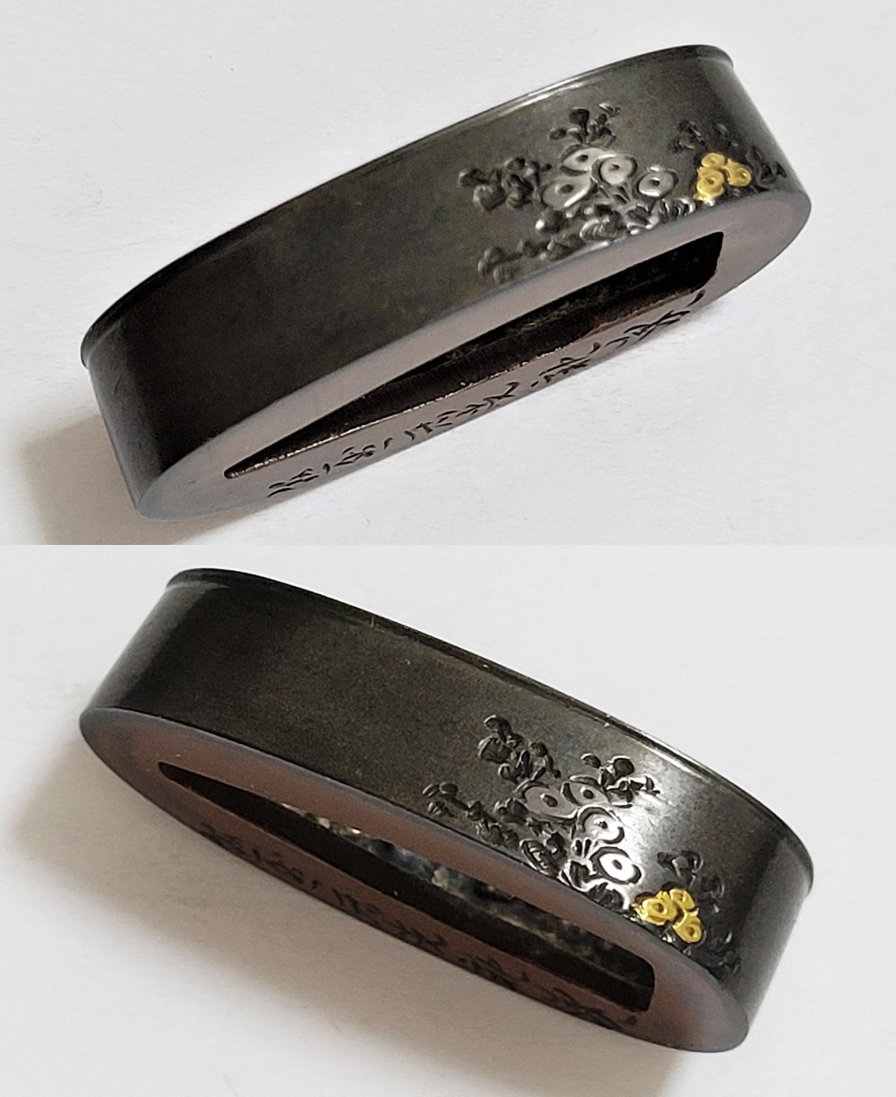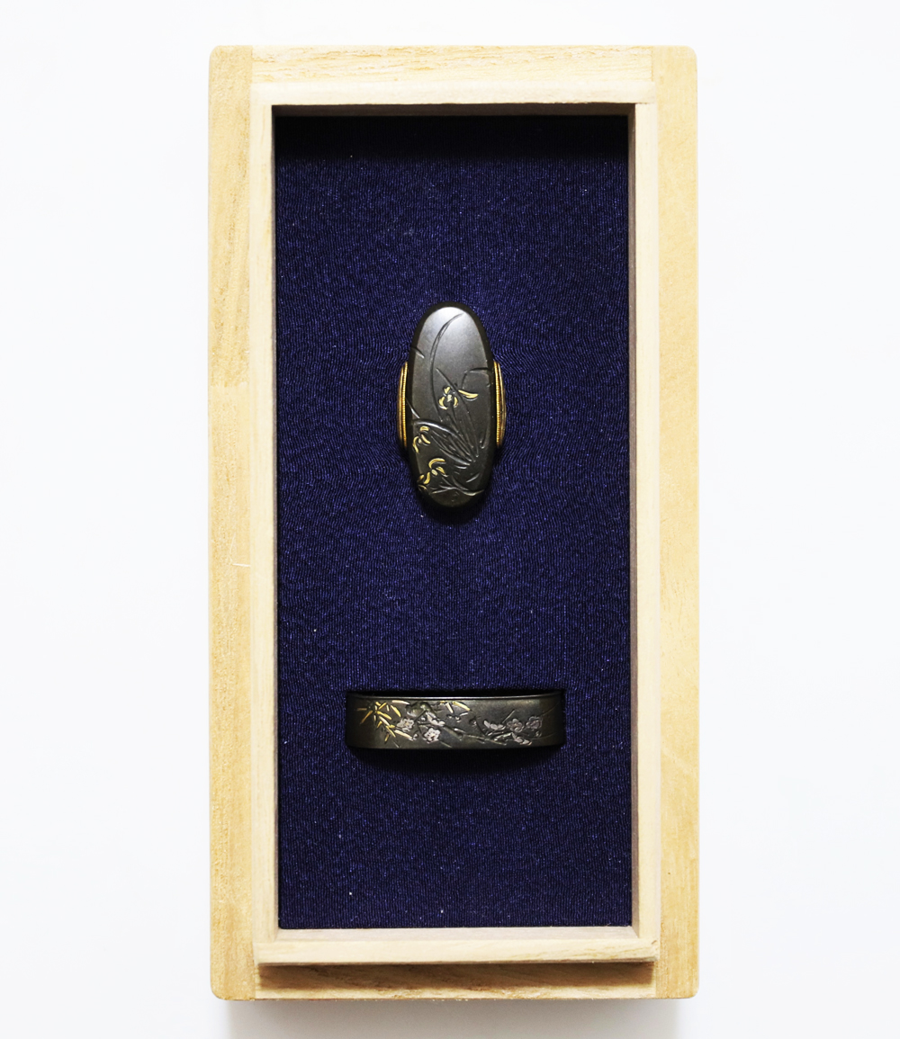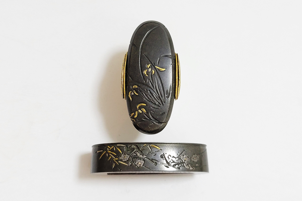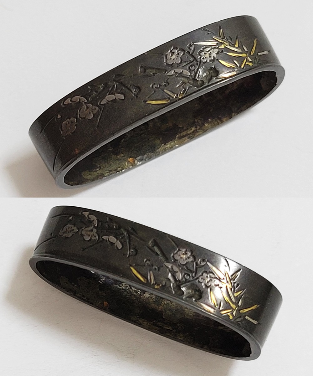 | 四君子は高潔な美しさを持つ梅、菊、蘭、竹の四つの植物を組み合わせた文様。君子の持つ高潔な資質とみなされ古来吉祥文様として好んで用いられた。作者の悠然居光親は鷲田氏。鷲田二代光時の子で父に学ぶ。鷲田派の最後を飾る上手。明治35年(1902)79歳没。庄内鶴岡住。本作は甲鋤毛彫に金銀平象嵌で四君子をあらわす。洗練された意匠。2015年保存刀装具審査合格。 |