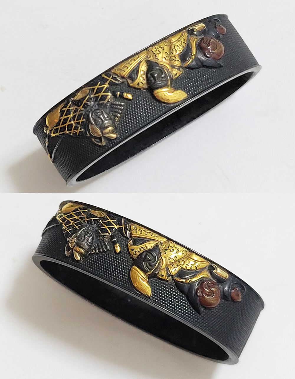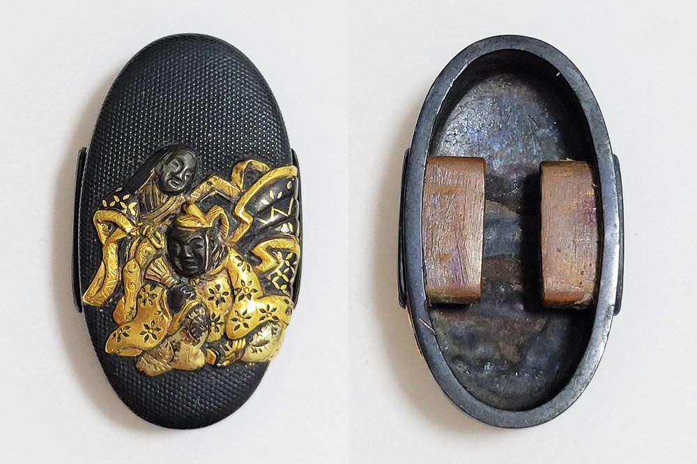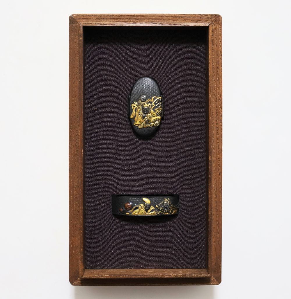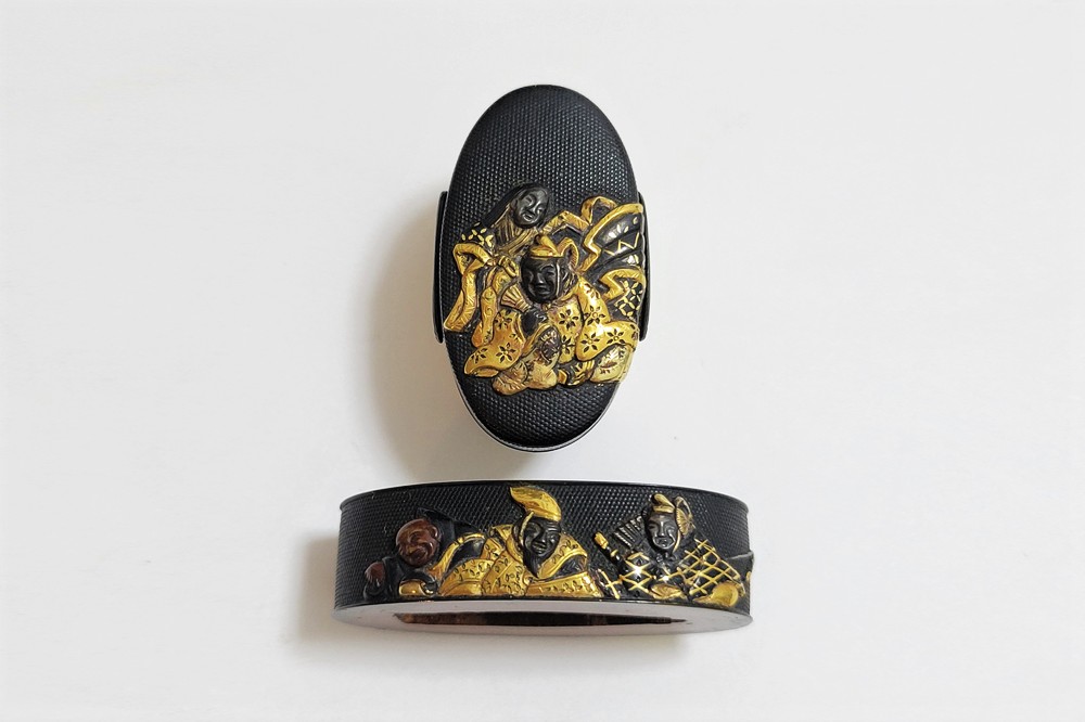 | 六歌仙とは、平安時代に編纂された古今和歌集の仮名序において紀貫之が挙げた六人の歌人のこと。そこには「近き世にその名聞こえたる人」として僧正遍昭 (そうじょうへんじょう)・在原業平 (ありひらのなりひら)・文屋康秀 (ぶんやのやすひで)・喜撰法師 (きせんほうし)・小野小町 (おののこまち)・大伴黒主 (おおとものくろぬし)の六人が紹介されている。本作縁頭には縁に4人(左から喜撰法師、文屋康秀、大伴黒主、僧正遍照)、頭に2人(小野小町、在原業平)が描かれている。平安時代の煌びやかな衣装を纏った六歌仙縁頭。 |