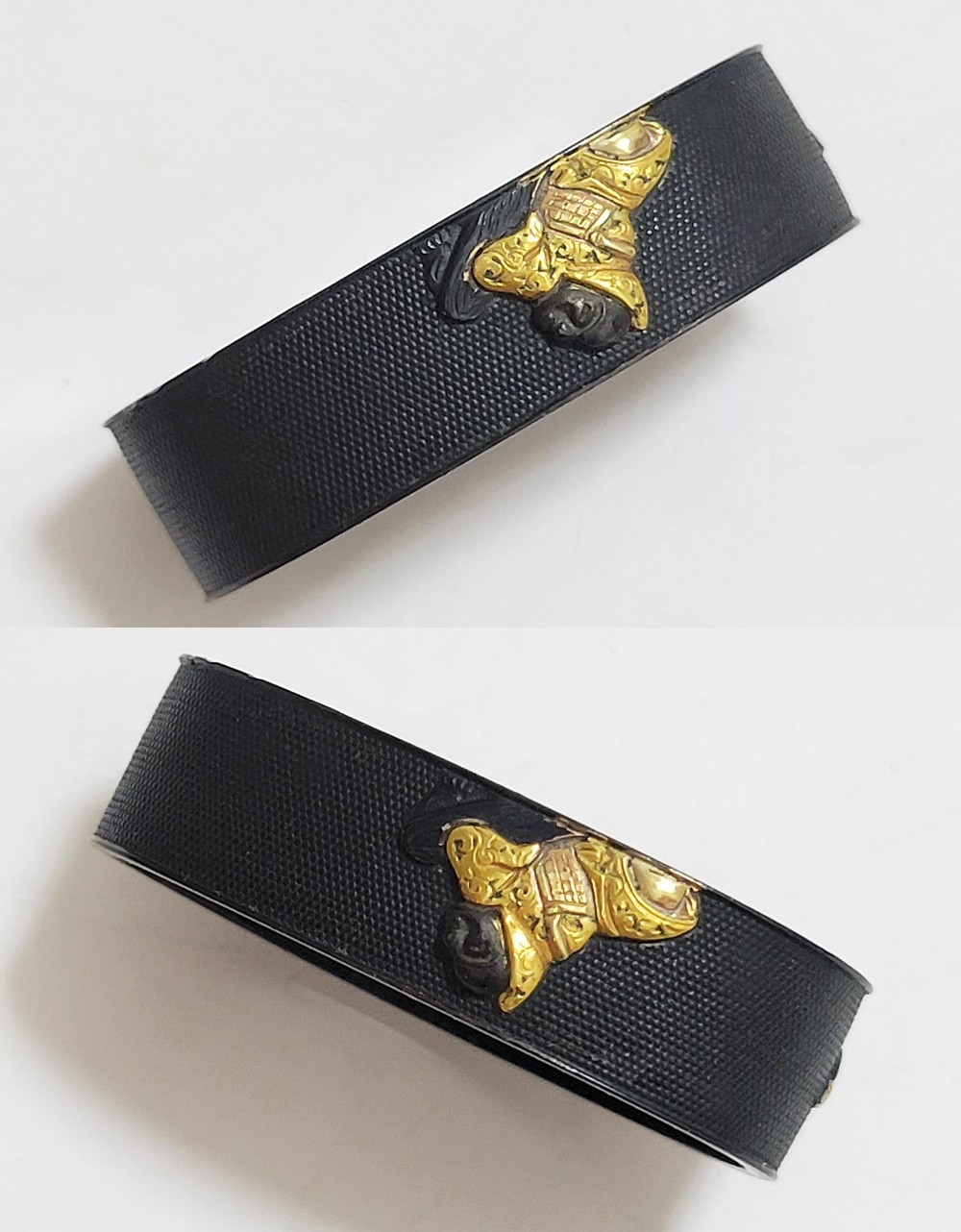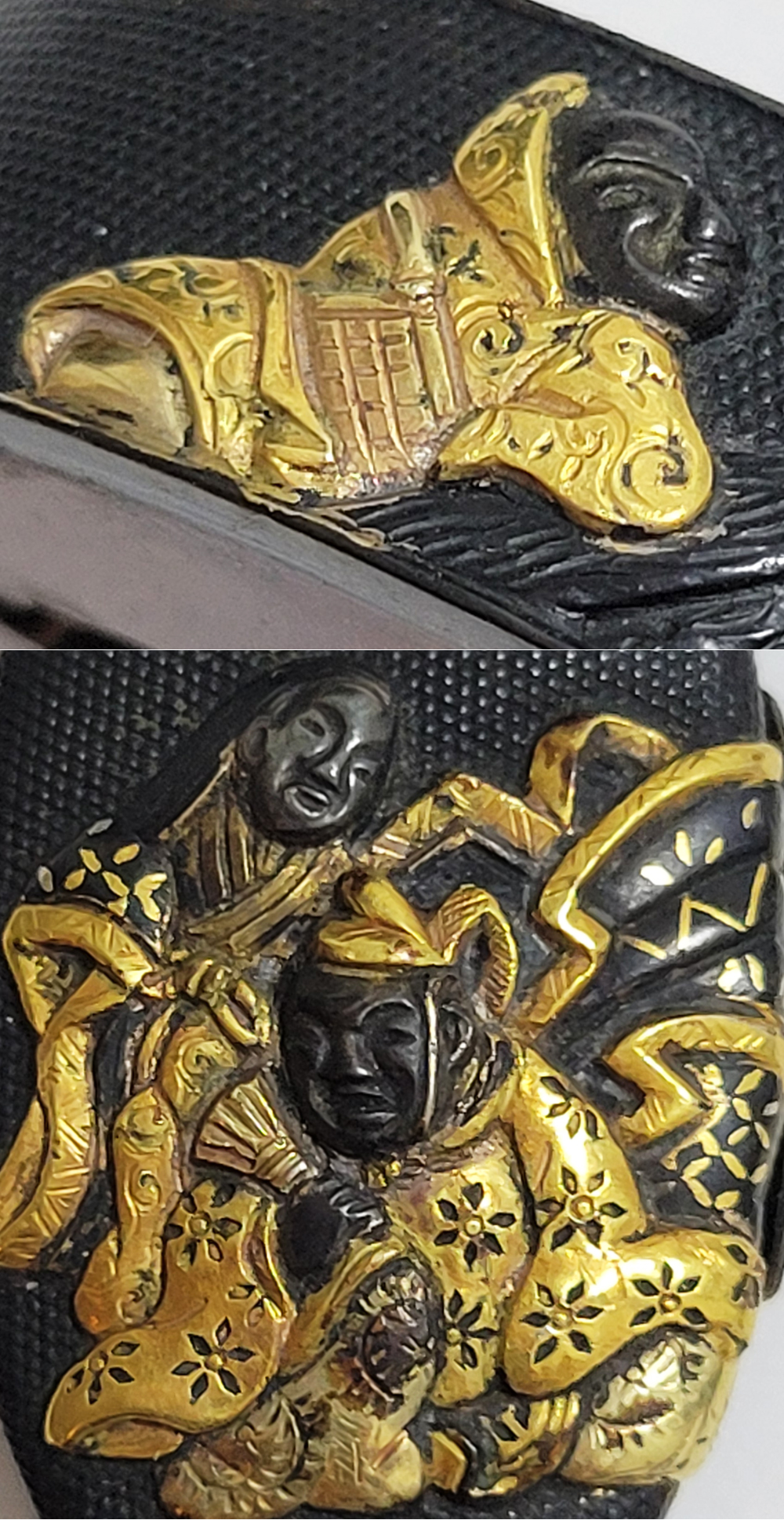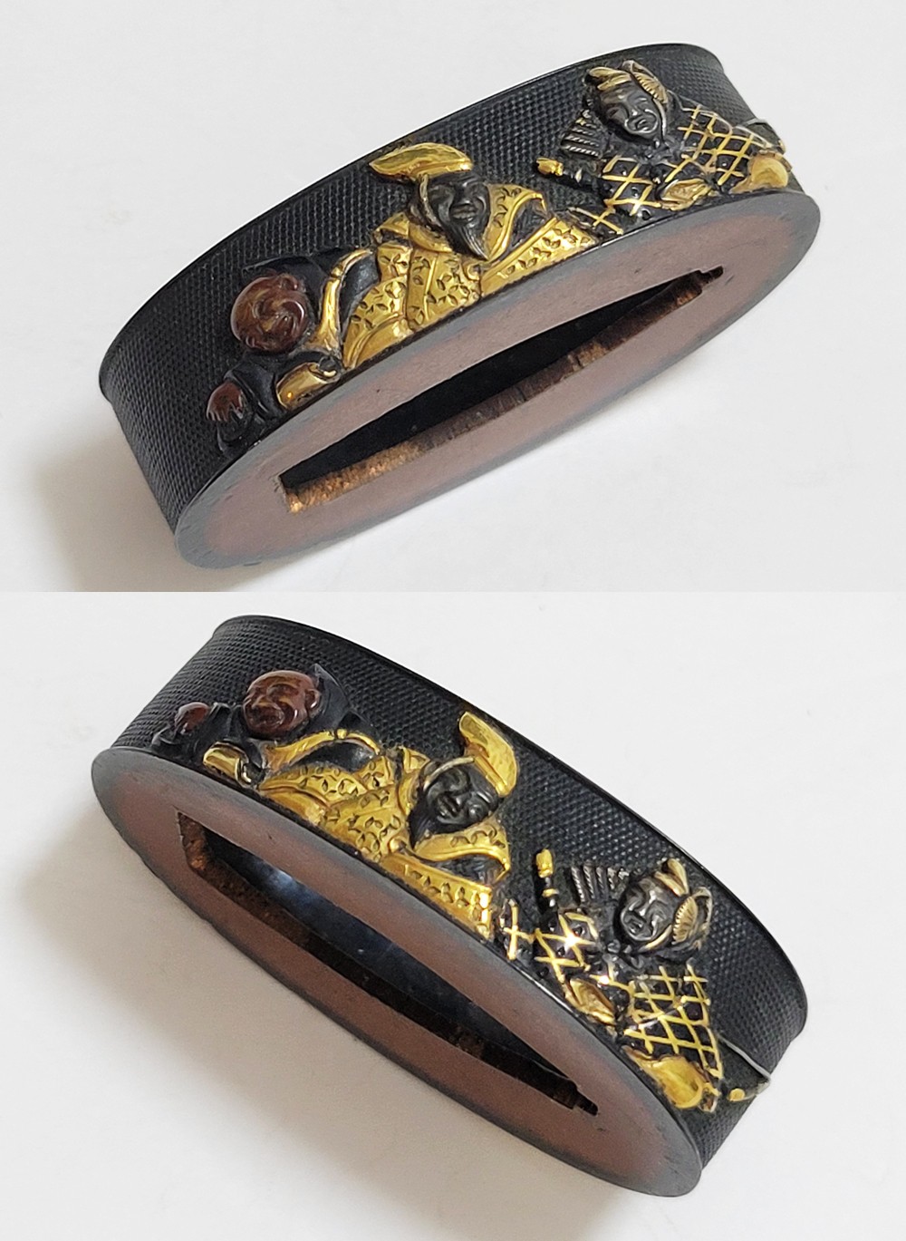| 六歌仙とは、平安時代に編纂された古今和歌集の仮名序において紀貫之が挙げた六人の歌人のこと。そこには「近き世にその名聞こえたる人」として僧正遍昭 (そうじょうへんじょう)・在原業平 (ありひらのなりひら)・文屋康秀 (ぶんやのやすひで)・喜撰法師 (きせんほうし)・小野小町 (おののこまち)・大伴黒主 (おおとものくろぬし)の六人が紹介されている。本作縁頭には縁に4人(左から喜撰法師、文屋康秀、大伴黒主、僧正遍照)、頭に2人(小野小町、在原業平)が描かれている。平安時代の煌びやかな衣装を纏った六歌仙縁頭。 |