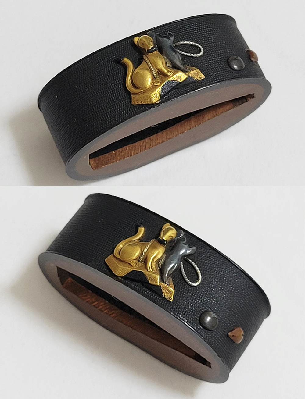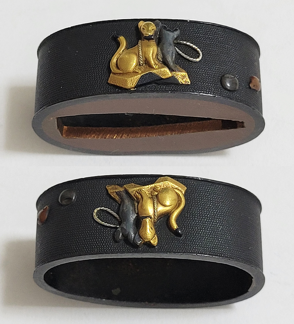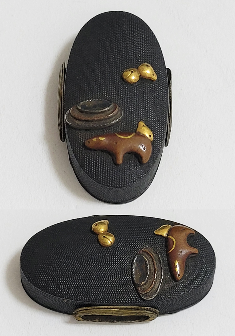 無銘ながら大月派に極められた縁頭。大月派は名工四代大月光興によって大いに隆盛した江戸後期、京都の一門。精巧で堅実な彫法で奇抜、禅味のある作風を遺す。本作は、鉄砲狐、張り子人形、貝合わせ、鈴であろうか。江戸時代の玩具を赤銅魚子地に高彫象嵌色絵であらわす。出来が良い。2024年保存刀装具審査合格。