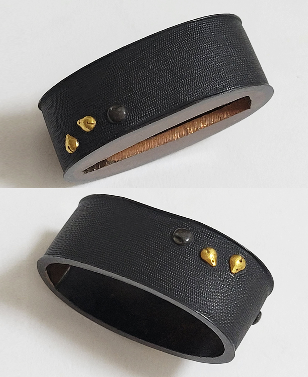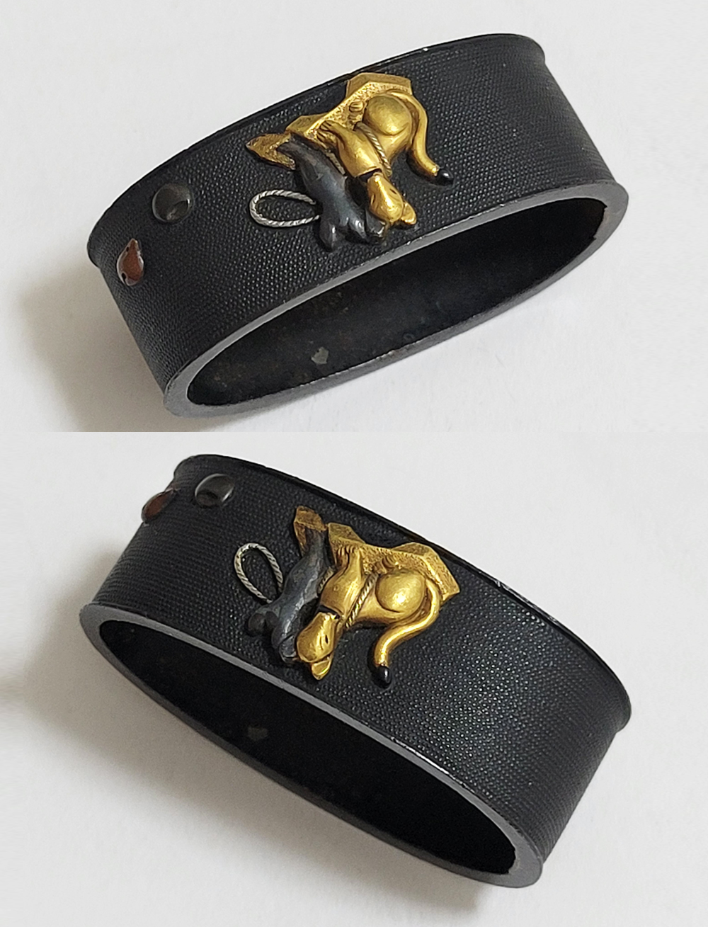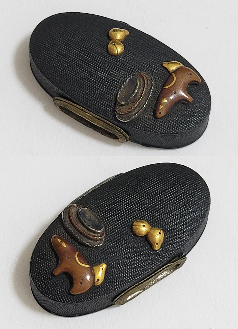 無銘ながら大月派に極められた縁頭。大月派は名工四代大月光興によって大いに隆盛した江戸後期、京都の一門。精巧で堅実な彫法で奇抜、禅味のある作風を遺す。本作は、鉄砲狐、張り子人形、貝合わせ、鈴であろうか。江戸時代の玩具を赤銅魚子地に高彫象嵌色絵であらわす。出来が良い。2024年保存刀装具審査合格。