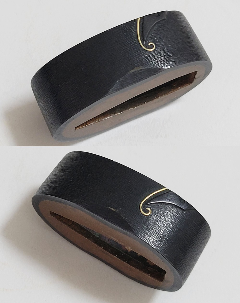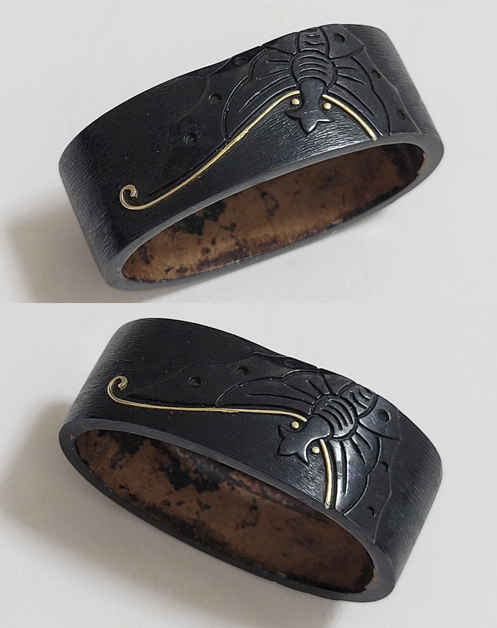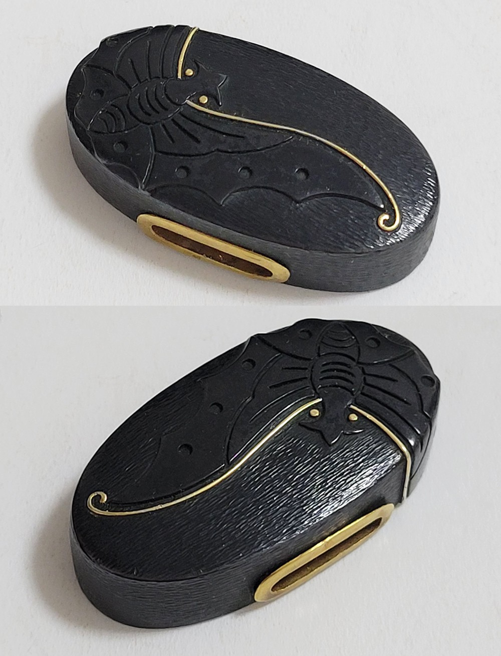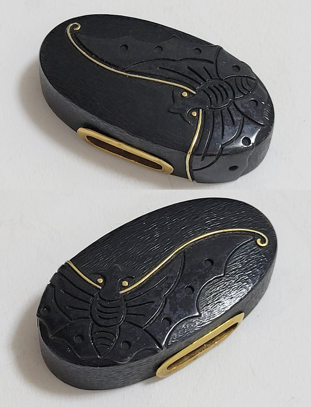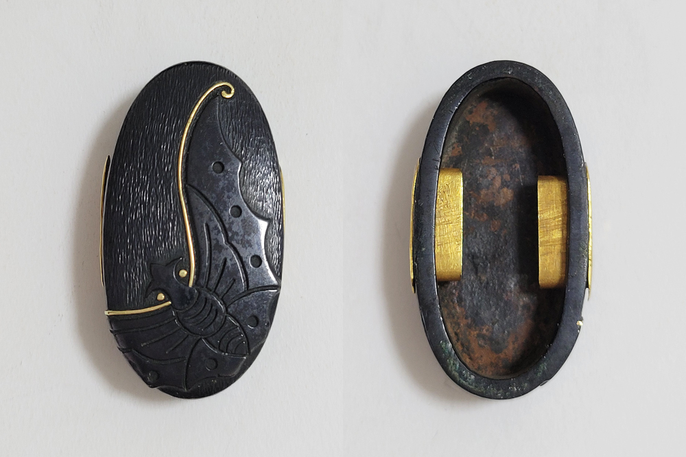 | 本作は村上派と極められた蝶図縁頭。村上派の代表工村上如竹は師伝が明確ではないが、鐙(あぶみ)象嵌師から転じて著名な金工になったと伝わる。高彫の据紋象嵌が多く彫刻は精巧。風格ある作を遺す。子弟みな如某と名のり如竹一派として愛好され、独自の縮緬石目地に蝶や蜻蛉、魚類などをあらわす。本作は赤銅の色よく如竹一門得意の図。2025年2月刀装具審査で保存合格。 |