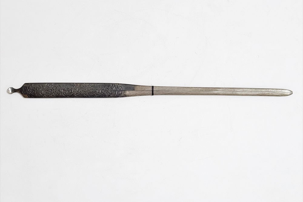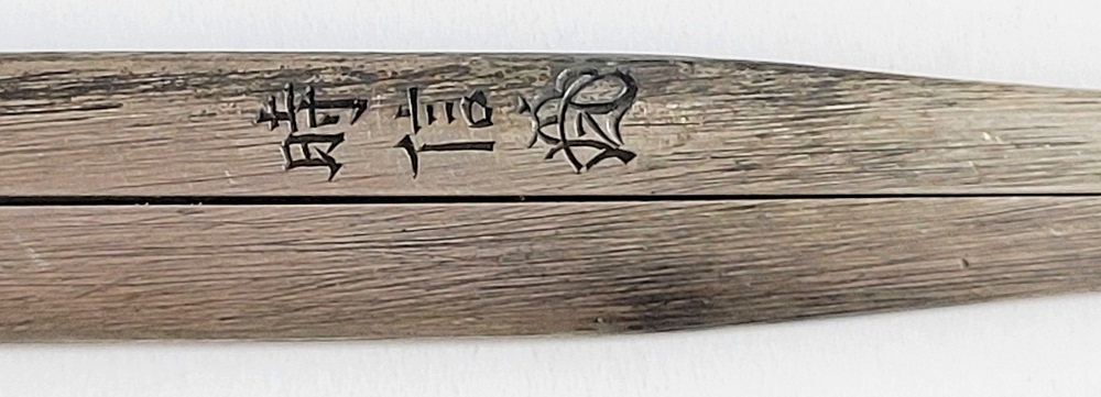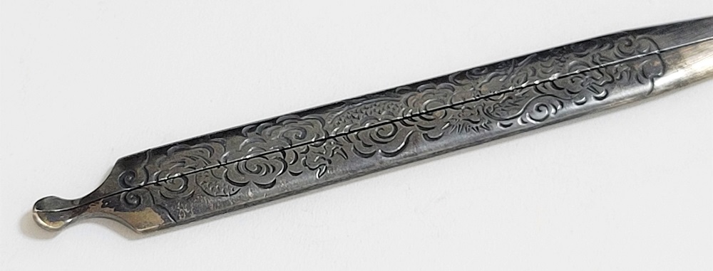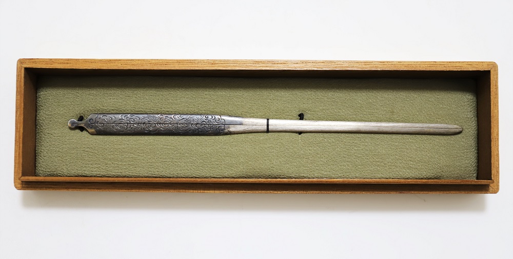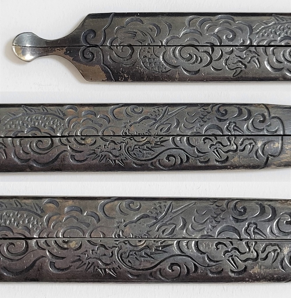 | 時信は佐野氏。柳川直時の門人で、のちに佐野直照の養子となる。文政十一年(1828)生まれ、明治十二年(1879)52歳没。江戸住。本作は片切彫で地板全面に雲龍図を描いた銀地割笄。銀の変色が時代を伝えている。保存刀装具。 |