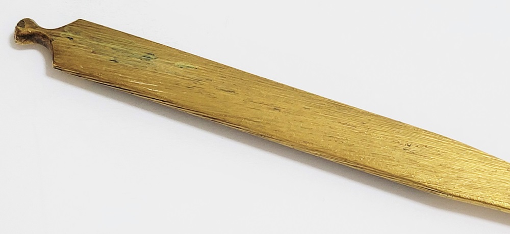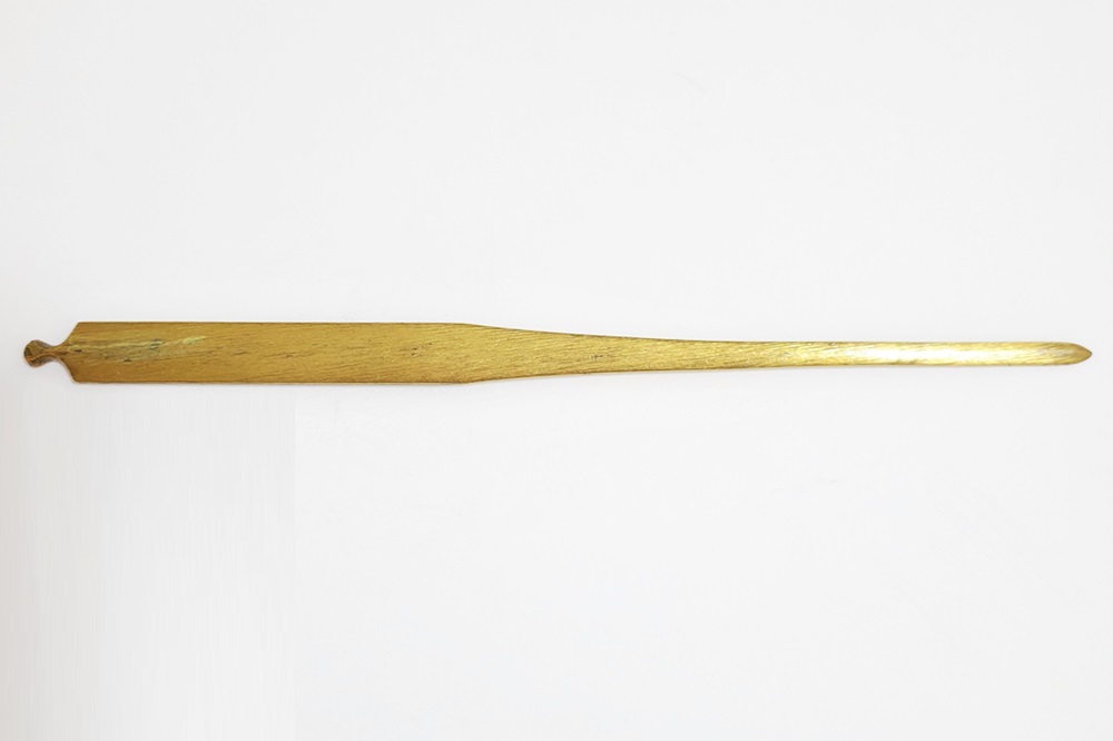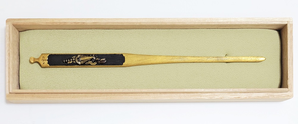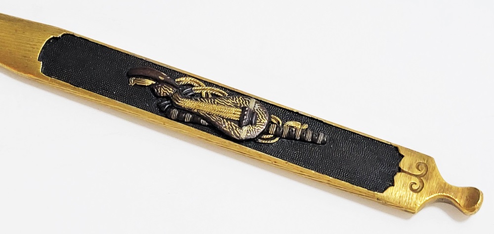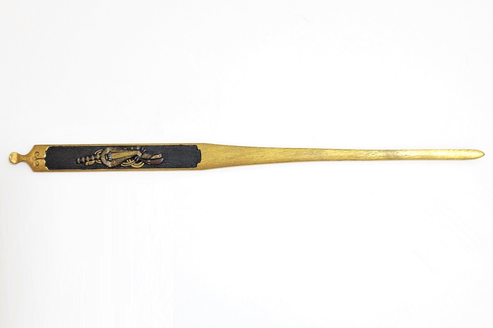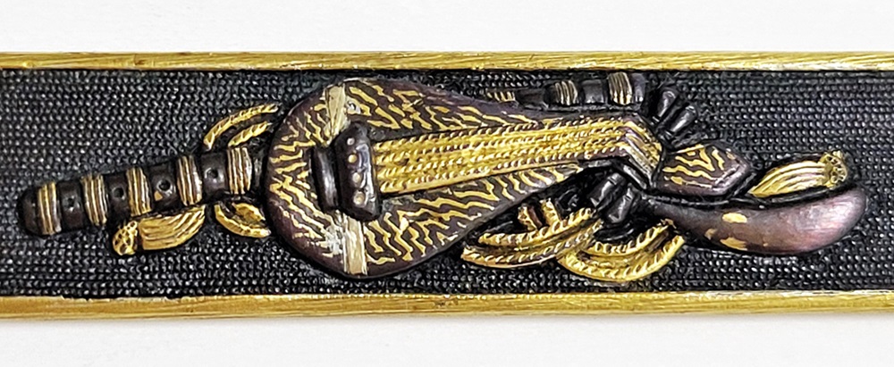 | 雅楽は奈良・平安時代から宮廷、寺社仏閣で盛んに演奏されてきた日本の古典音楽。本作は雅楽器の琵琶と竜笛を繊細優美にあらわす。金を多用した華麗な作から加賀金工とおもわれる。 |