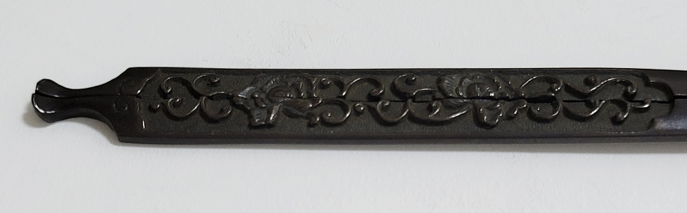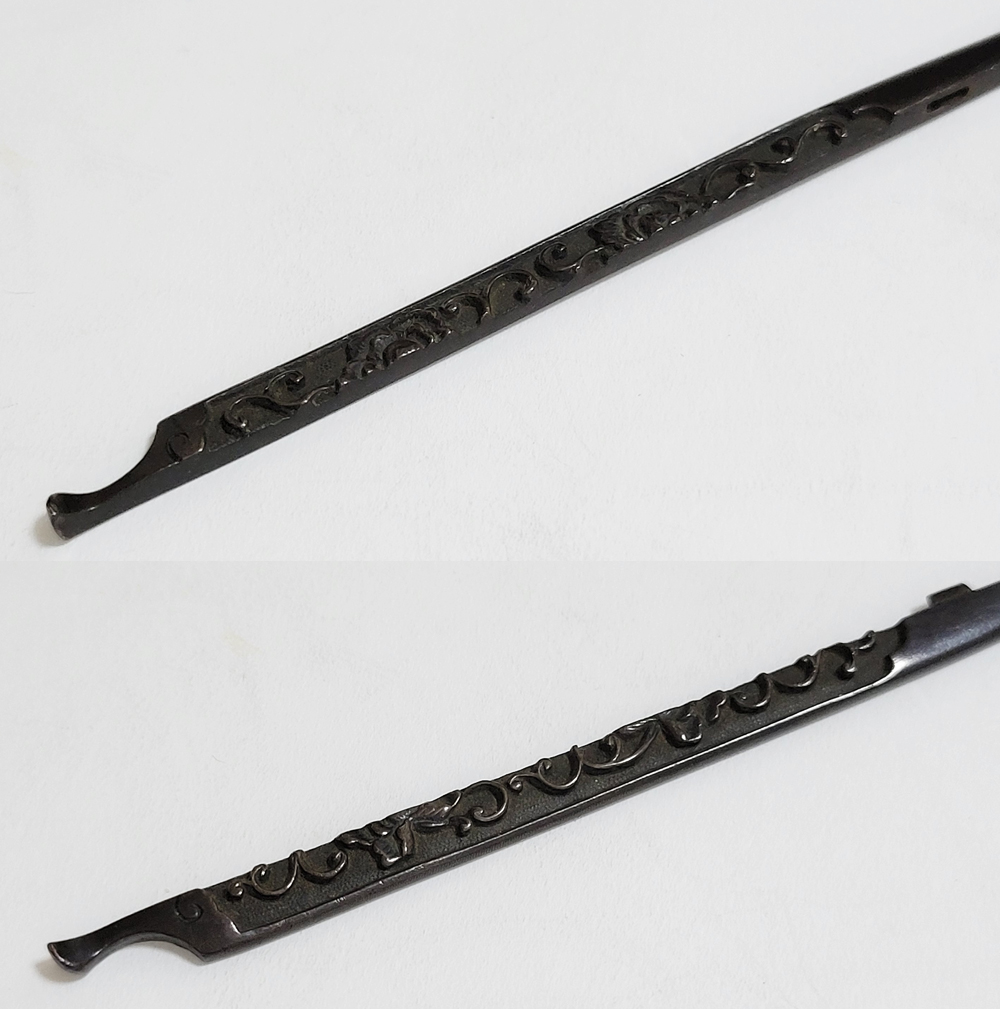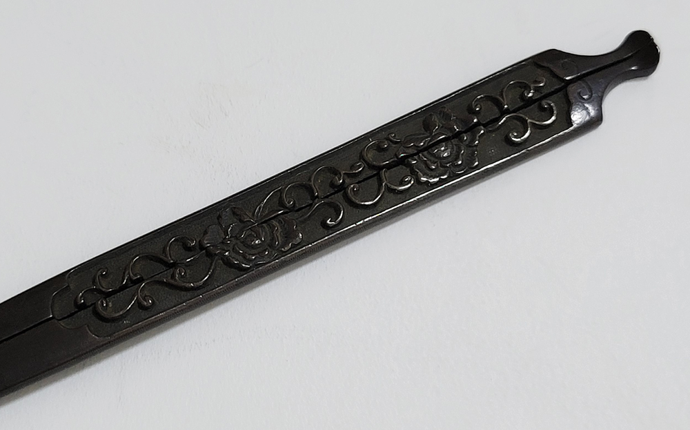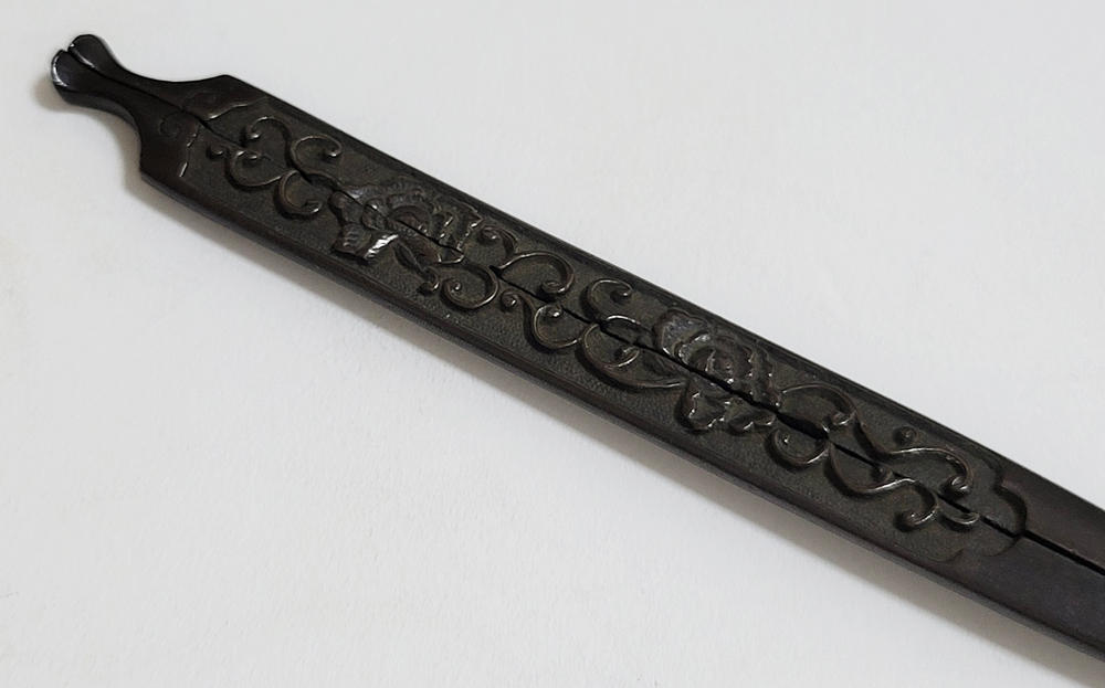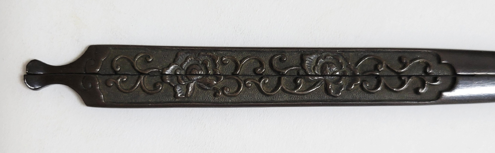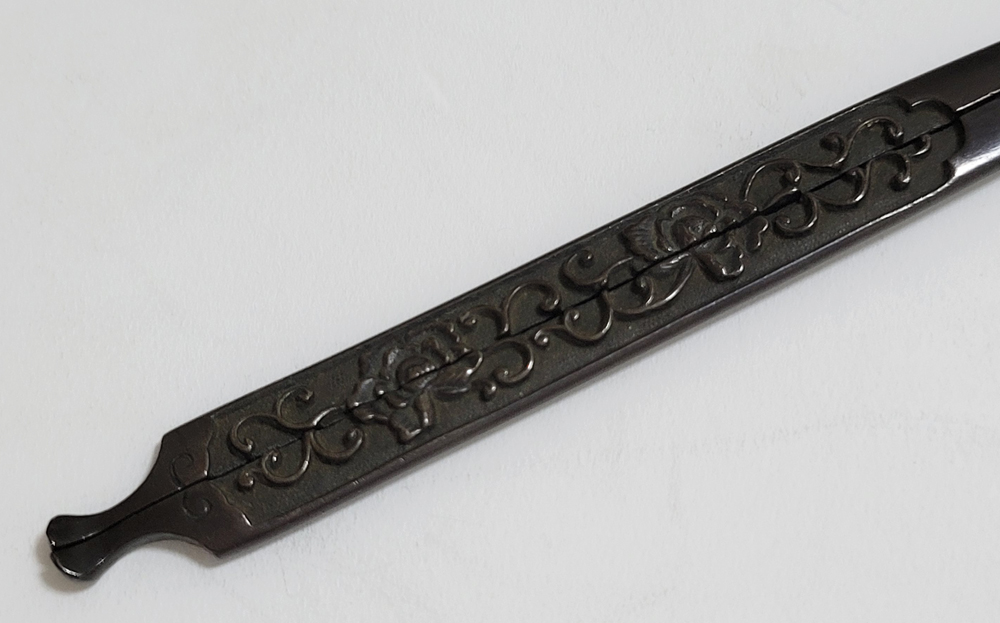 | 美濃は京都に近く交通の要衝であることから、地理的に好条件が整い古来より彫金技術が発達した。草花や動物を鋤下げて浮彫にする作風。桃山時代以前の作とされるものを「古美濃」、それ以降を「美濃」と称している。本作は美濃彫で、百家の王といわれる牡丹と伸び続けることから一族の繁栄や長寿を意味する唐草との吉兆図。2010年「古美濃」に極められ特別保存刀装具審査合格。 |