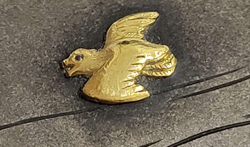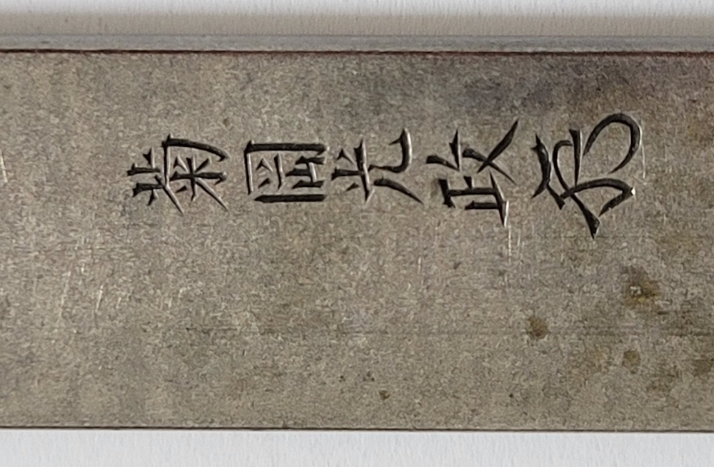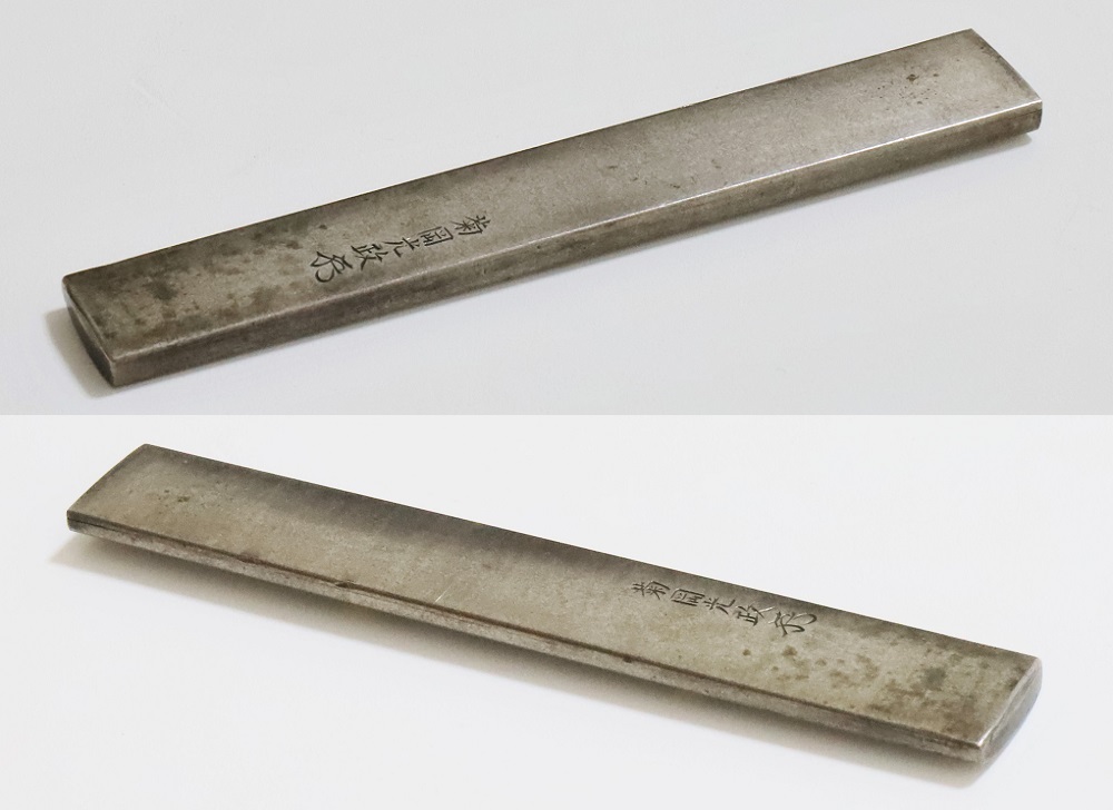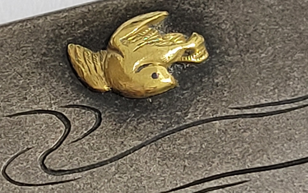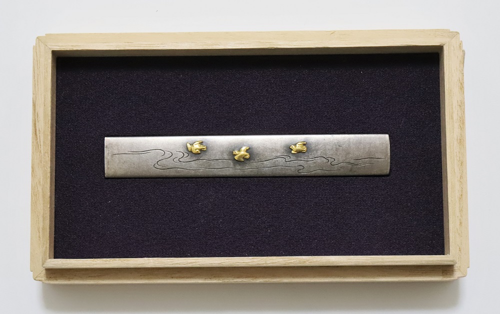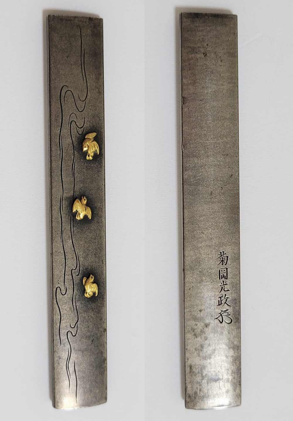 「波千鳥」は荒波を共に乗り越えていこうとする夫婦や家族の円満を表す縁起柄。本作は菊岡光政(花押)銘の波千鳥小柄。菊岡光政は菊岡光行の弟。柳川家三代目の柳川直光に師事する。文政七年(1824)66歳没。波千鳥の情景をあらわした堅実な作。特別保存刀装具。