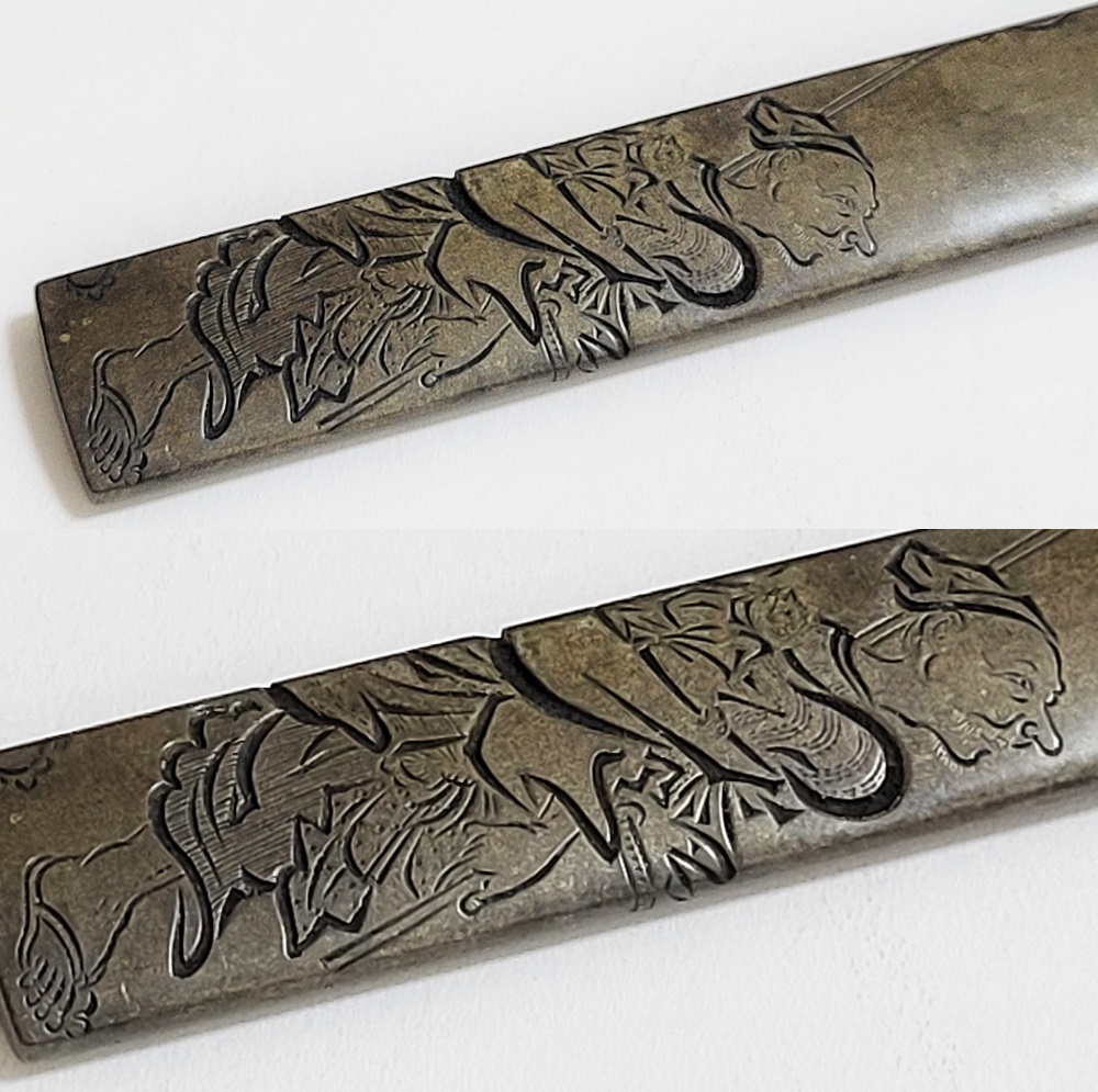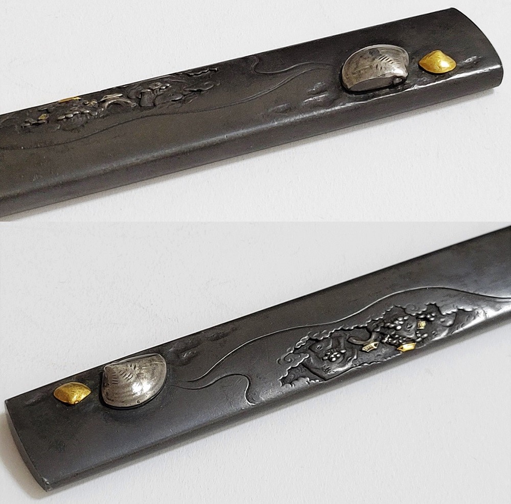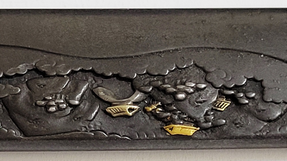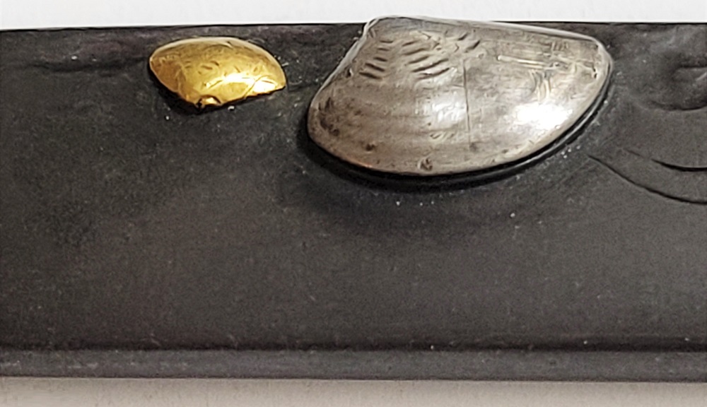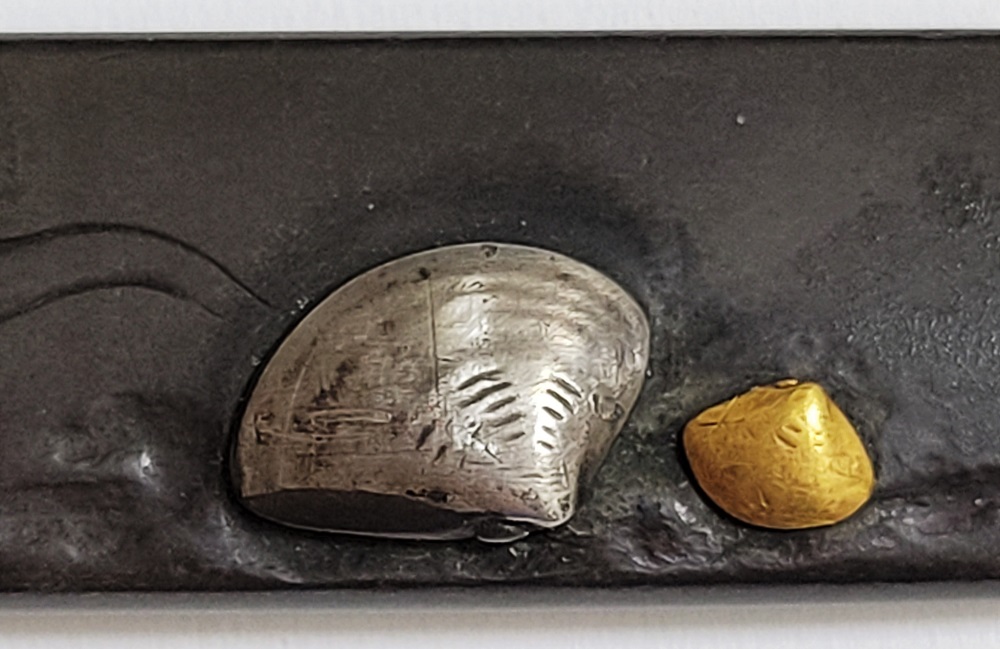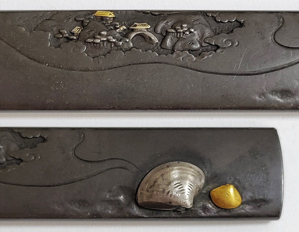 半開きになった大きな貝から気が立ち昇り、その中に山水や楼閣があらわれる図は「蜃気楼」。蜃(しん)とは、蜃気楼を作り出すといわれる伝説の生物。中国と日本で伝承され、竜の類とする説と巨大なハマグリとする説がある。 蜃気楼の名は「蜃(みずち)」が「気」を吐いて「楼」閣を出現させると考えられたことに由来する。 本作者の濱野矩施(のります)は二代濱野矩随(のりゆき)の若名。初代矩随の子で濱野政随に14歳で入門。17歳で政方と名乗り、その後一門の永随に師事して矩施と改める。22歳時に亡父の遺言により二代矩随を名乗る。明和八年(1771)生まれ嘉永五年(1852)没。二代矩随は濱野を「濱埜」と鐫る。初代に劣らぬ良工。特別保存刀装具。