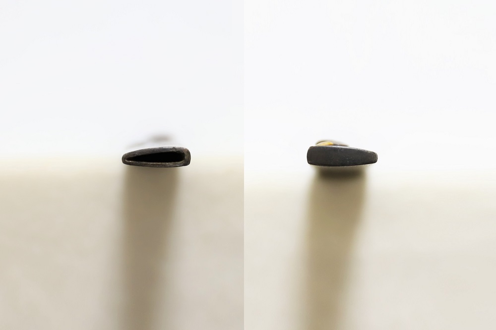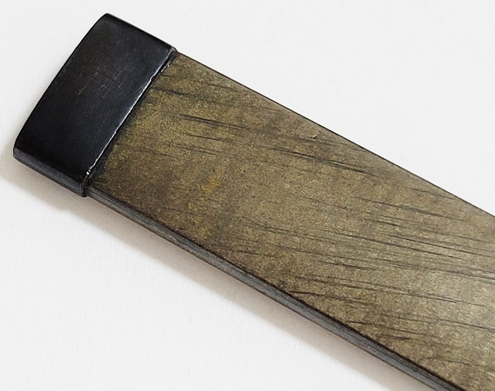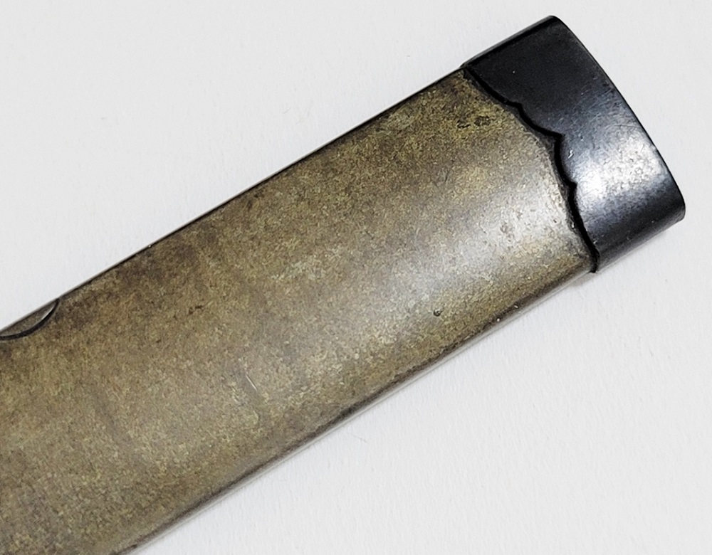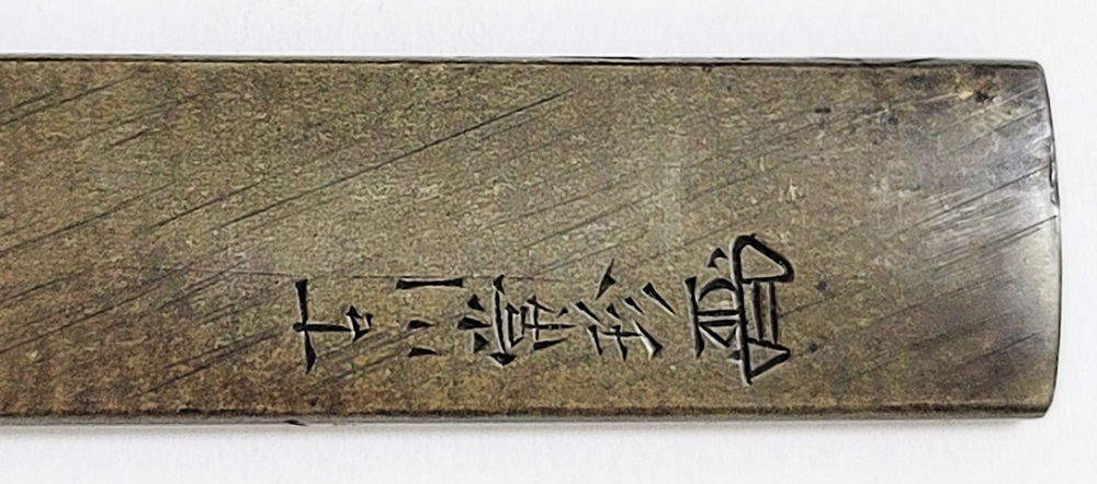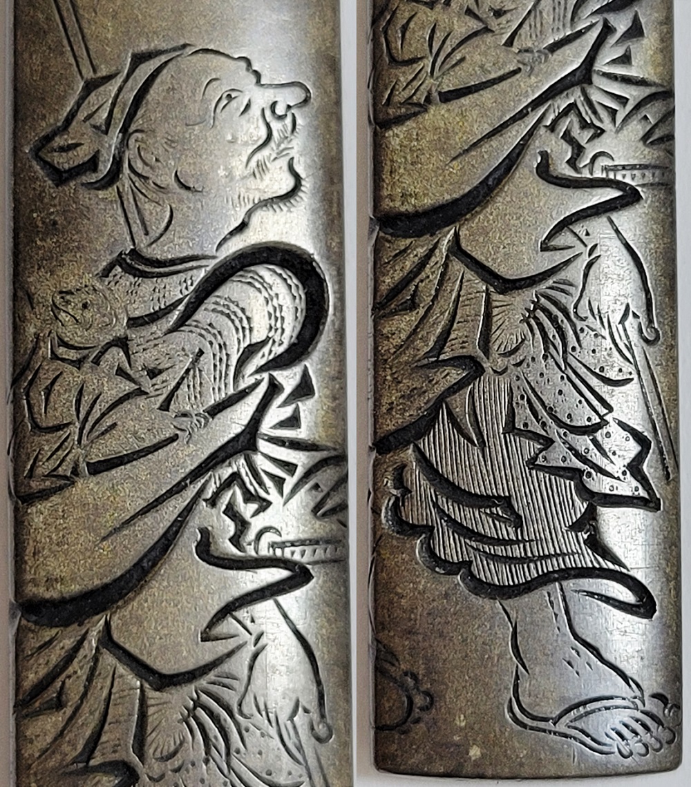 半開きになった大きな貝から気が立ち昇り、その中に山水や楼閣があらわれる図は「蜃気楼」。蜃(しん)とは、蜃気楼を作り出すといわれる伝説の生物。中国と日本で伝承され、竜の類とする説と巨大なハマグリとする説がある。 蜃気楼の名は「蜃(みずち)」が「気」を吐いて「楼」閣を出現させると考えられたことに由来する。 本作者の濱野矩施(のります)は二代濱野矩随(のりゆき)の若名。初代矩随の子で濱野政随に14歳で入門。17歳で政方と名乗り、その後一門の永随に師事して矩施と改める。22歳時に亡父の遺言により二代矩随を名乗る。明和八年(1771)生まれ嘉永五年(1852)没。二代矩随は濱野を「濱埜」と鐫る。初代に劣らぬ良工。特別保存刀装具。