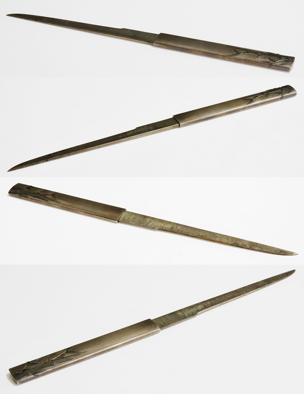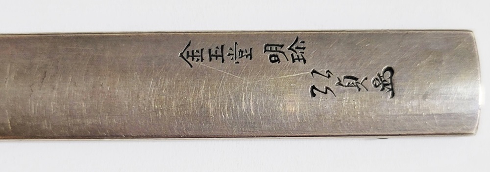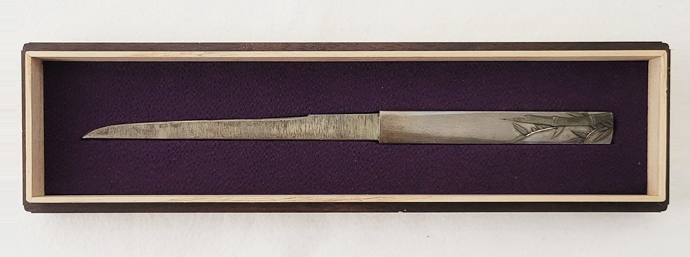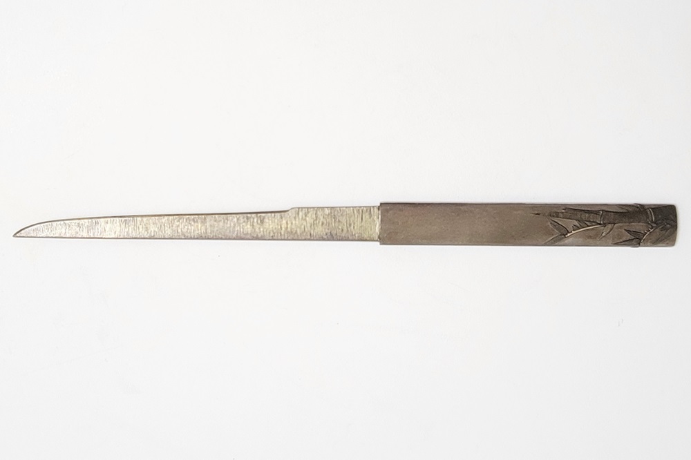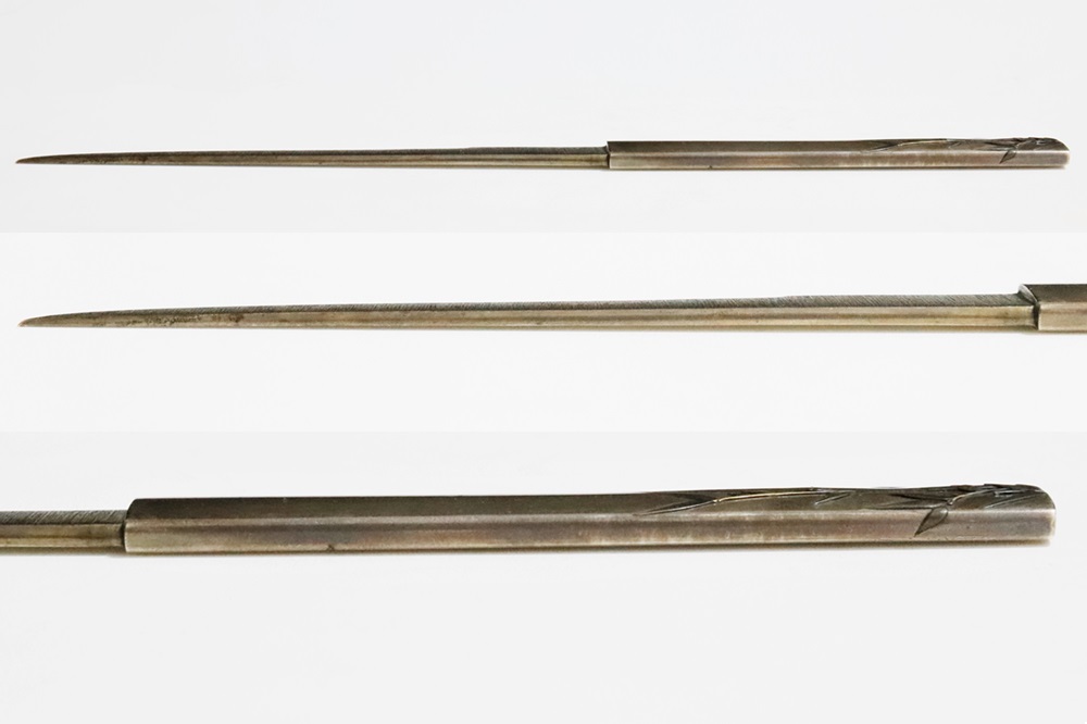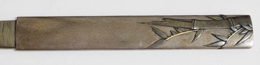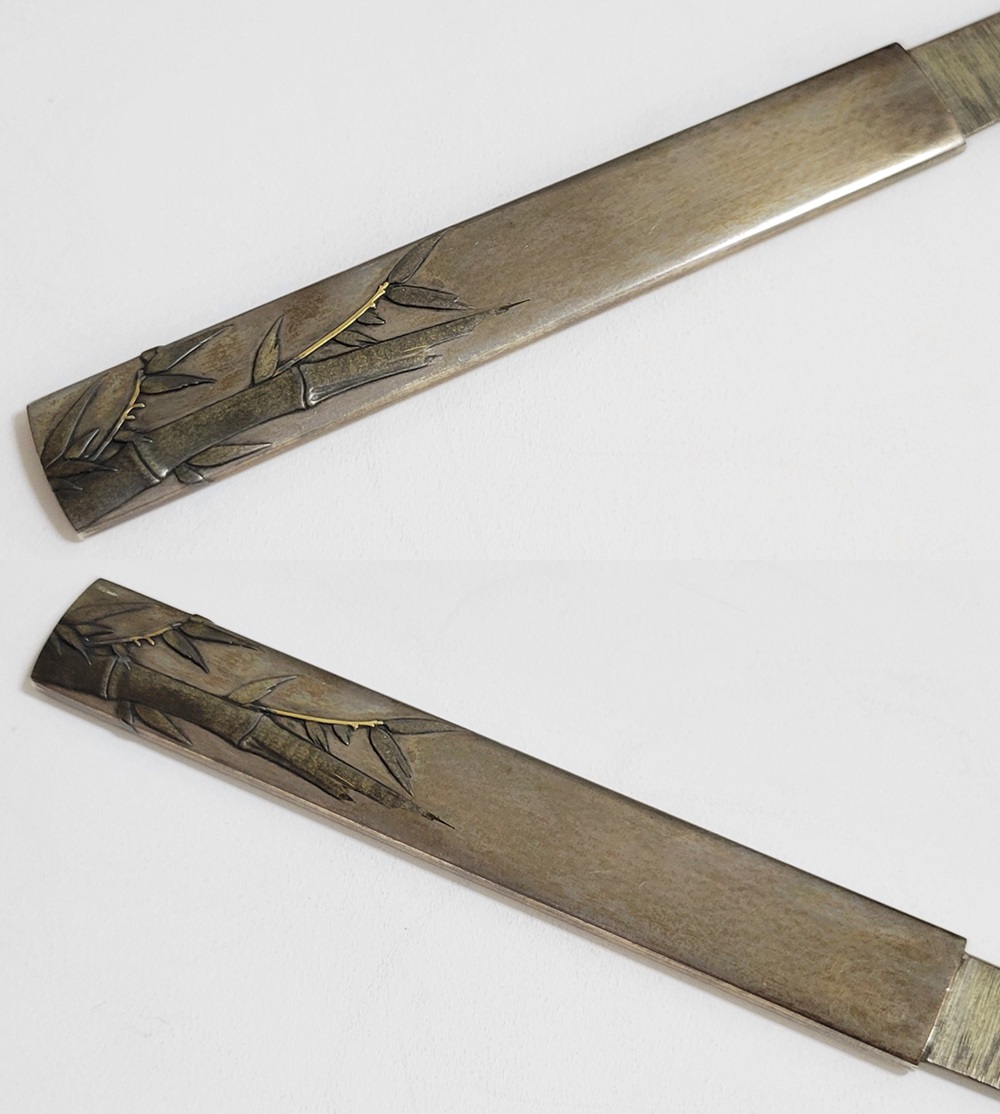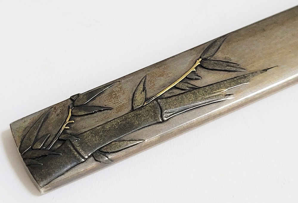 | 冬の厳しさに耐え、節目正しく真直ぐにそしてしなやかに生長する竹は人気の画題。本作は四分一掛かる銀地で作られた小柄と穂先が一体の共小柄。天に向かって伸びる竹を巧みにあらわす。弘貞は写実風の高彫りで打越派を成す打越弘寿の門人。弘化四丁未年五月年紀(1847)作がある。号は秀現斎・金玉堂、後年に圓象を使用した。穂:長さ12.5cm/元幅1.22cm/元重0.23cm。特別保存刀装具。 |