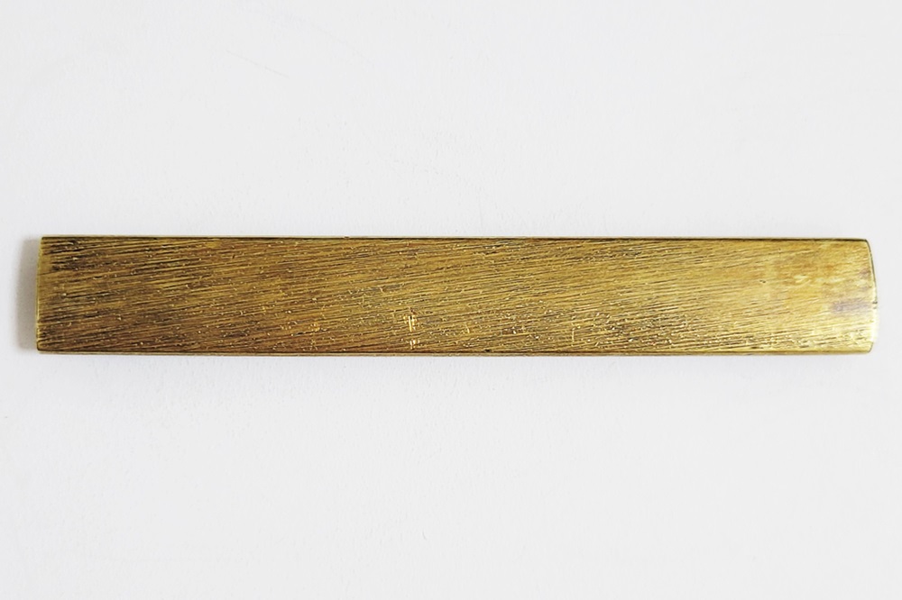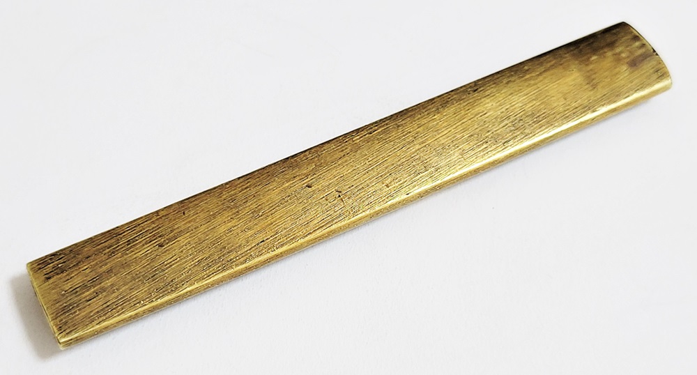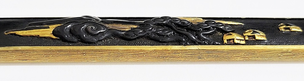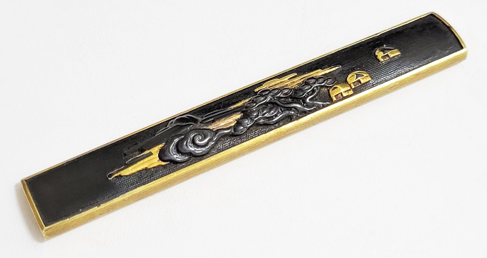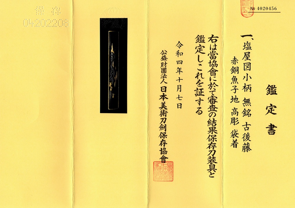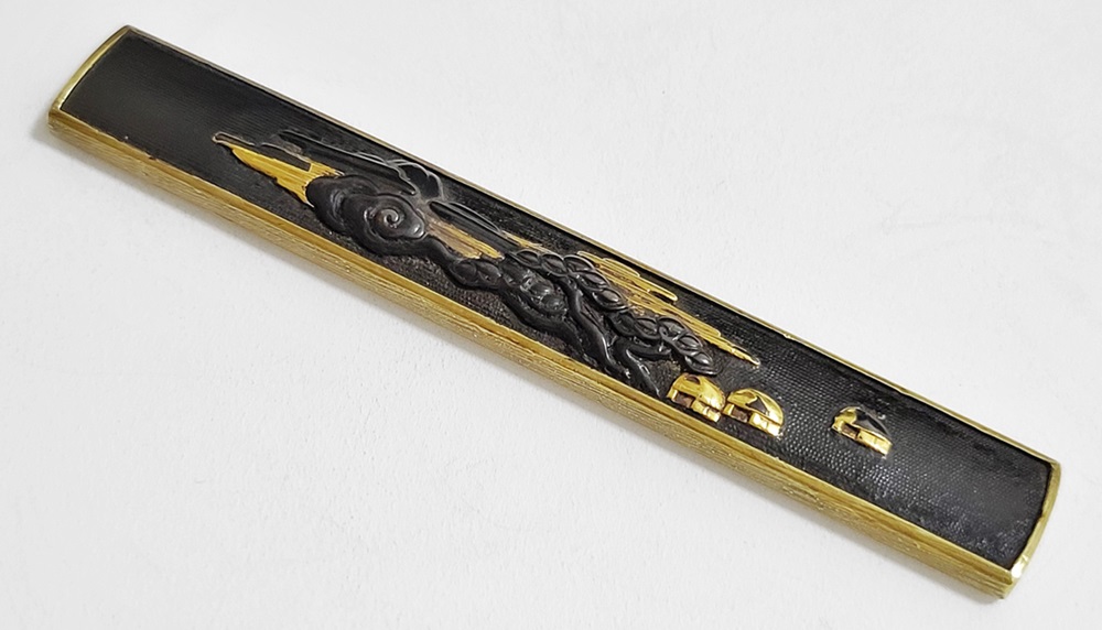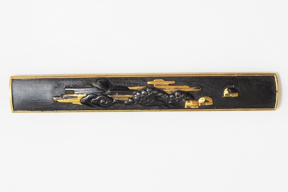 | 古後藤と極められた塩屋図小柄。古後藤とは江戸期まで時代が下らない桃山時代までの古い後藤家で作者を特定できない作。初代祐乗、二代宗乗、三代乗真、四代光乗、五代徳乗の時代に相当する。塩屋は海水から砂浜で塩を作る日本古来からの製塩法を題材にした図。本作は、擦れ剝がれた袋着せや魚子の擦れ具合および作域から古後藤。裏板の保存状態もよい。保存刀装具。 |
