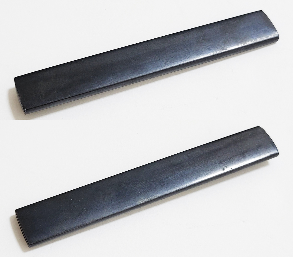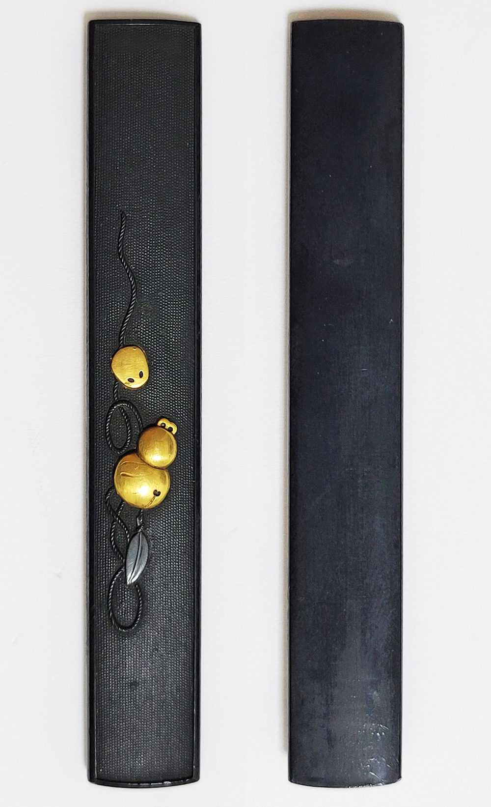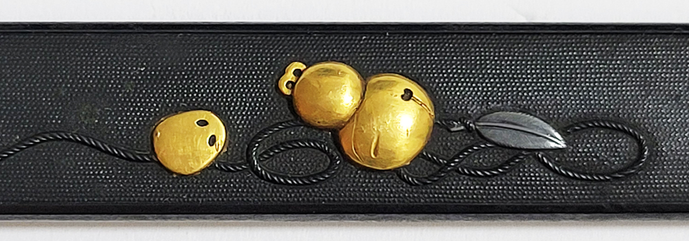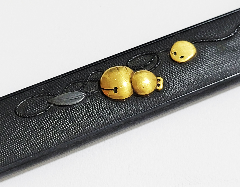 | 瓢箪鈴(ひょうたんすず)は瓢箪の形をした鈴。運を集めて開運に導きまた邪気を集めて封じ込めるといわれる瓢箪が鈴の音を鳴らしご利益を願う縁起物。本作は細微に整った赤銅魚子地に瓢箪鈴を配した小柄。状態頗るよい。2024年11月刀装具審査で京金工に極まり保存合格。 |