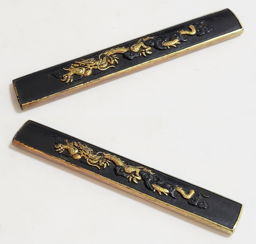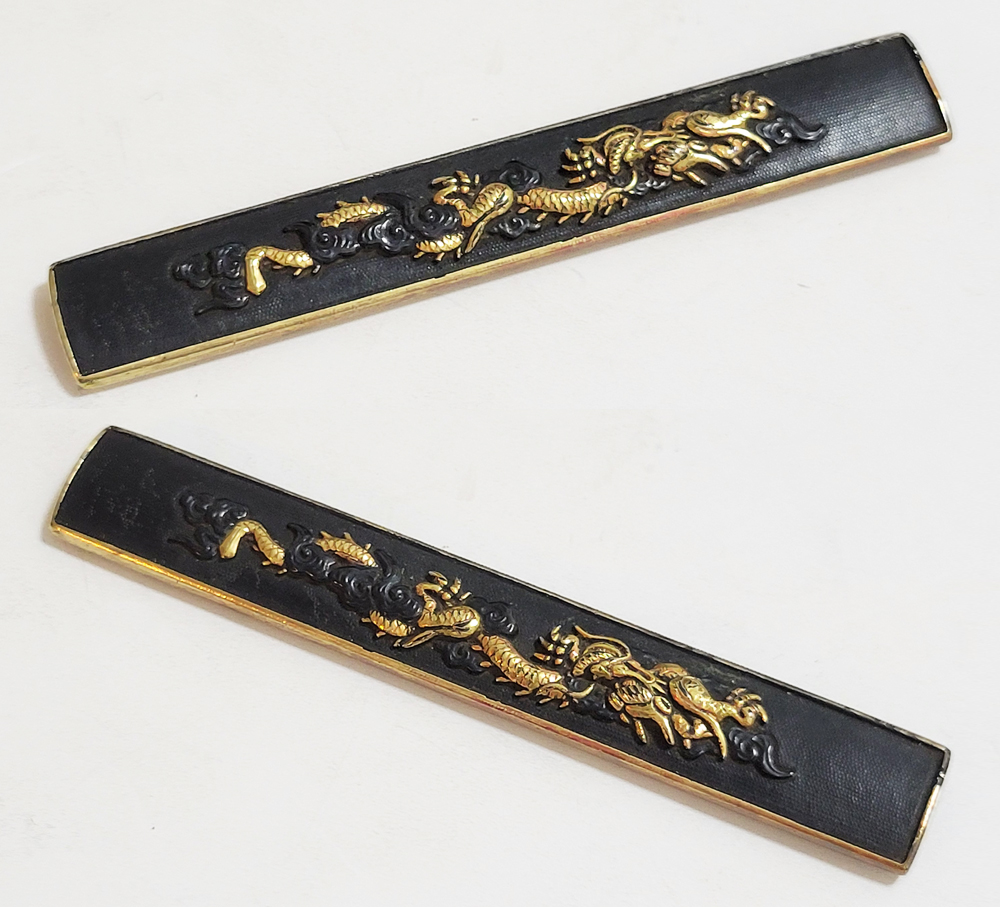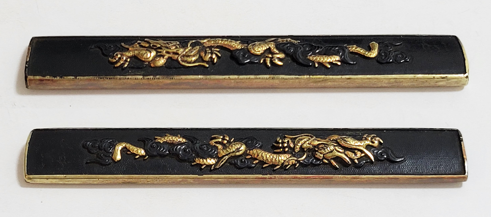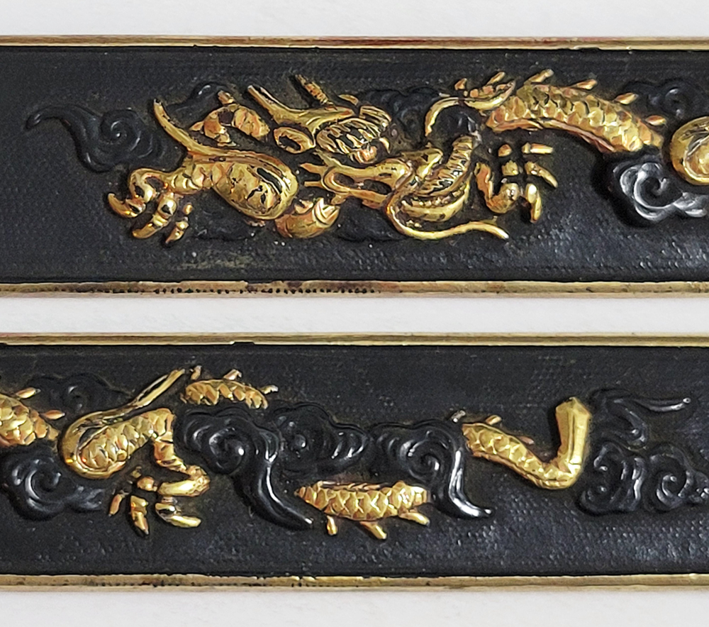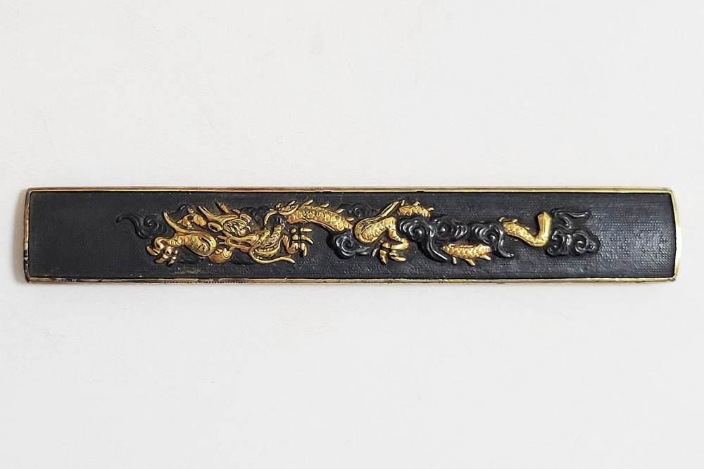 | 瑞雲を纏う這龍図小柄。金性映える裏哺金と擦れた魚子地より江戸中期は下らない京金工作と思われる。 |