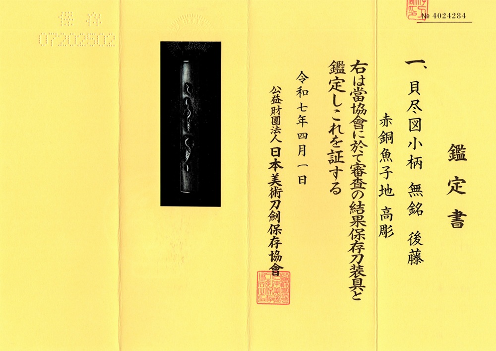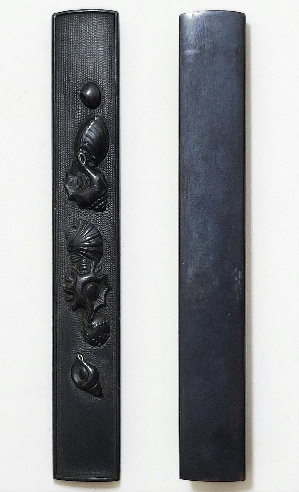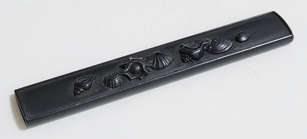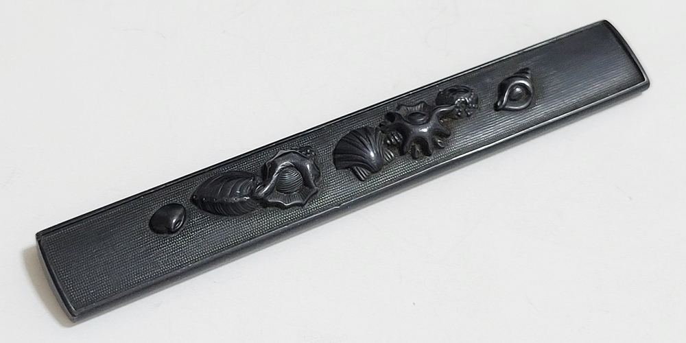 | 貝尽(かいづくし)は異なる主だった貝の美しい形を絵や文様にした図。刀装具のほか着物や陶器に人気のある画題として好まれた。本作は赤銅のみで巻貝、雲丹、法螺貝、蛤、栄螺、鮑、浅蜊を並べた意匠。後藤流の格調ある小柄。魚子の擦れが時代をあらわしている。2025年2月刀装具審査で「後藤」に極まり保存合格。 |