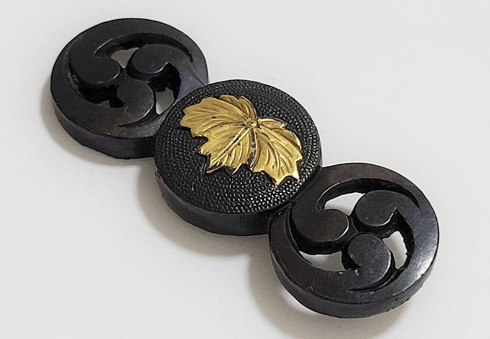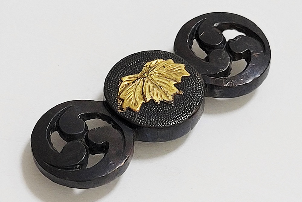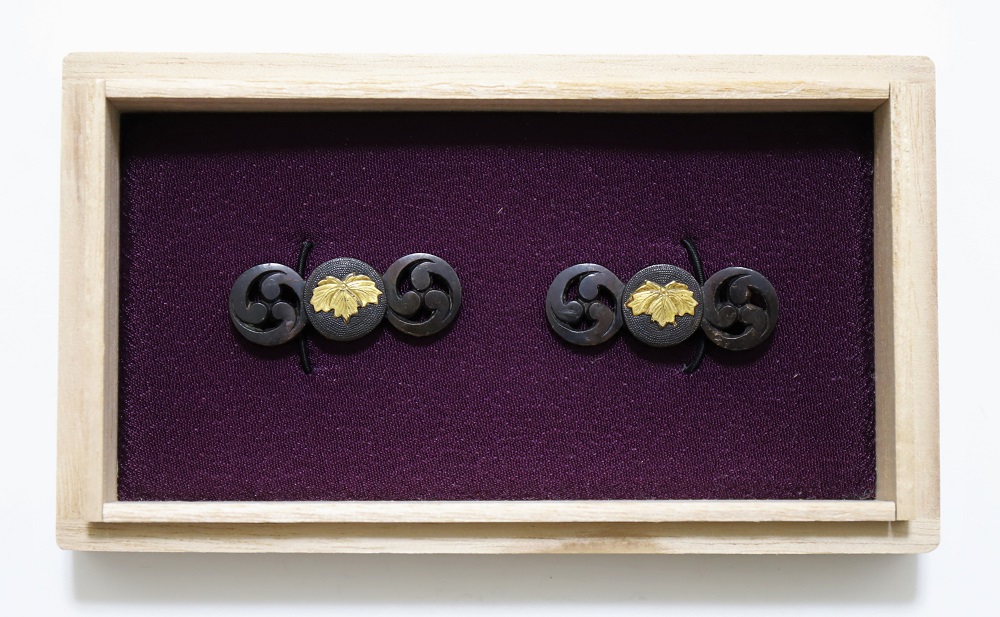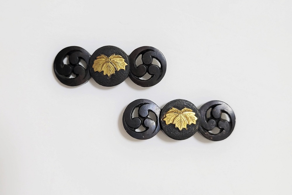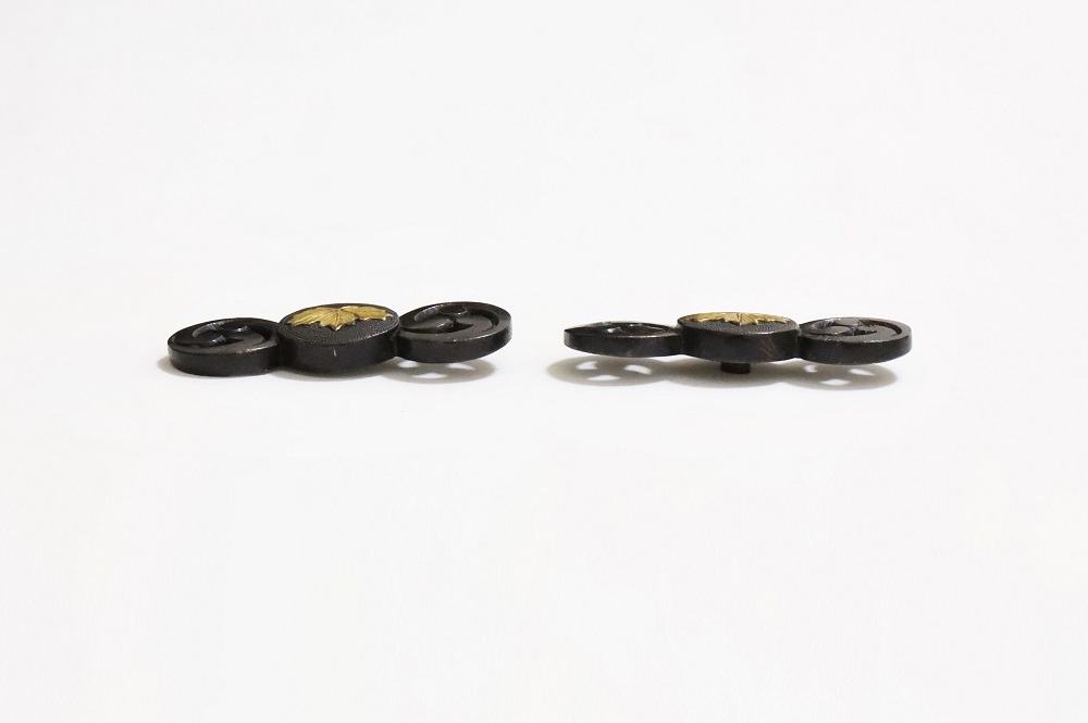 | 巴(ともえ)は、コンマあるいは勾玉のような形をした日本の伝統的文様。弓をひく人の左腕に結びつけて矢を放った際の弓返りを防ぐ半月形の革製品「鞆」(とも)を図案化したもの、あるいは鞆(とも)に描かれた文様からきているという。巴紋は、家紋や神紋・寺紋としても用いられ、太鼓、軒丸瓦などにも描かれる。本作は右三つ巴紋を左右に、そして中央に蔓(つる)が伸びて繁栄を意味する蔦(つた)を描いた三双図赤銅地陰陽根目貫。 |