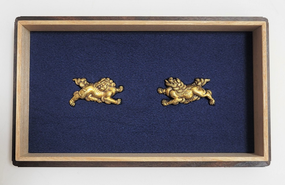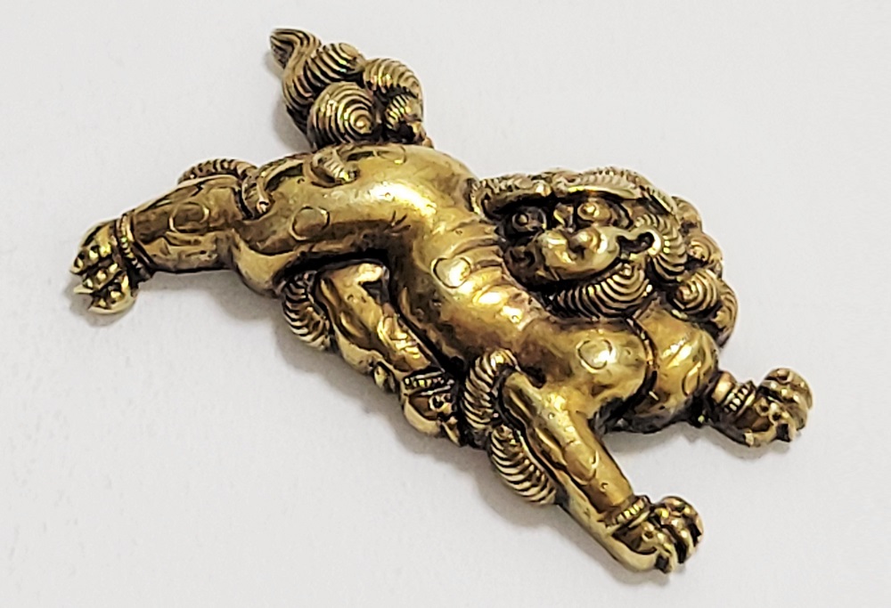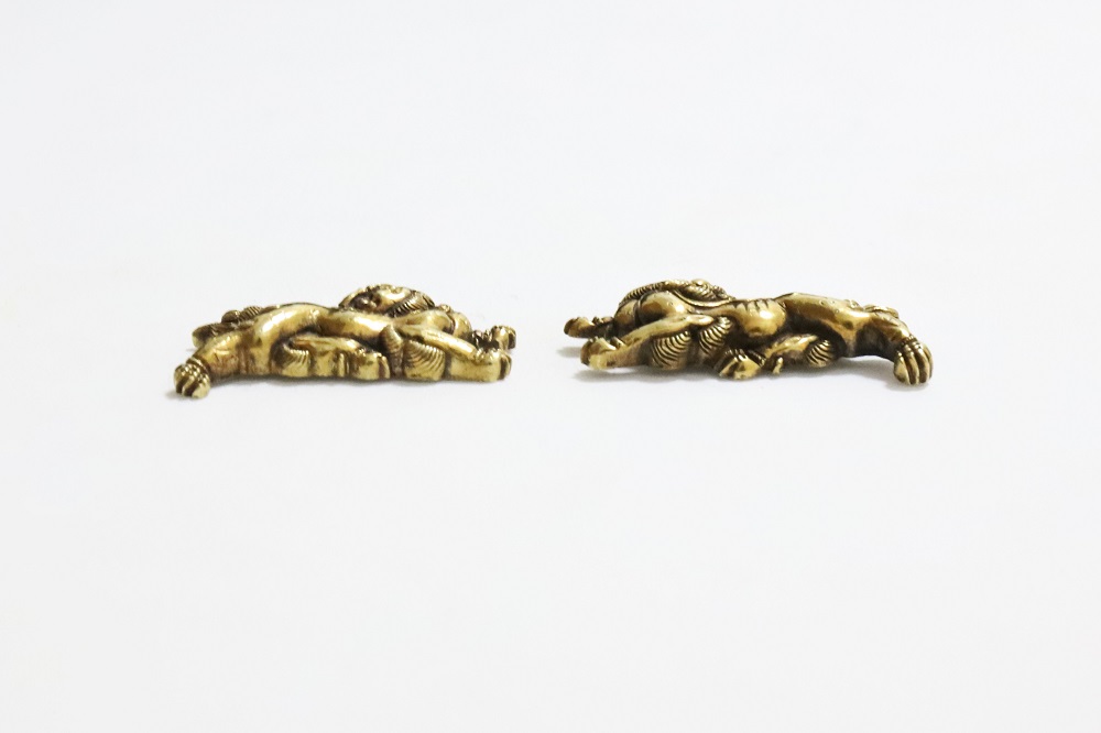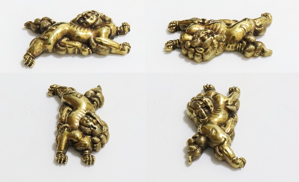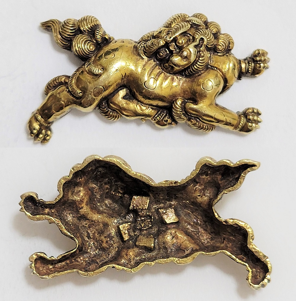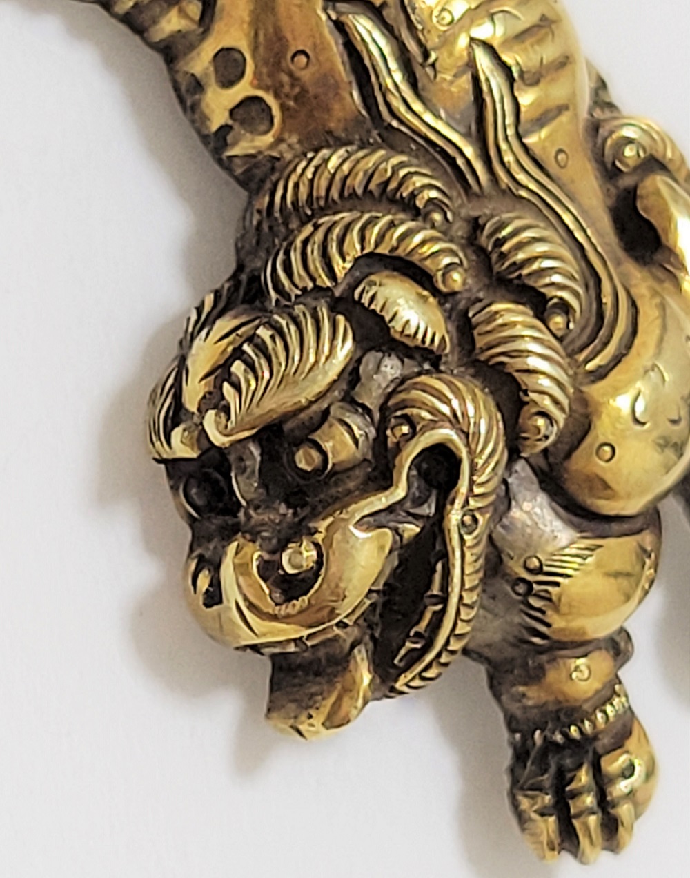 | 背筋のなめくり鏨、後足付け根の筋など後藤の掟どおりであるが、洲浜崩れの胴の班からか、脇後藤と極められた一疋獅子金無垢目貫。相応の時代が窺える。 |