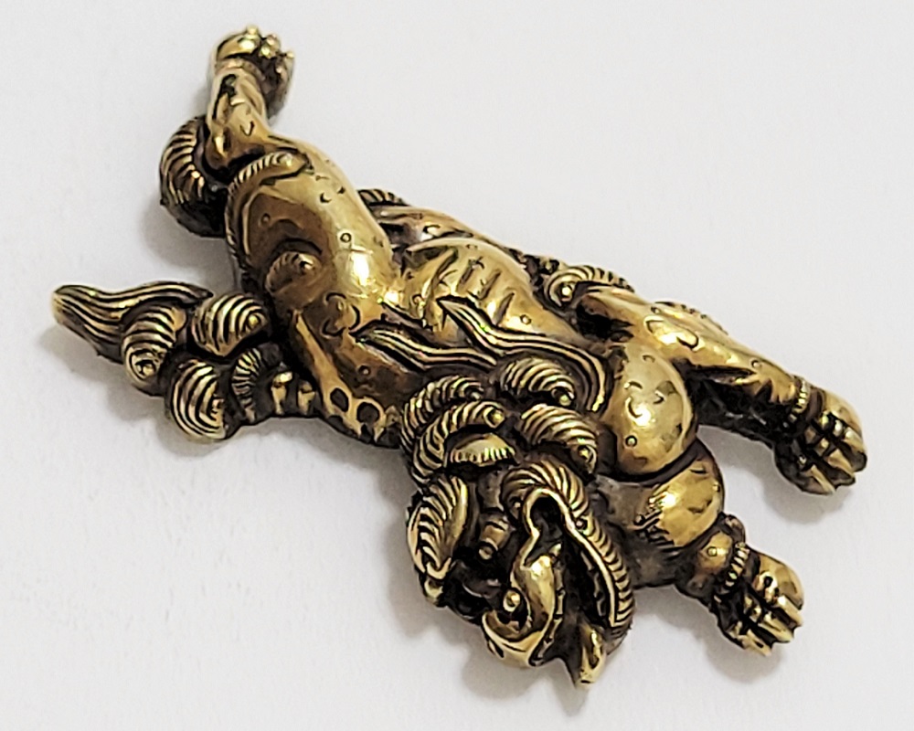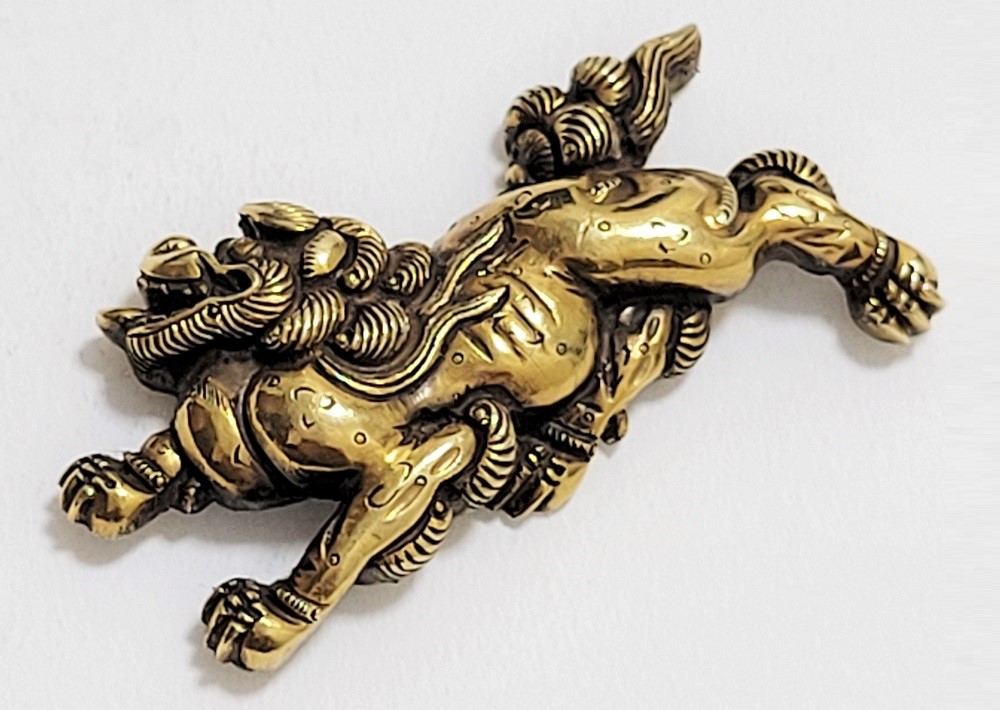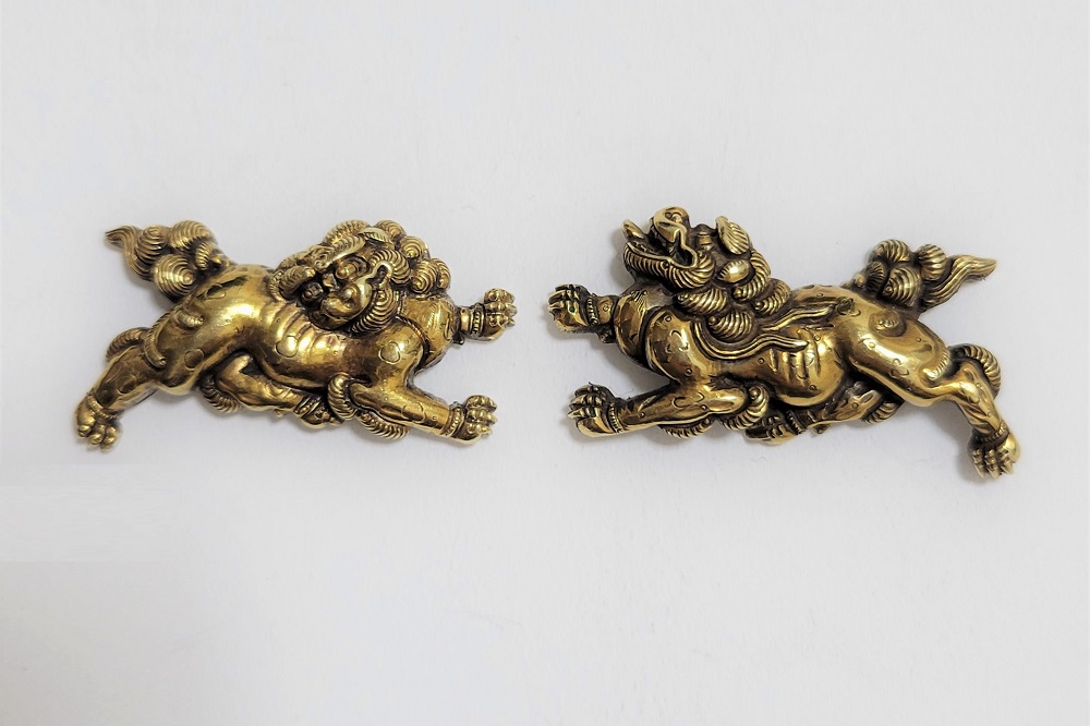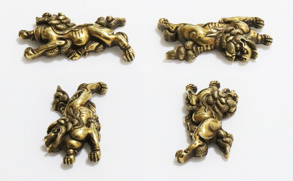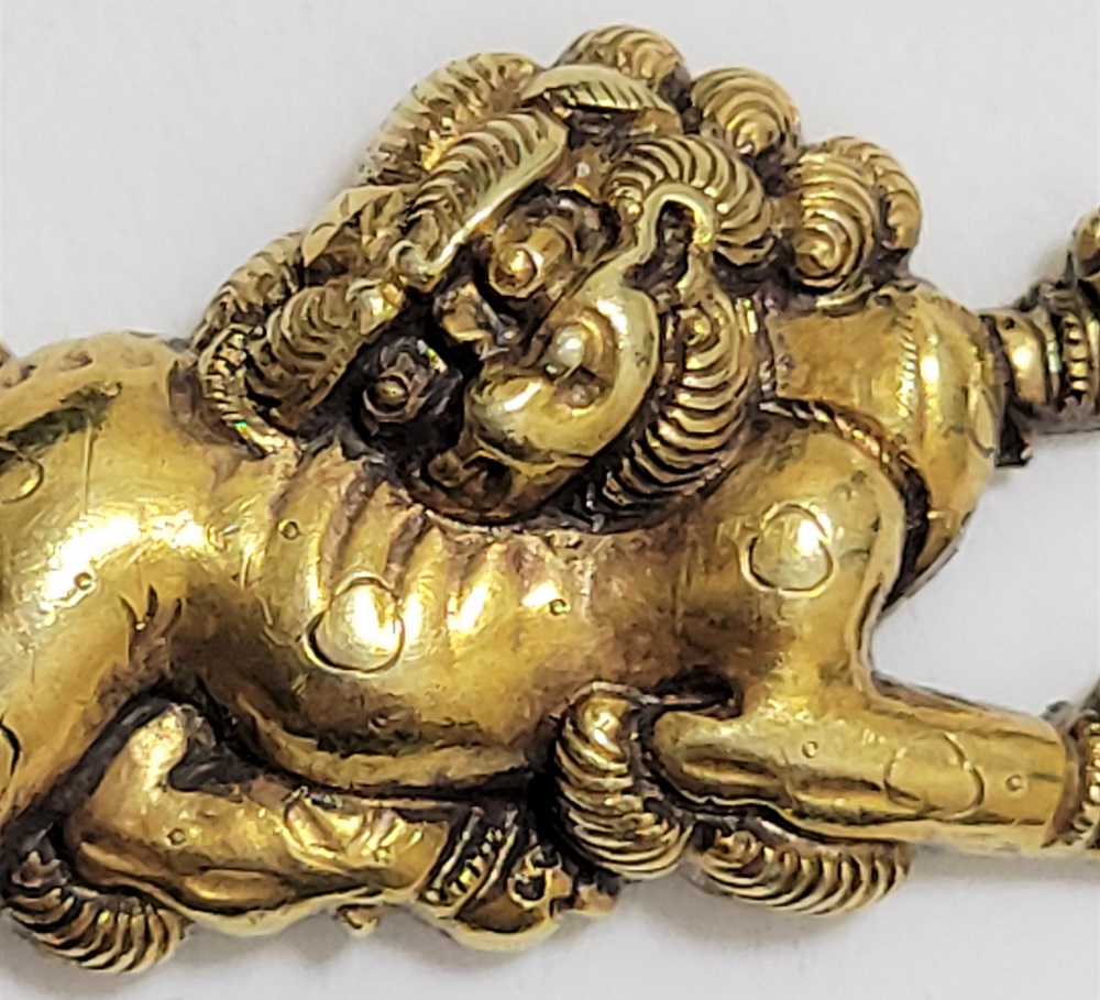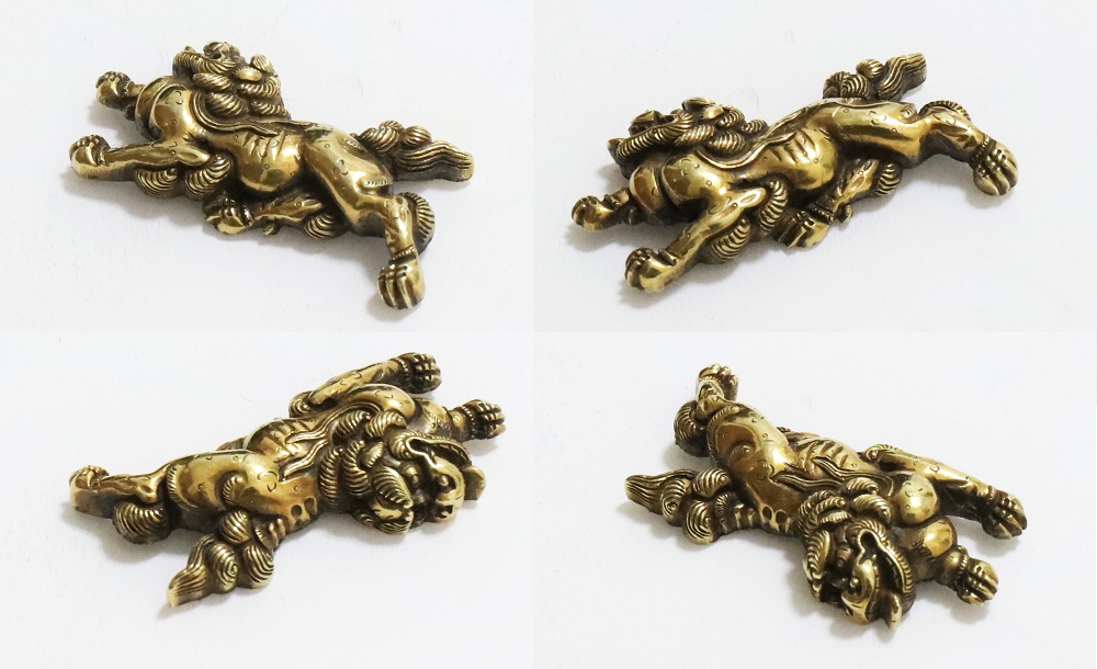 | 背筋のなめくり鏨、後足付け根の筋など後藤の掟どおりであるが、洲浜崩れの胴の班からか、脇後藤と極められた一疋獅子金無垢目貫。相応の時代が窺える。 |