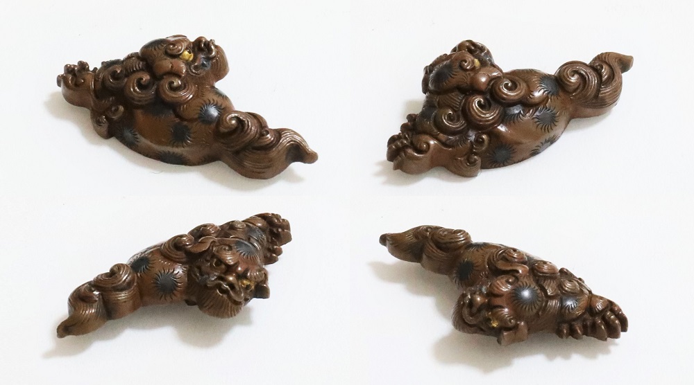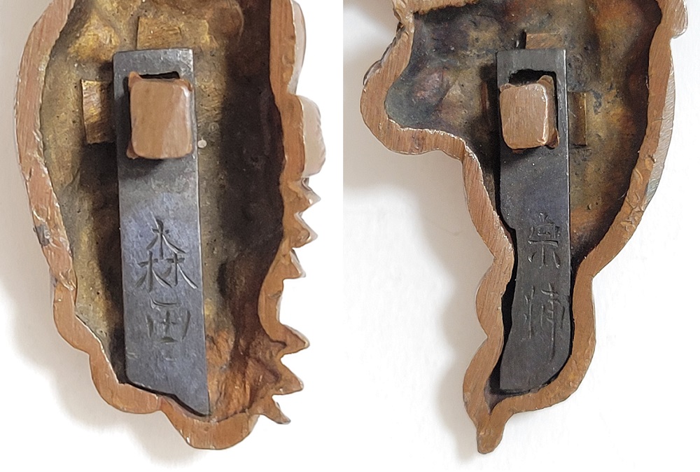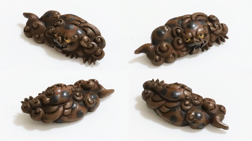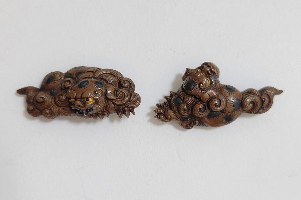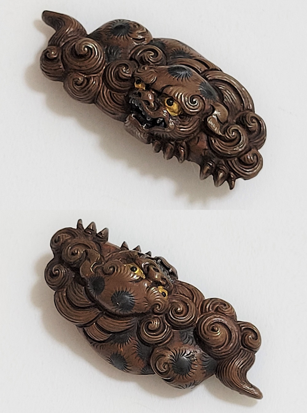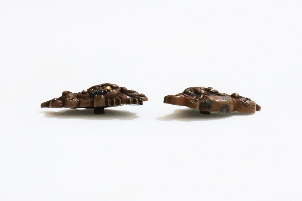 | 素銅の躯体に赤銅の色金を埋め彫を加えて班を装飾。宗珉に倣った横谷獅子。割短冊銘 森田・宗捕については不詳ながら、精緻な鏨で表現された顔に実力が示されている。特別保存刀装具。 |