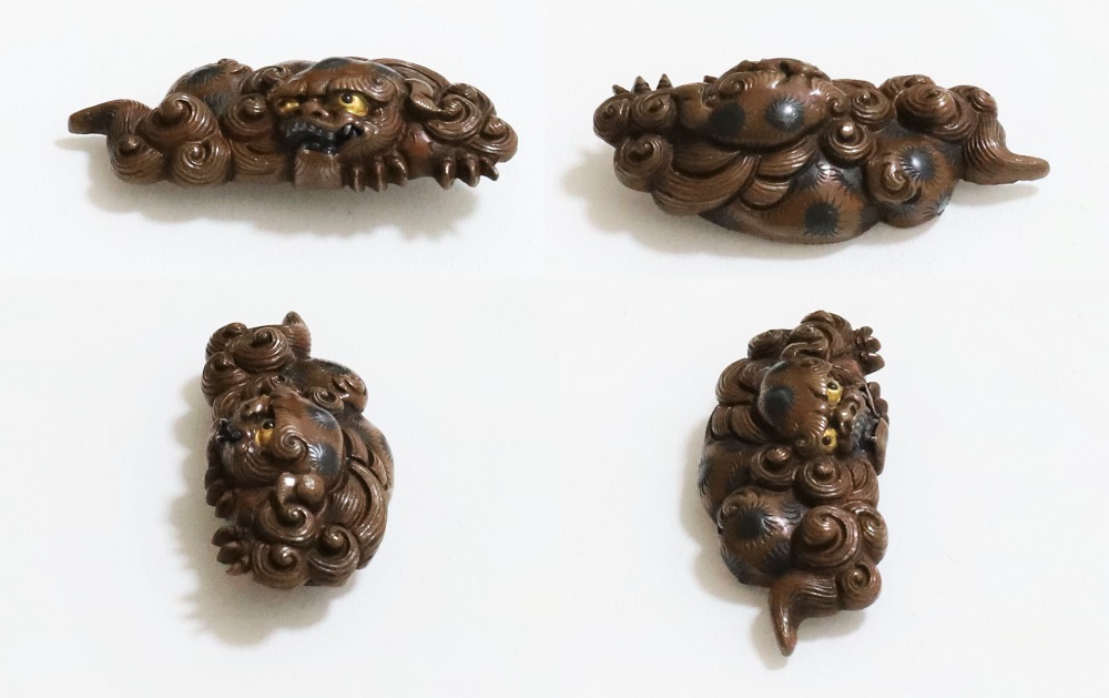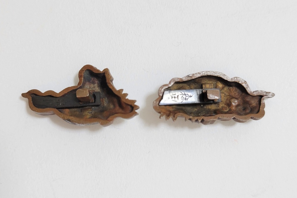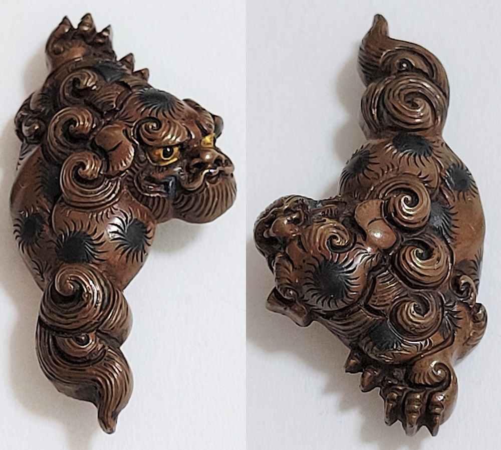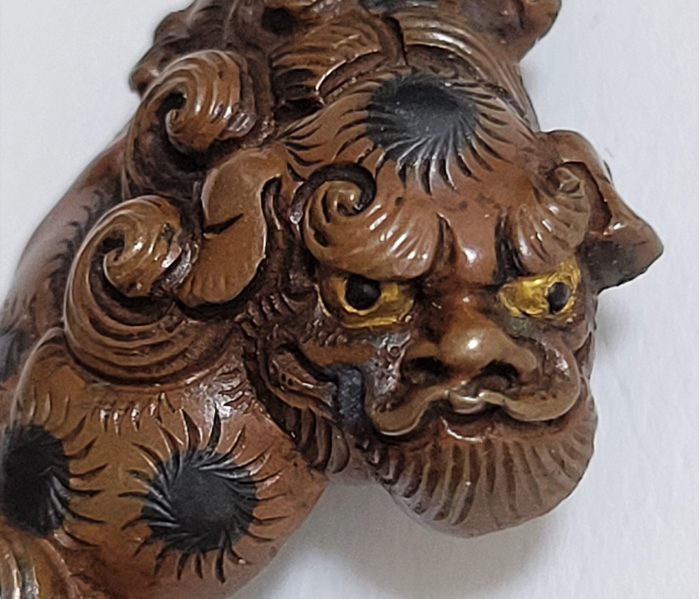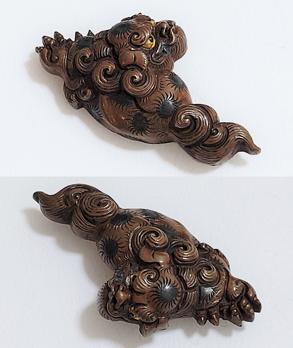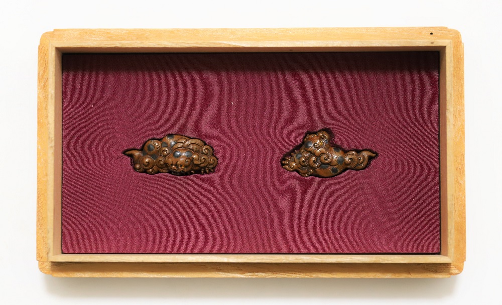 | 素銅の躯体に赤銅の色金を埋め彫を加えて班を装飾。宗珉に倣った横谷獅子。割短冊銘 森田・宗捕については不詳ながら、精緻な鏨で表現された顔に実力が示されている。特別保存刀装具。 |