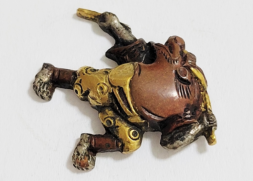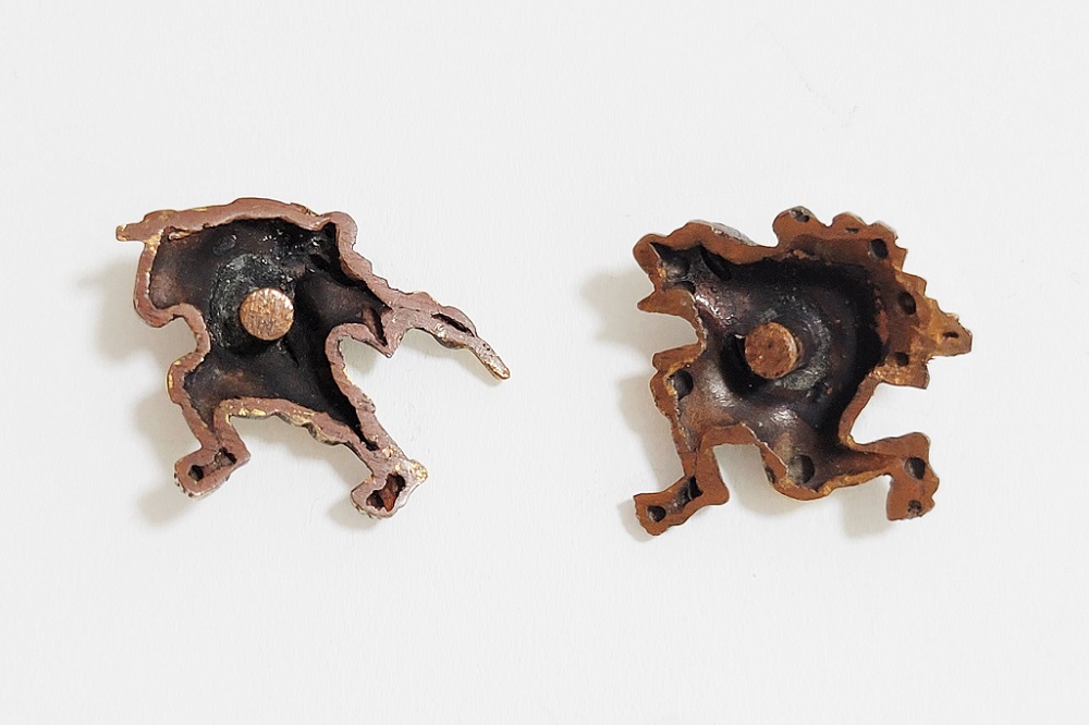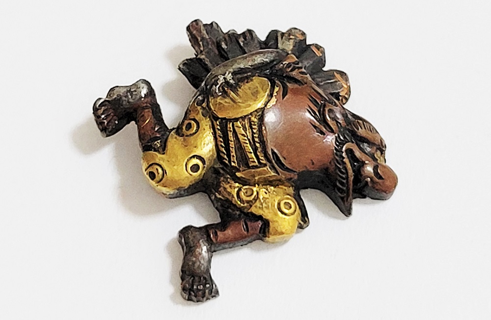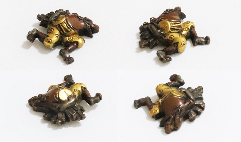 | 越後獅子は、越後国西蒲原郡月潟村(現新潟市)が発祥の一人立ち獅子舞。家の前で獅子頭(ししがしら)をかぶった子供が、親方の笛・太鼓に合わせて踊りや軽業などを見せ銭を貰う大道芸。江戸中後期に盛んにおこなわれた。本作は小振りの越後獅子図素銅目貫。裏行きに容彫の妙が窺える。 |