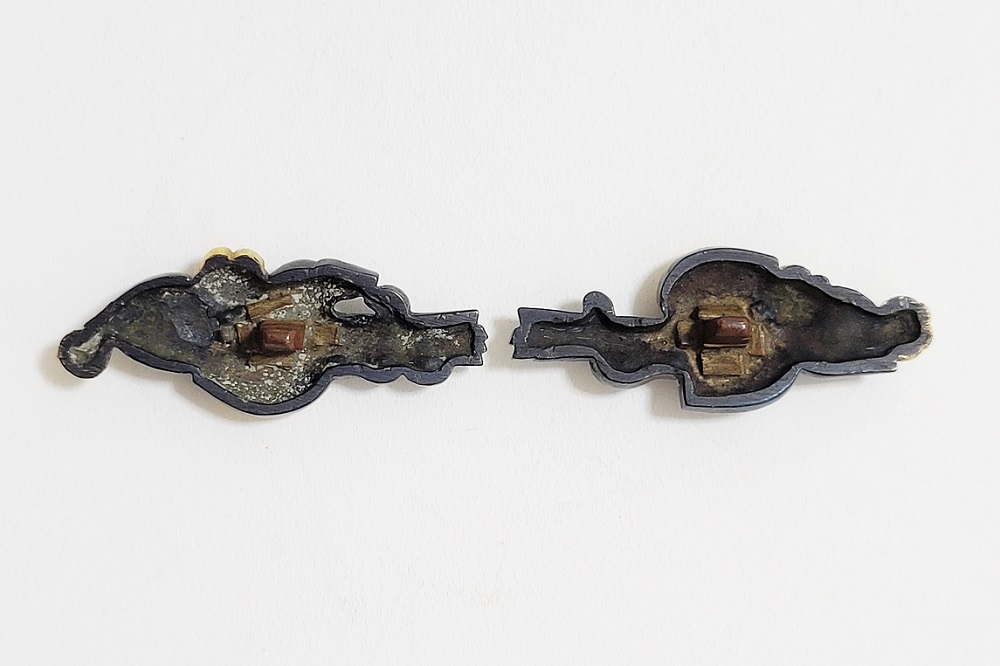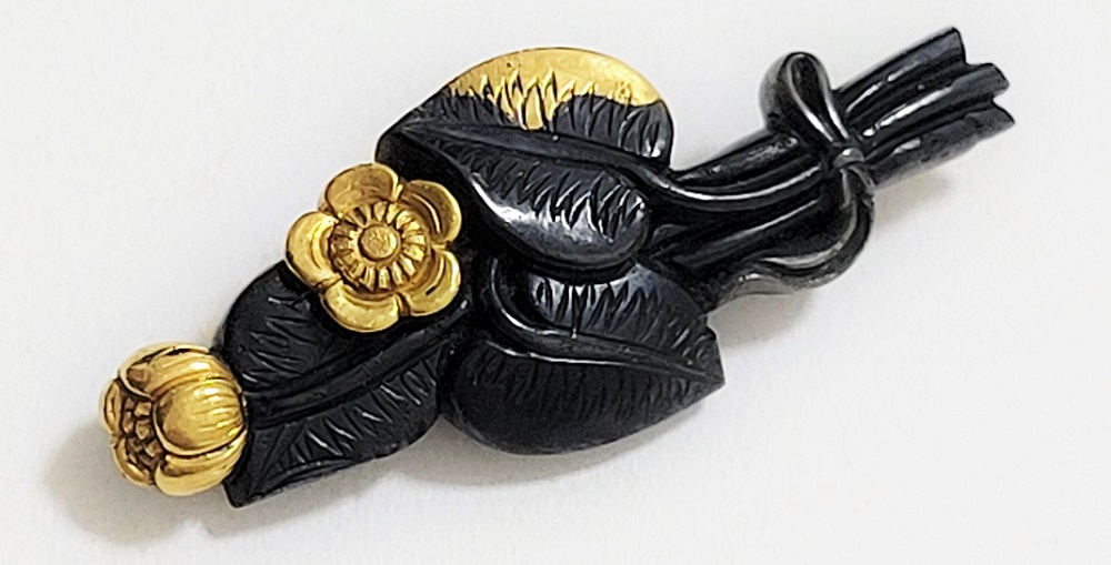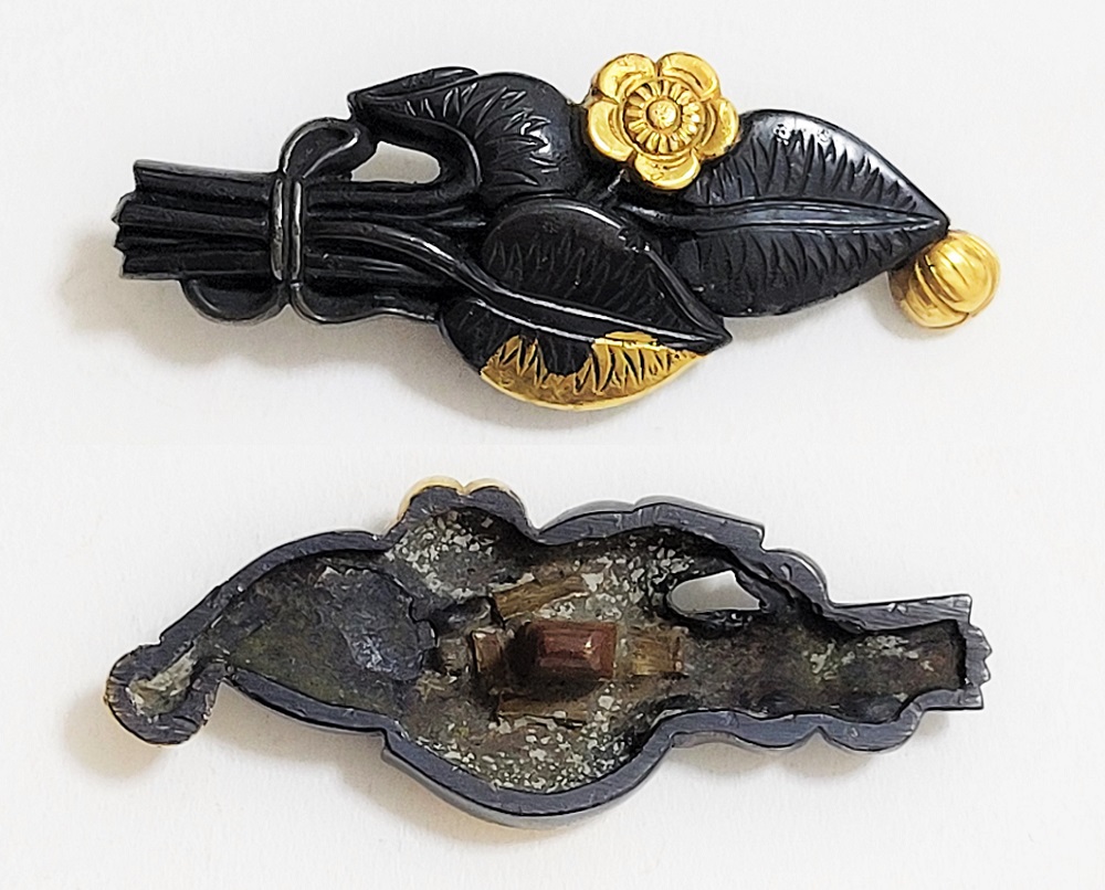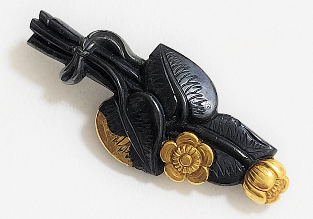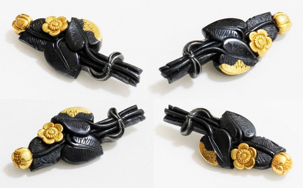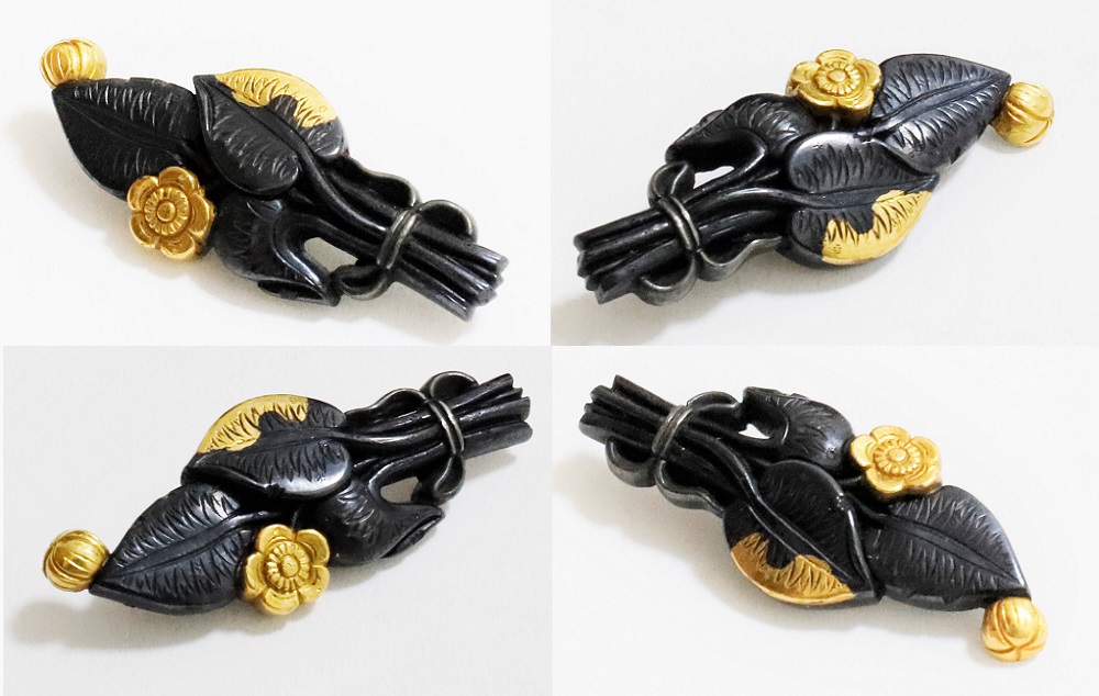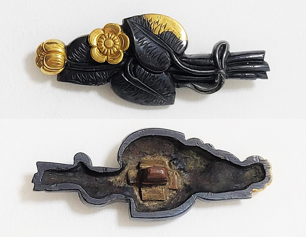 | 河骨(こうほね)はスイレン科の植物。白い地下茎が骨のように見えることから河骨と名付けられたという。浅い池や沼に自生し夏に花柄を水上に出し長い花茎の先端に黄色い花を咲かせる。本作は河骨の花と葉を束ねた図柄の目貫。上質の赤銅を用いて金色絵が効果的に施されている。 |