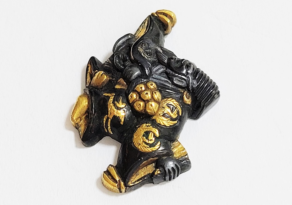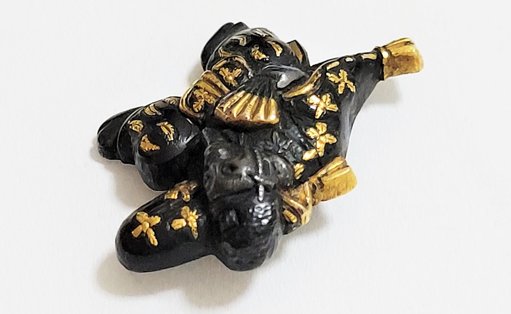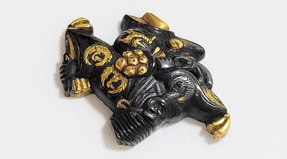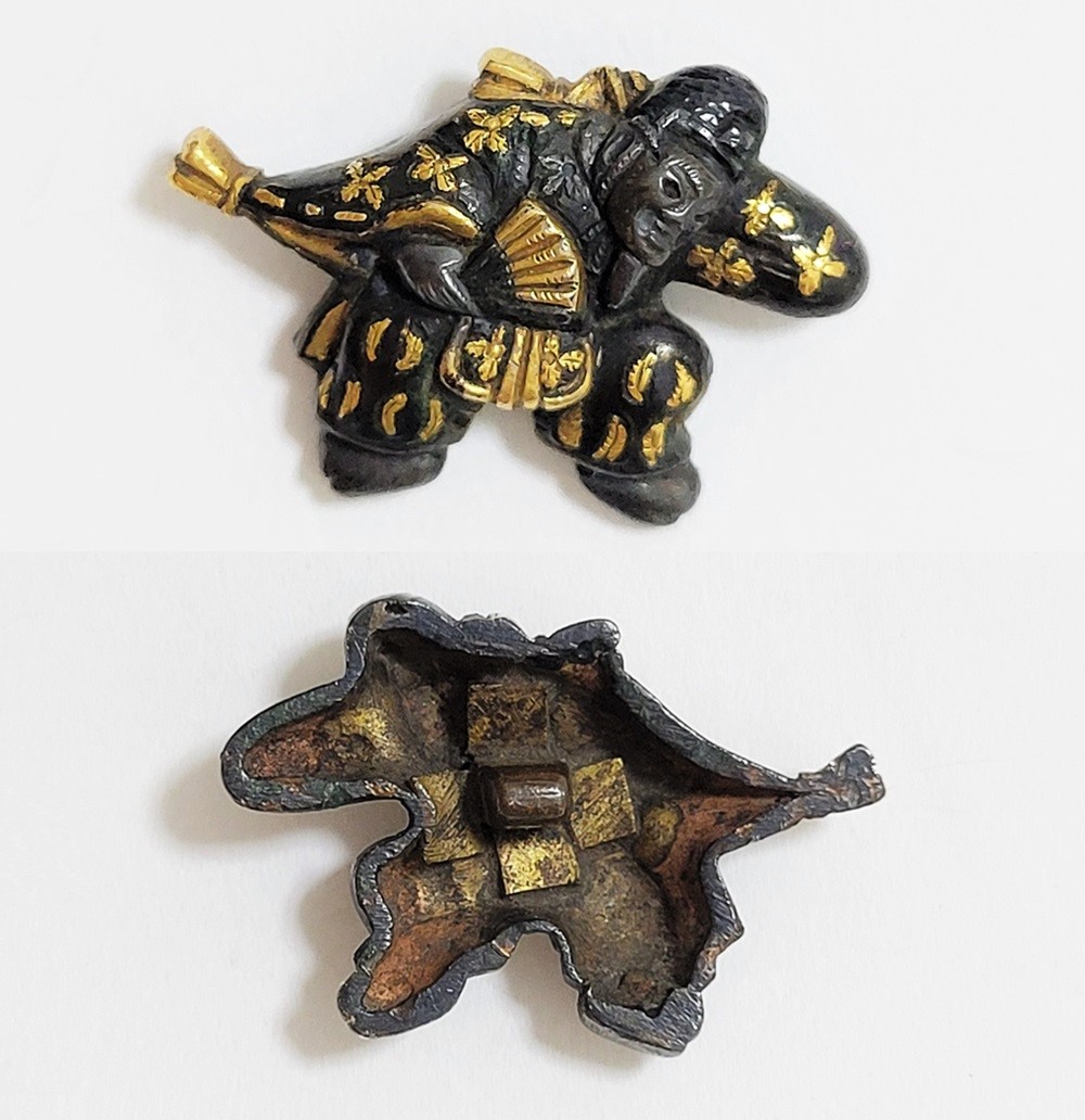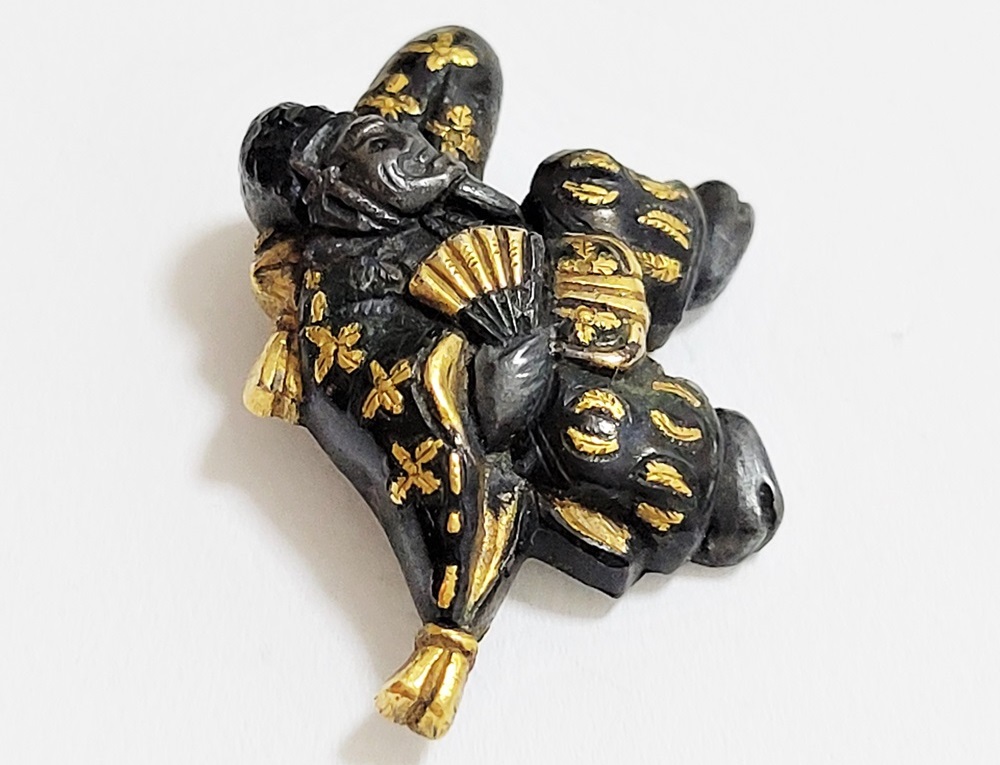 | 「三番叟(さんばそう)」は歌舞伎の演題として知られているが元は能楽からでた天下泰平、五穀豊穣を祈る舞。足利時代では最も重要な曲目であり、お目出度い席では三番叟が演ぜられた。目貫では、祐乗、宗乗、真乗などから一般古後藤と称せられるものなど桃山時代の名工が多く製作。その後後藤十代宗家の廉乗あたりまで見受けられる。顔立ちがきりりとして、動作がのびのびし、少しもかじかんだところがなく象嵌が精巧。こうした三番叟が、名人上手の作と謳われている。本作は後藤宗家七代顕乗と極められた三番叟図目貫。顕乗は後藤家中興の祖といわれる名人で、覚乗と共に江戸時代初期を代表する装剣金工家。後藤徳乗(宗家五代)の次男として天正十四年(1586)に生まれ分家して理兵衛家を創立。元和三年(1617)実兄栄乗(宗家六代)が没し一族合議の結果、宗家七代を継承する。寛永五年(1628)宗家の家督を兄栄乗の次男光重に譲る。その後従兄弟の覚乗と交替で隔年加賀国金沢に出張し前田家から扶持を給される。寛文三年(1663)78歳没。京都住。顕乗のころの目貫の裏の根は、陽根のみとなり、四個の力がねでしっかり止める新しい手法となった。本作は顕乗極めの格調高い三番叟図目貫。2024年5月審査で特別保存審査合格。 |