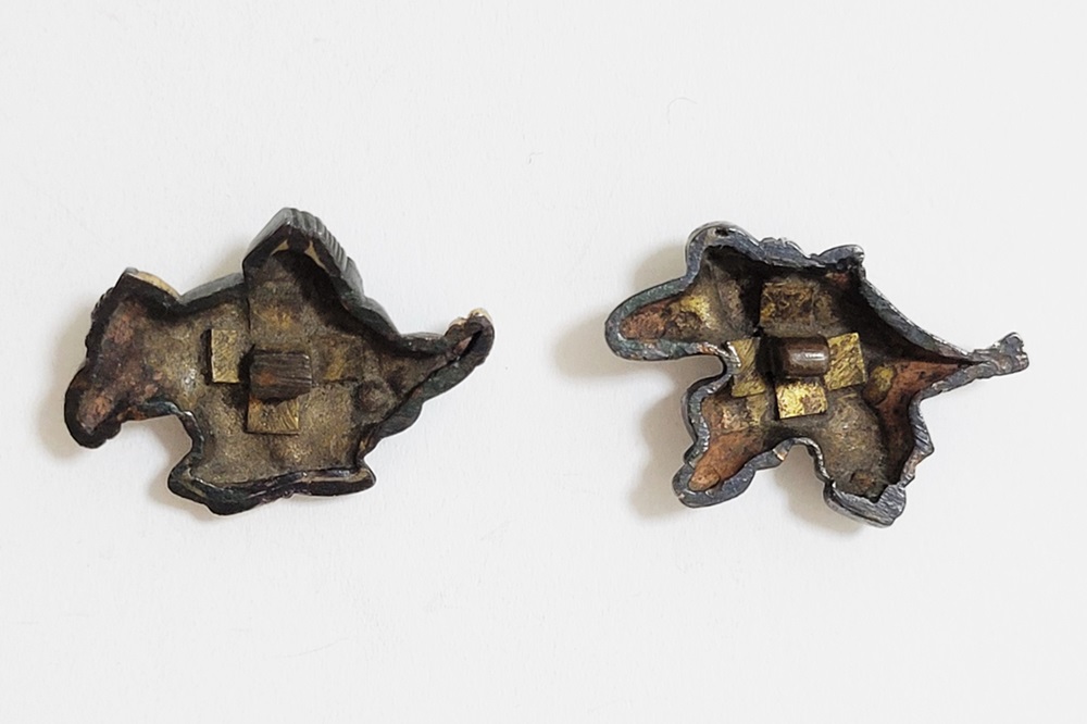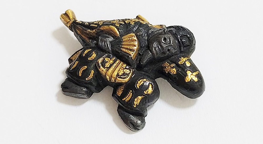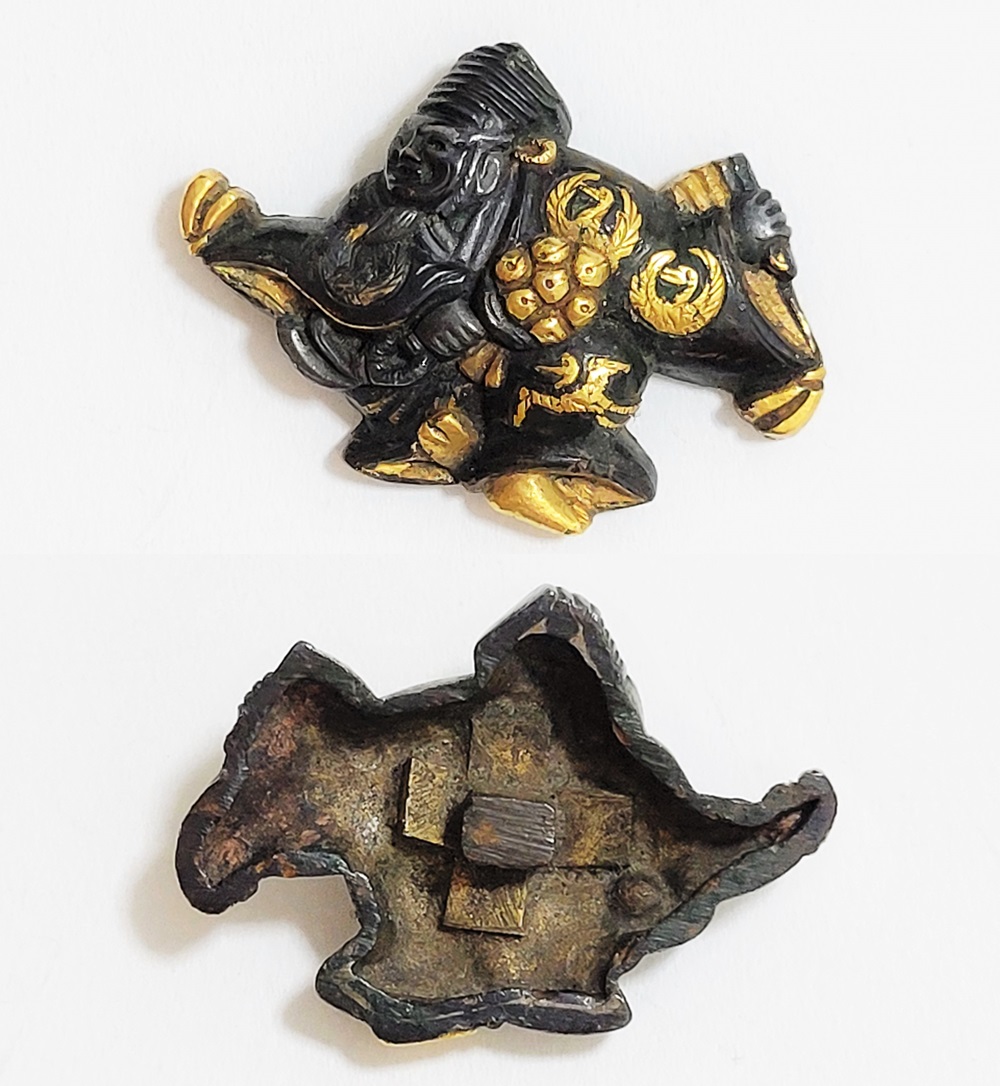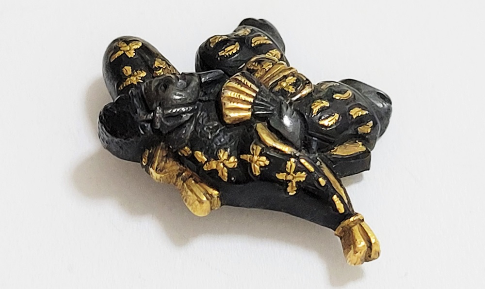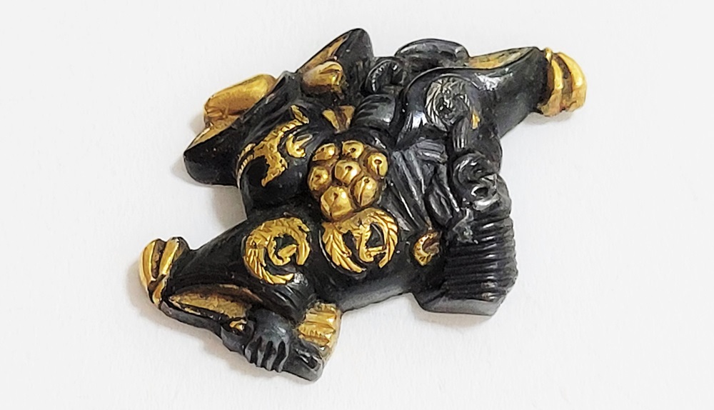 | 「三番叟(さんばそう)」は歌舞伎の演題として知られているが元は能楽からでた天下泰平、五穀豊穣を祈る舞。足利時代では最も重要な曲目であり、お目出度い席では三番叟が演ぜられた。目貫では、祐乗、宗乗、真乗などから一般古後藤と称せられるものなど桃山時代の名工が多く製作。その後後藤十代宗家の廉乗あたりまで見受けられる。顔立ちがきりりとして、動作がのびのびし、少しもかじかんだところがなく象嵌が精巧。こうした三番叟が、名人上手の作と謳われている。本作は後藤宗家七代顕乗と極められた三番叟図目貫。顕乗は後藤家中興の祖といわれる名人で、覚乗と共に江戸時代初期を代表する装剣金工家。後藤徳乗(宗家五代)の次男として天正十四年(1586)に生まれ分家して理兵衛家を創立。元和三年(1617)実兄栄乗(宗家六代)が没し一族合議の結果、宗家七代を継承する。寛永五年(1628)宗家の家督を兄栄乗の次男光重に譲る。その後従兄弟の覚乗と交替で隔年加賀国金沢に出張し前田家から扶持を給される。寛文三年(1663)78歳没。京都住。顕乗のころの目貫の裏の根は、陽根のみとなり、四個の力がねでしっかり止める新しい手法となった。本作は顕乗極めの格調高い三番叟図目貫。2024年5月審査で特別保存審査合格。 |