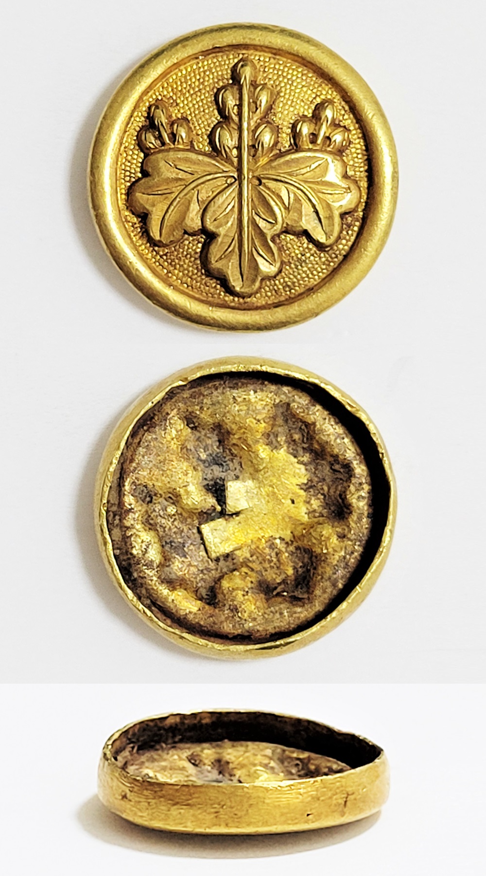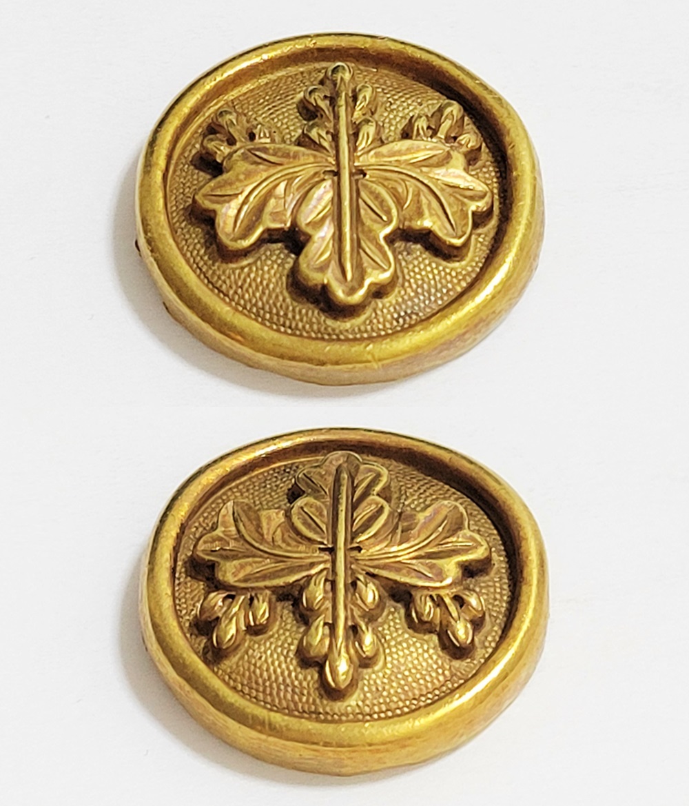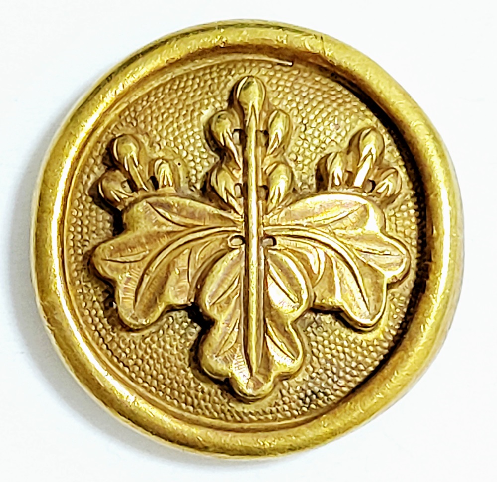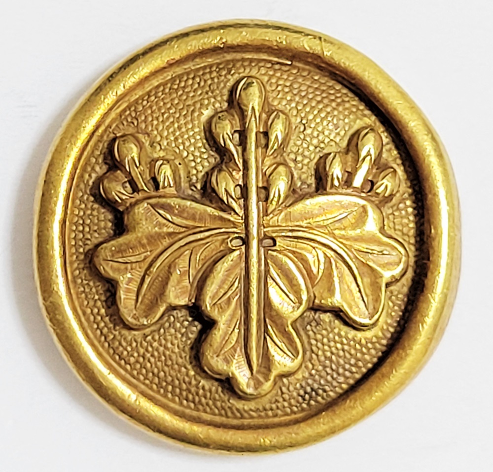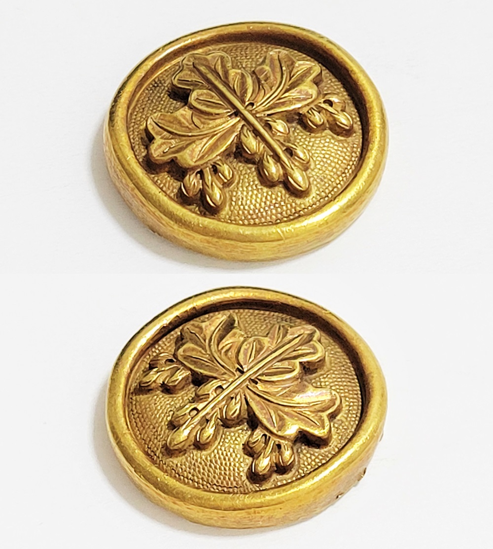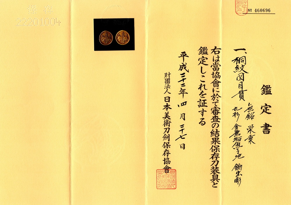 | 栄乗(後藤宗家六代)に極められた金無垢魚子地の五三桐紋図壺傘目貫。栄乗は徳乗(宗家五代)の長男で天正五年(1577)生。文禄三年(1594)に家督を相続。元和三年(1613)41歳没。京都住。自身銘は少なく遺作の多くは後代宗家の極めによる。作風は後藤家の典型的な作で、彫法古風にして大振り、紋高く三代乗真に似る。本作は魚子地に鋤出彫で五三桐紋をあらわす。麦鏨が入った大振りの壺傘金無垢目貫。2010年保存審査合格を2025年2月の刀装具審査で特別保存に昇格。 |