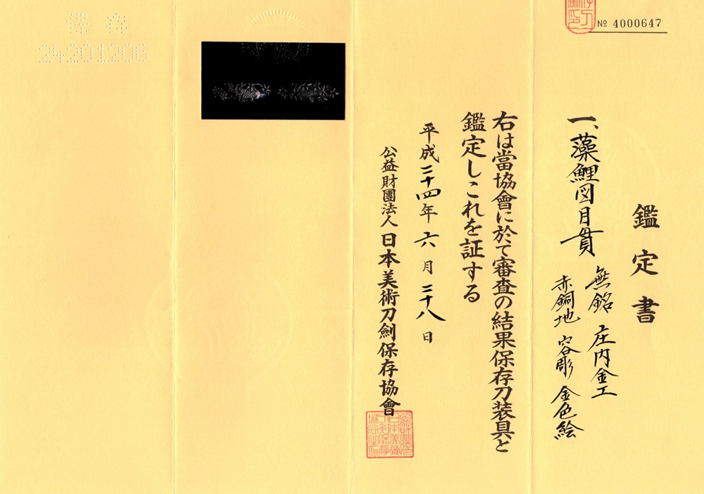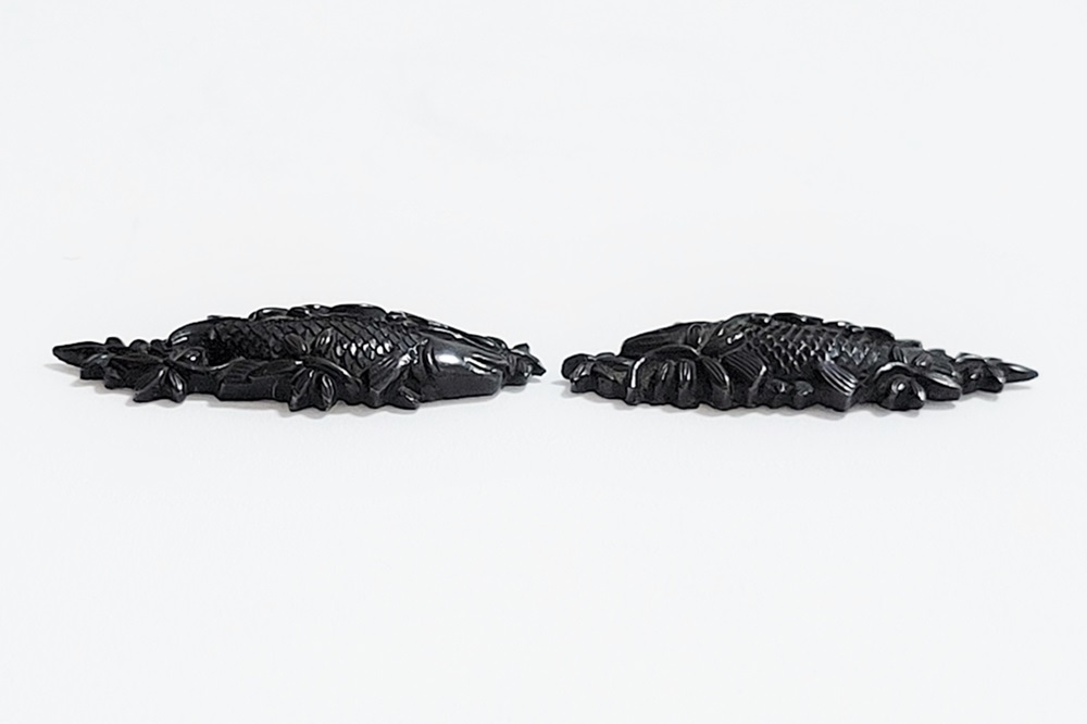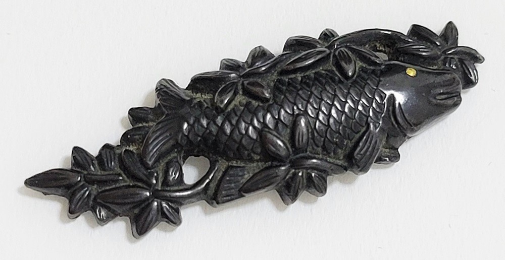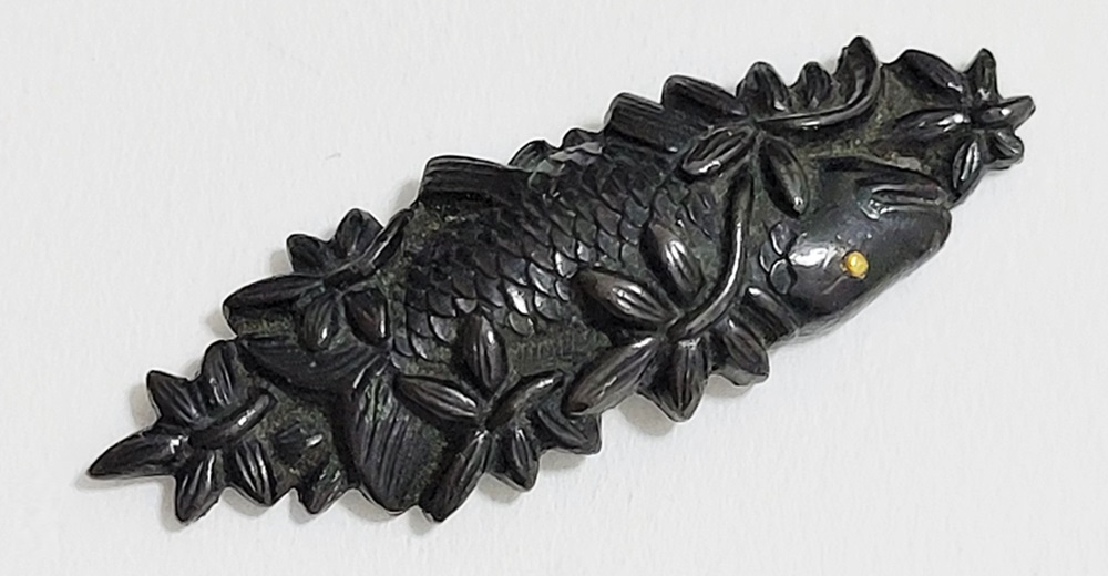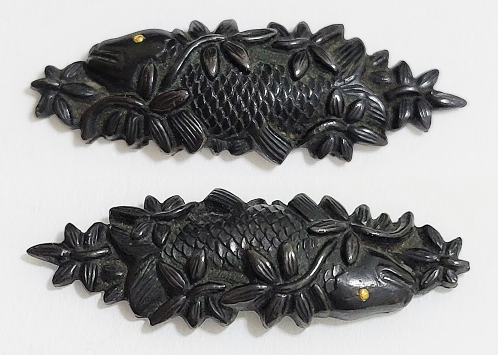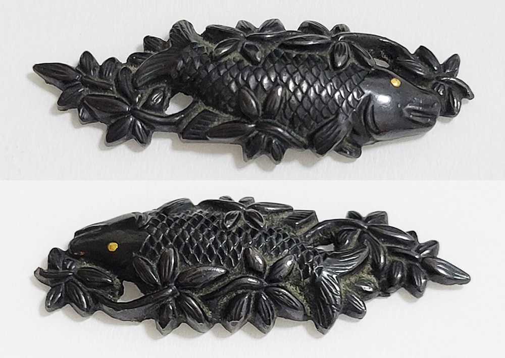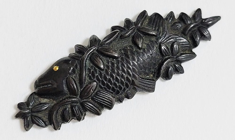 | 藻鯉図は吉兆図。鯉は普段深みに棲むが春から夏の一時期産卵のため川藻の浅瀬にあらわれる。それを古人は「藻出鯉(もいでこい)」として愛でた。あまり見る事のない川魚の長である鯉をみる目出度い徴(しるし)であり、産卵は子孫繁栄の吉祥事。本作は無銘の藻出鯉図目貫。2012年刀装具審査で庄内金工に極められて保存合格。 |