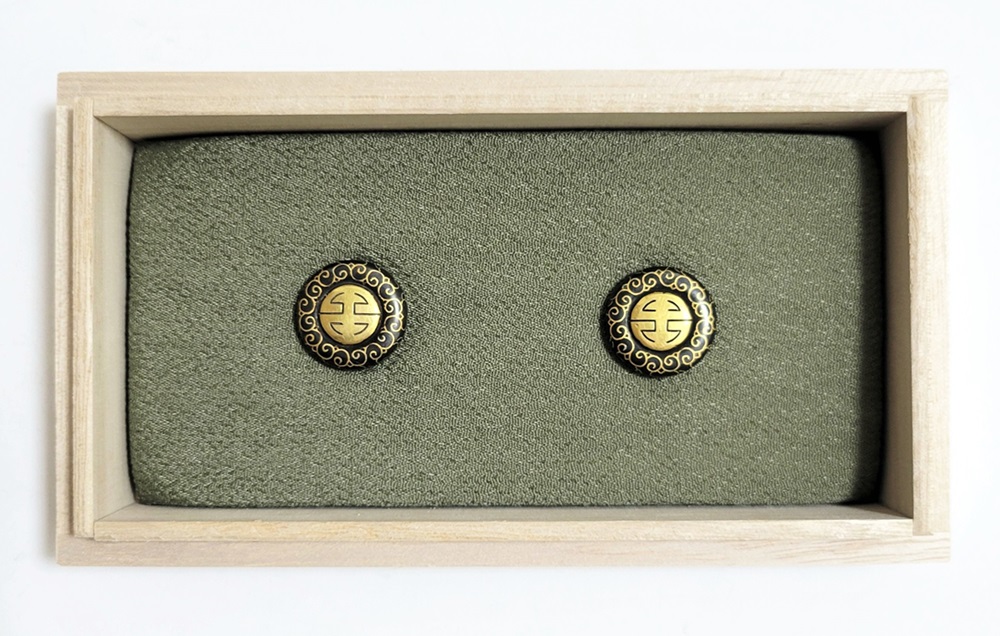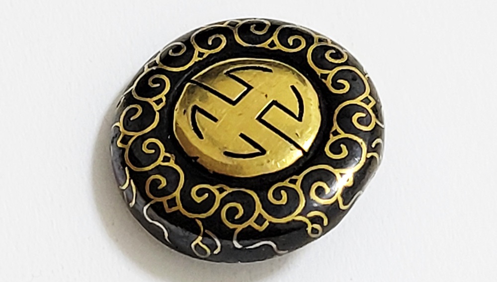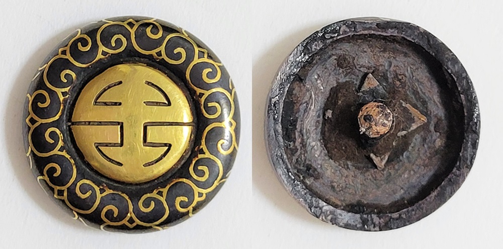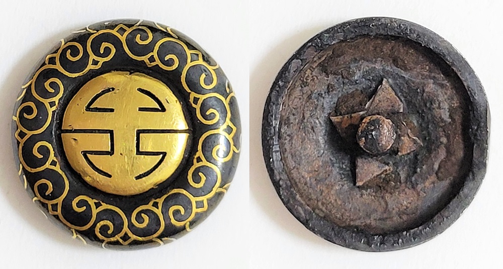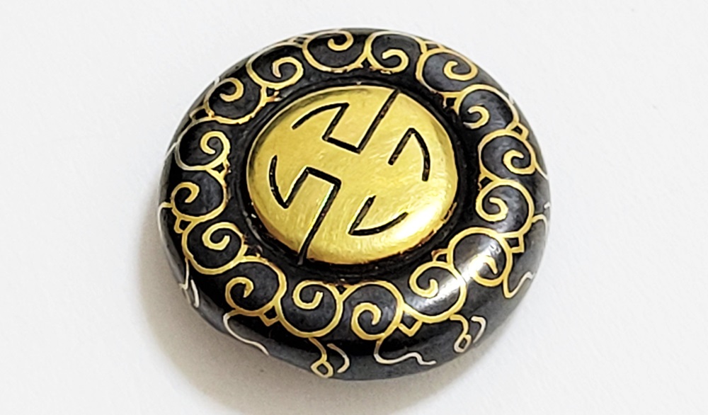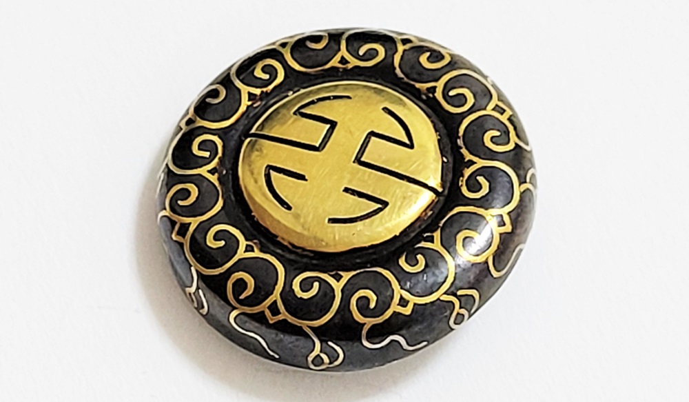 | 外周は唐草模様を赤銅磨地に金の平象嵌で、内円には金で記号のような紋を施す。加賀金工作と思われる優美な壺傘目貫。 |