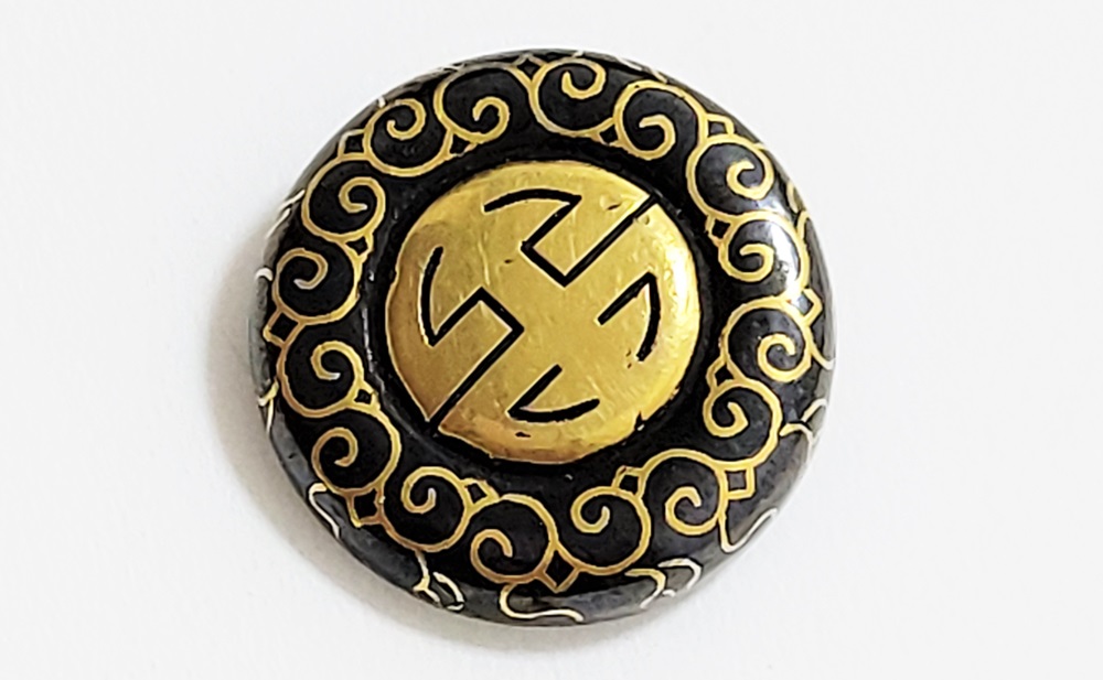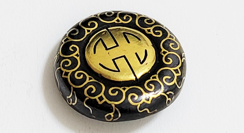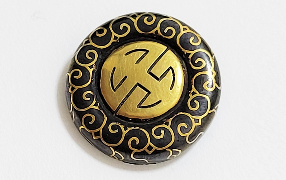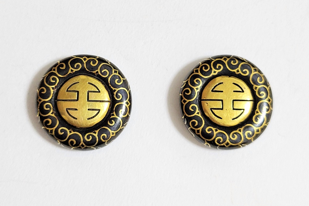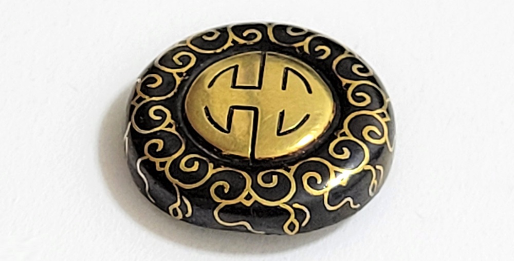 | 外周は唐草模様を赤銅磨地に金の平象嵌で、内円には金で記号のような紋を施す。加賀金工作と思われる優美な壺傘目貫。 |