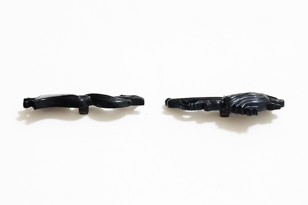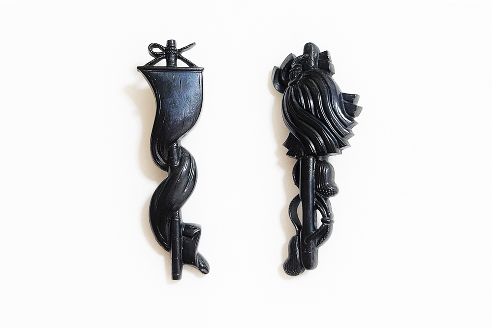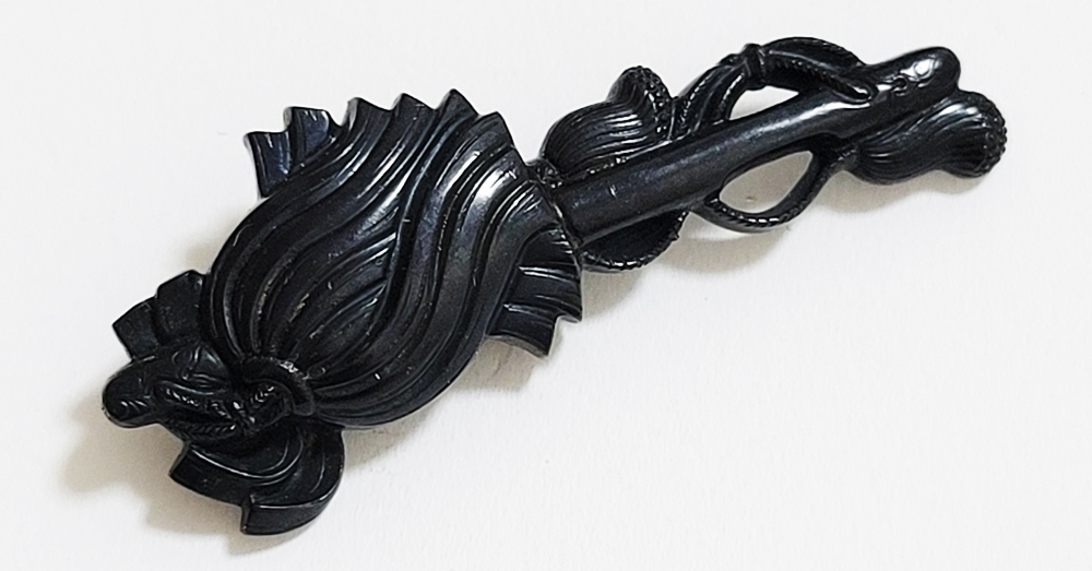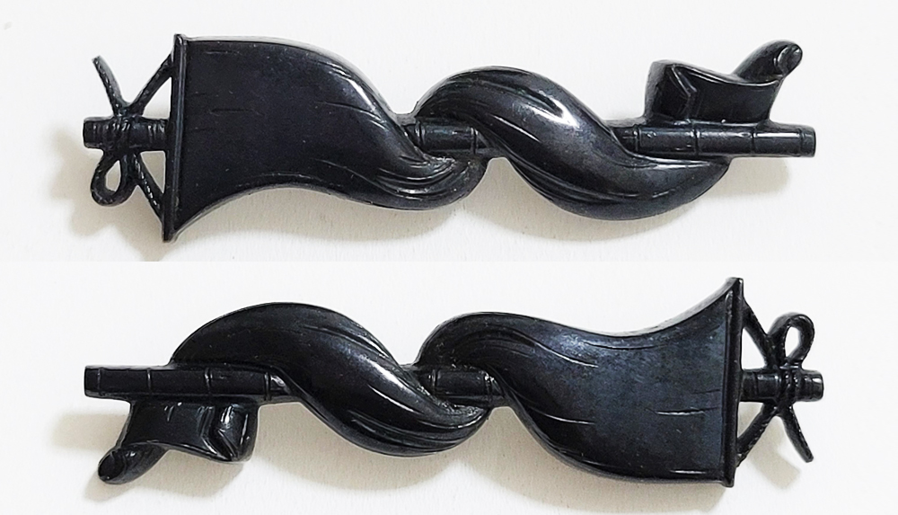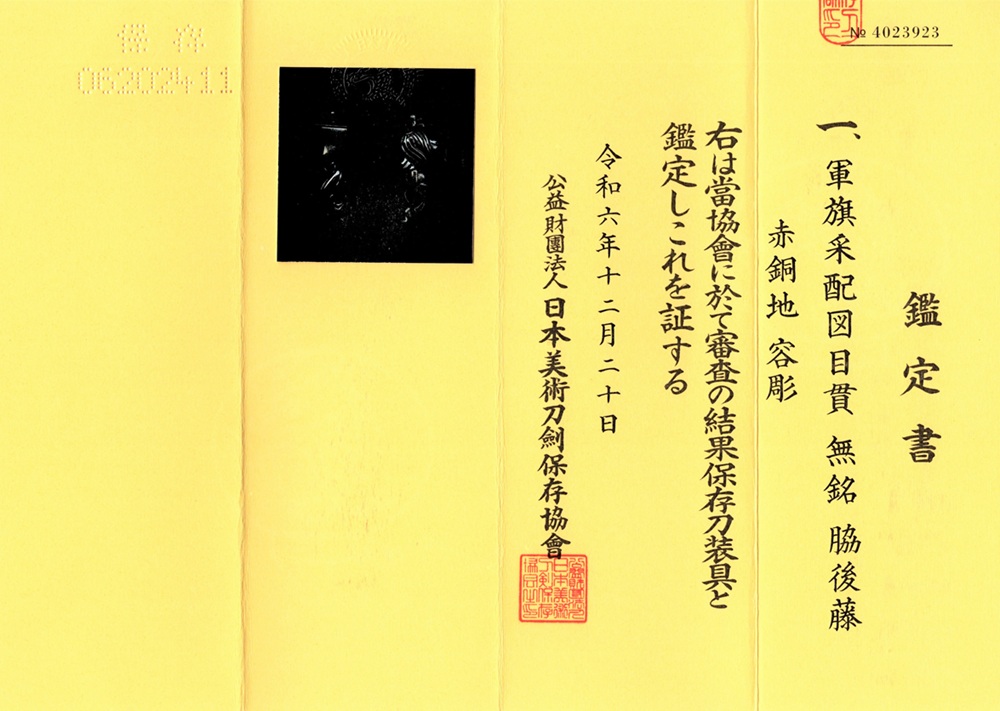 | 戦陣の象徴といえる流し旗と采配の竪図目貫。上質の赤銅のみを用いて、旗の上部にのみ竿を通す流れ旗(軍旗)と大将が陣頭で指揮を振る采配を表現した意匠。2024年11月刀装具審査で脇後藤に極まり保存合格。 |