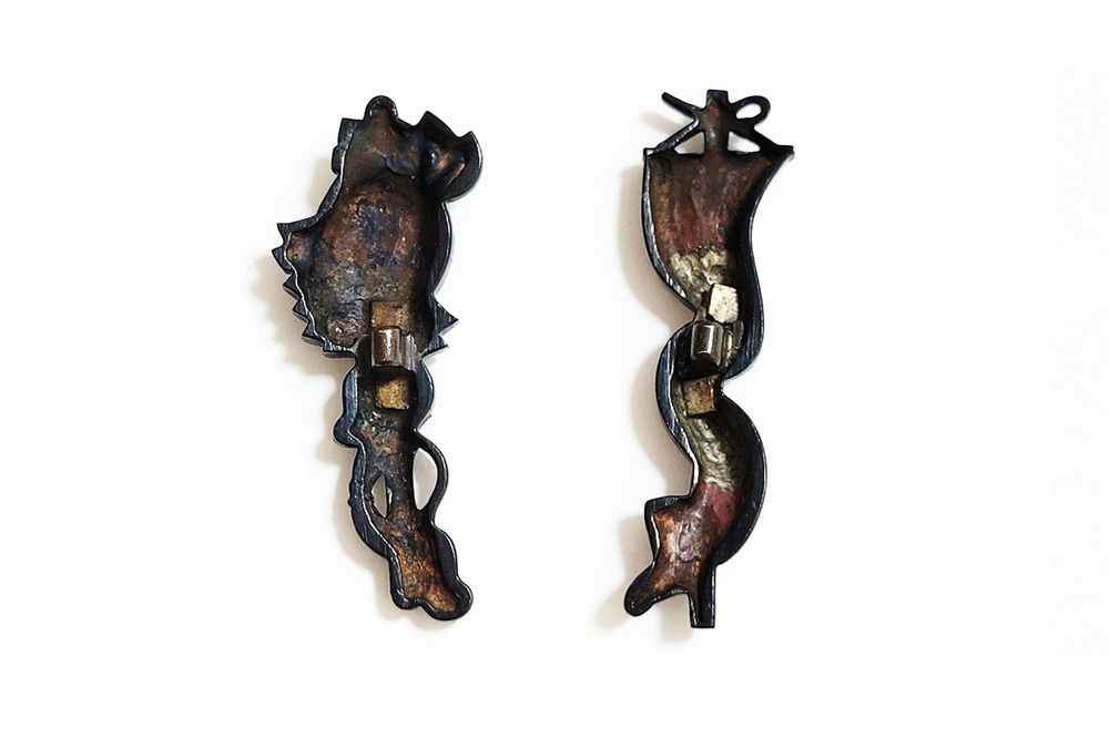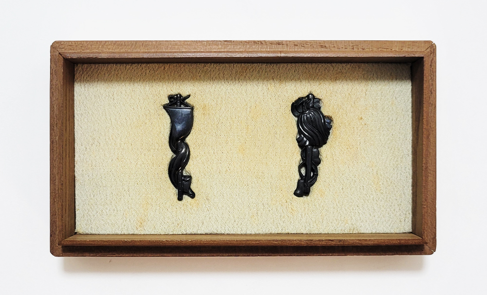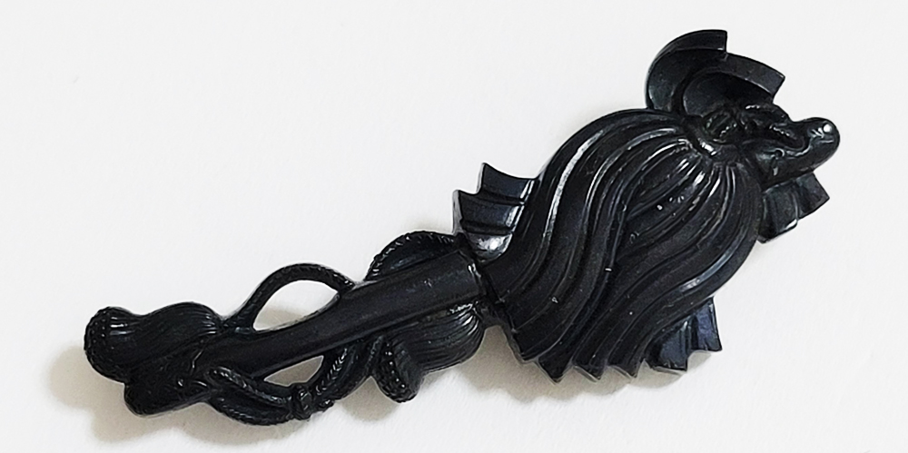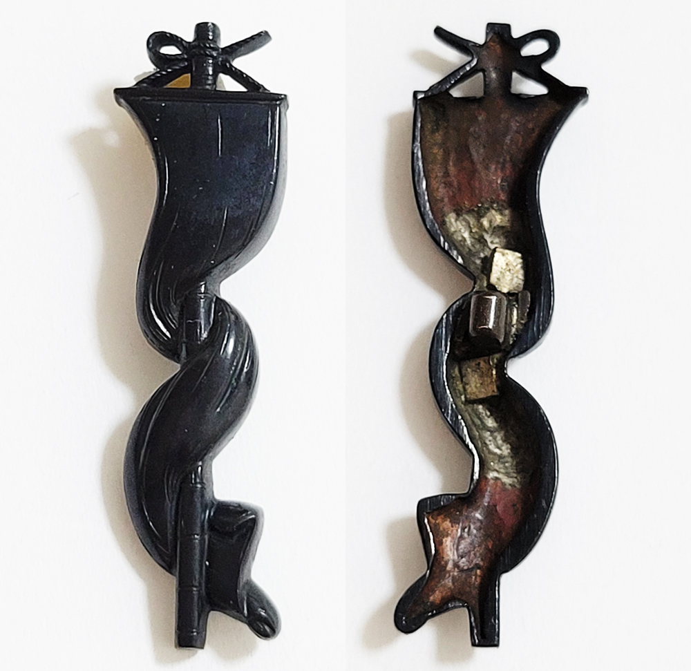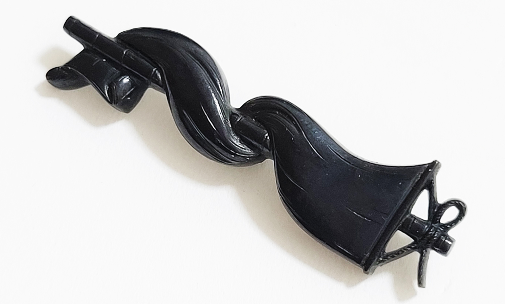 | 戦陣の象徴といえる流し旗と采配の竪図目貫。上質の赤銅のみを用いて、旗の上部にのみ竿を通す流れ旗(軍旗)と大将が陣頭で指揮を振る采配を表現した意匠。2024年11月刀装具審査で脇後藤に極まり保存合格。 |