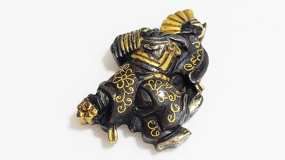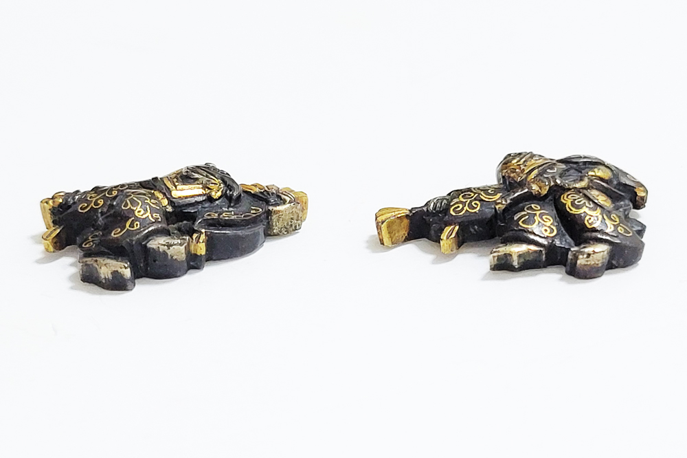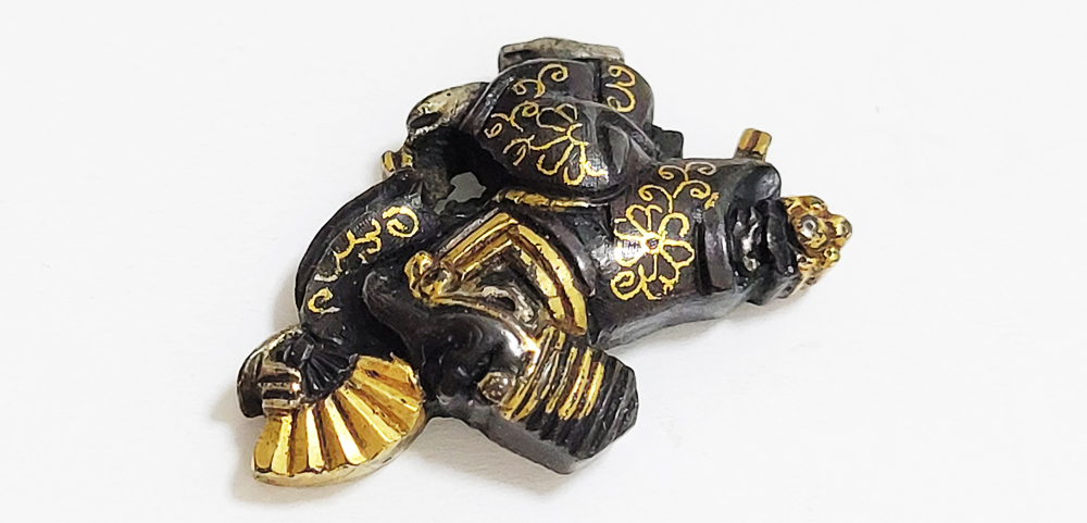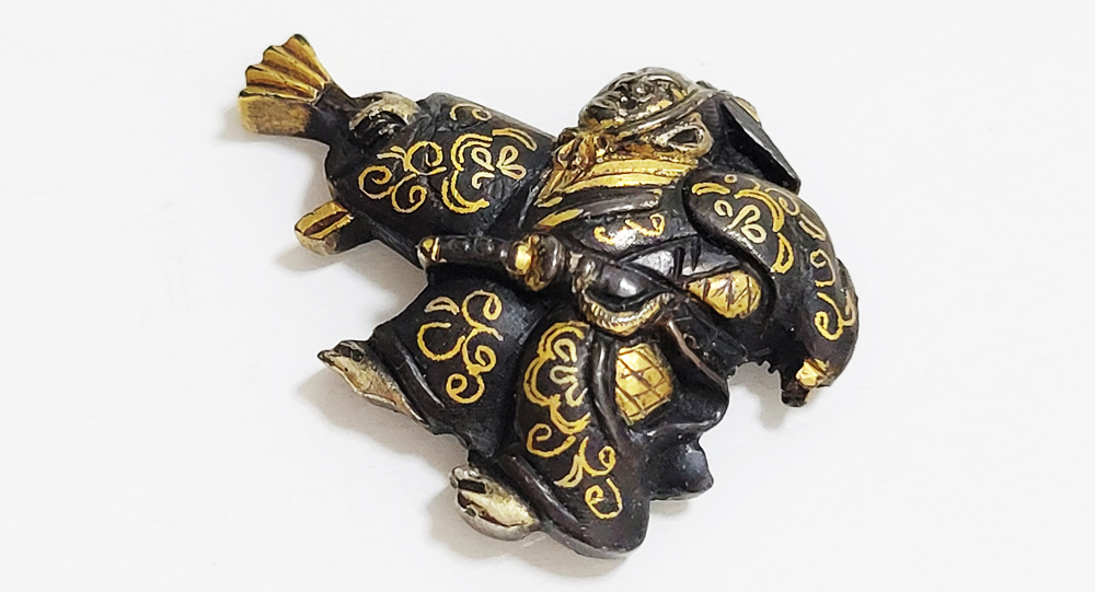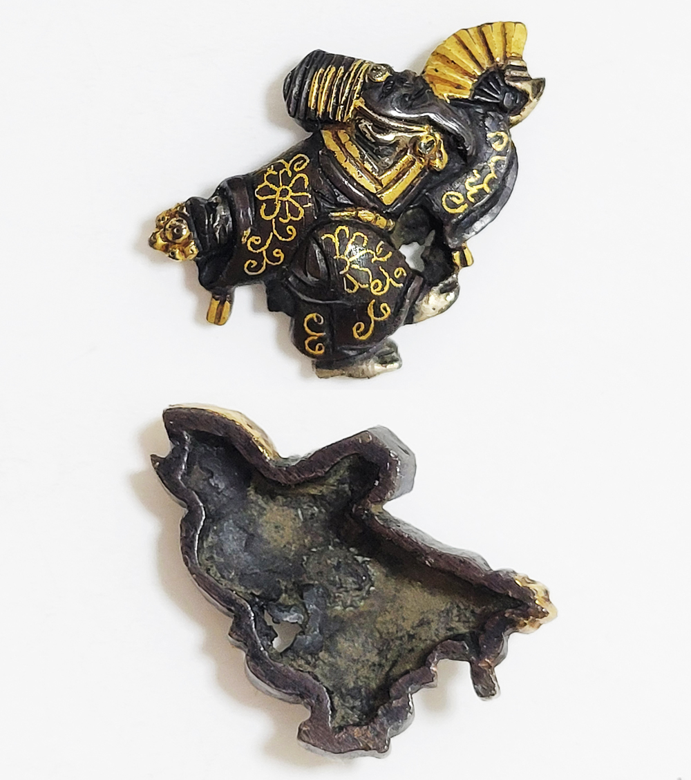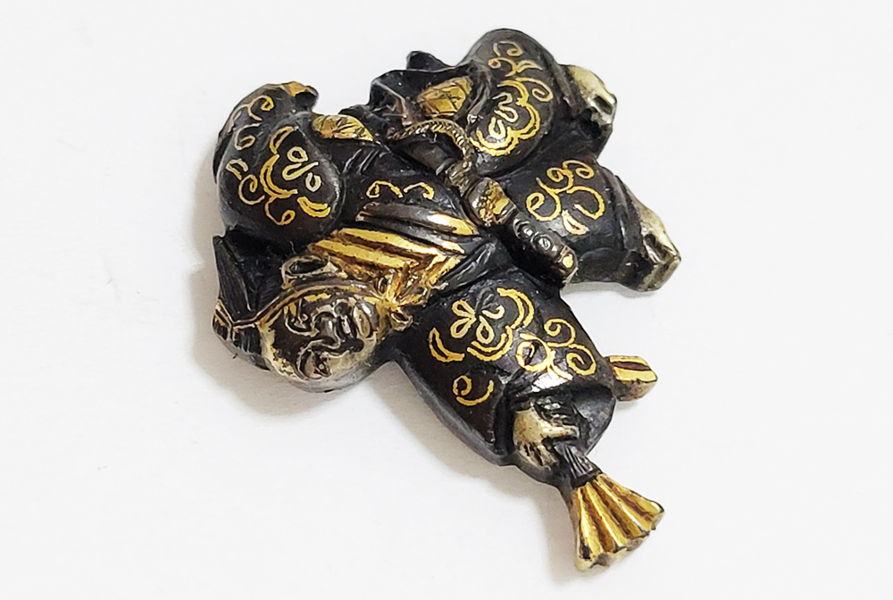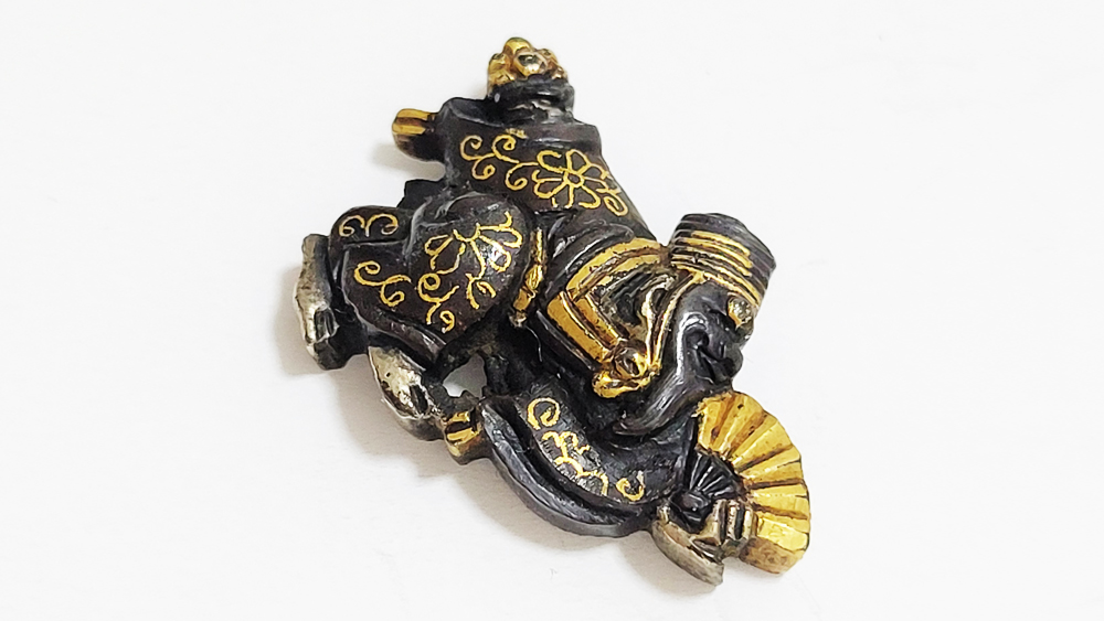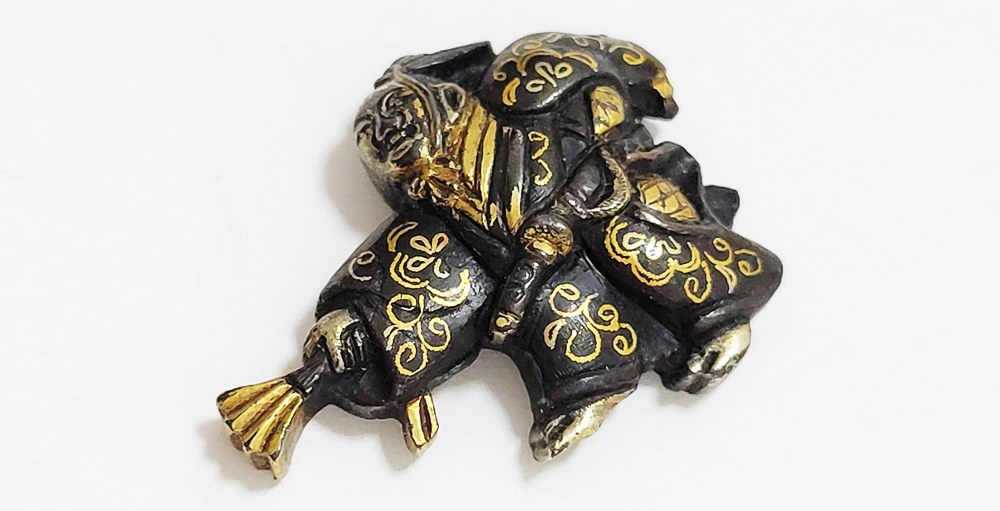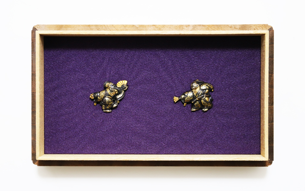 三番叟(さんばそう)は天下泰平を願い、五穀豊穣を祝う能楽のめでたい演目。黒尉(こくじょう)の面を付けて鈴を振って舞う表目貫と面をつけない直面(ひためん)で足拍子を踏みしめ力強く舞う裏目貫。落し箱に納められ見映えする。2010年刀装具審査で京金具師に極められ保存合格。