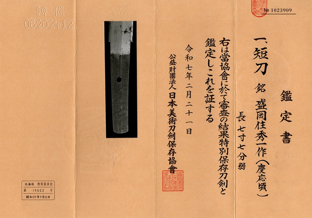 | 盛岡住秀一(ひでかず)は宮川庄右衛門。文化十年(1813)二子通轟村(現花巻市)生まれ。天保十四年(1843)藩士栃内与兵衛(三百石格)に従って江戸に上り、七代石堂運寿是一の門人となって刀鎗鍛練の修業を積む。業成り嘉永五年(1852)帰途に就く。安政二年(1855)頃南部藩抱工。冶明治20年(1887)没。年紀作は嘉永二年から明治三年(1849-1890)を遺す。本作は腰部上の鎬地を削いだ変り鵜の首造り。黒石目地塗合口拵が付されている。2025年特別保存刀剣審査合格。 |