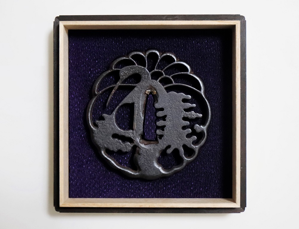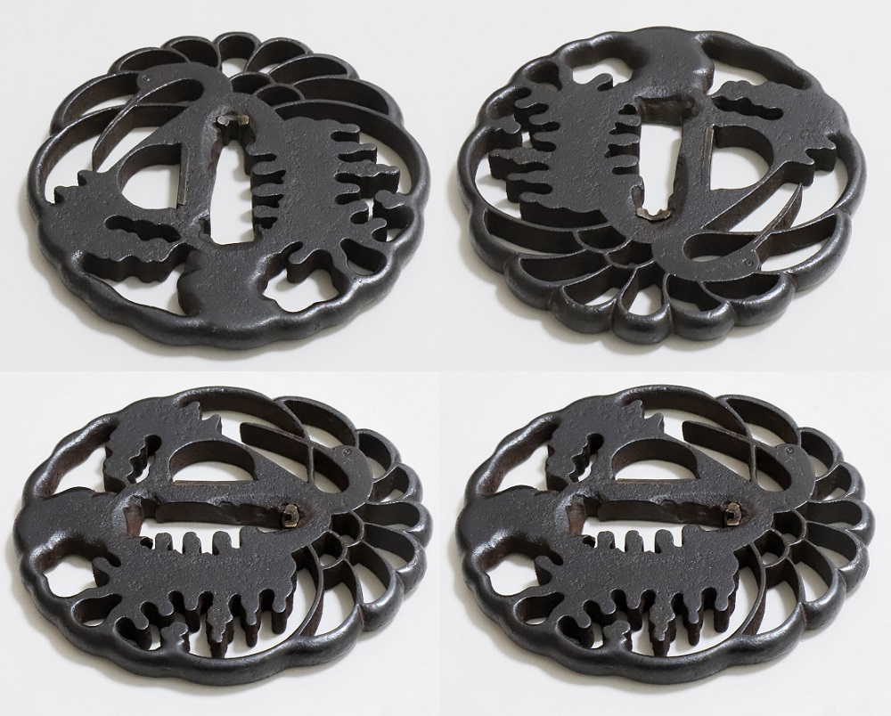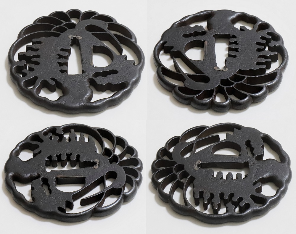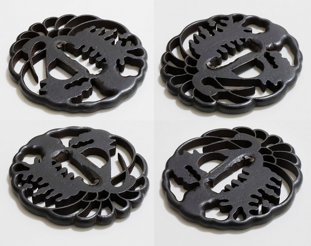 | 林は肥後金工の一派。肥後金工は藩主細川家の庇護によって発達し肥後独特の刀装、肥後拵に掛けるためにつくられた。実用に適してよく鍛錬された鉄鐔である。林派の初代林又七は慶長十年(1605)生まれ。一派の基礎を固めた肥後金工を代表する名人。二代重光も技量に優れ、以下三代藤八、四代平蔵、五代又平、六代又八、七代藤八と続いた。本作は精美な地鉄の格調高い人気の鐔。2020年1月審査で特別保存刀装具合格。 |