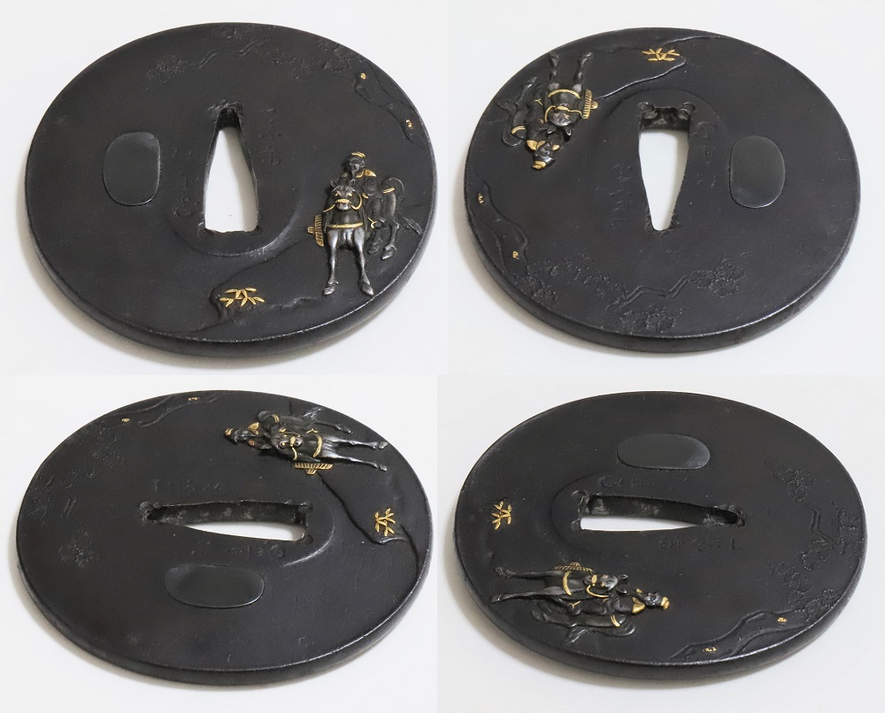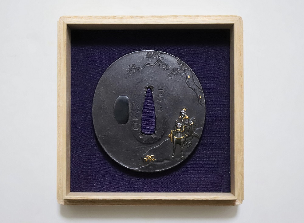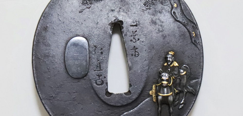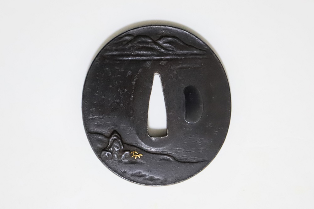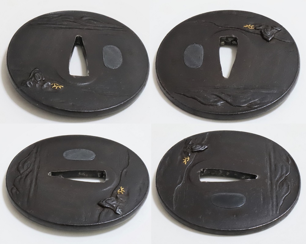 一葉斎弘直は打越弘寿の門人で江戸時代後期の水戸金工。本作は、精錬された鉄、僅かな鋤残耳、簡素ながらも広がりを想起させる構図と彫法で非の打ち所がないと感じ得る上出来の名鐔。