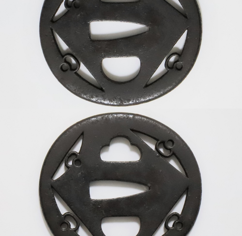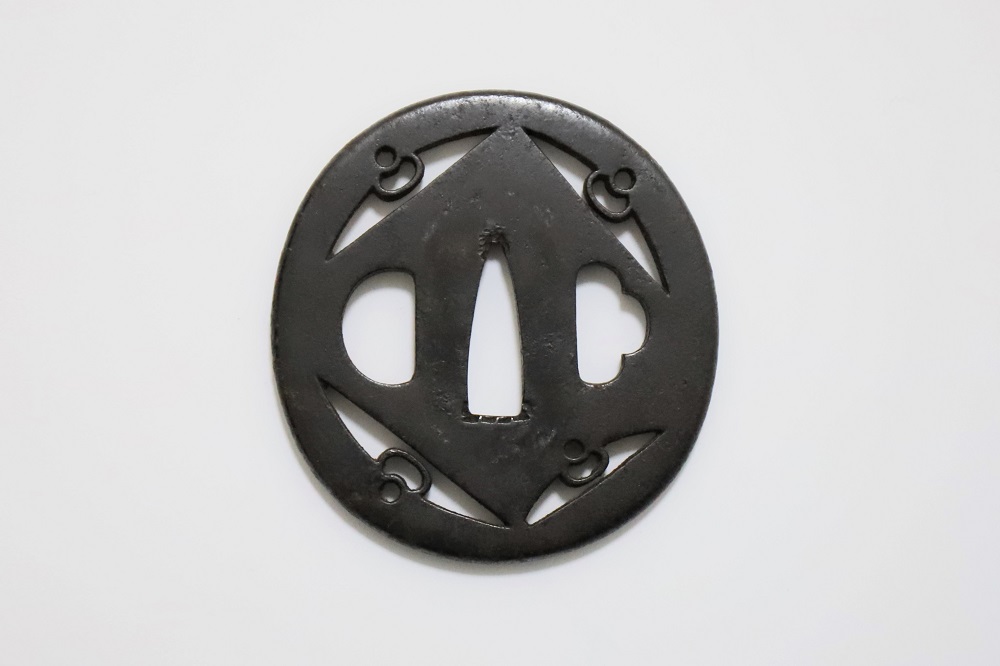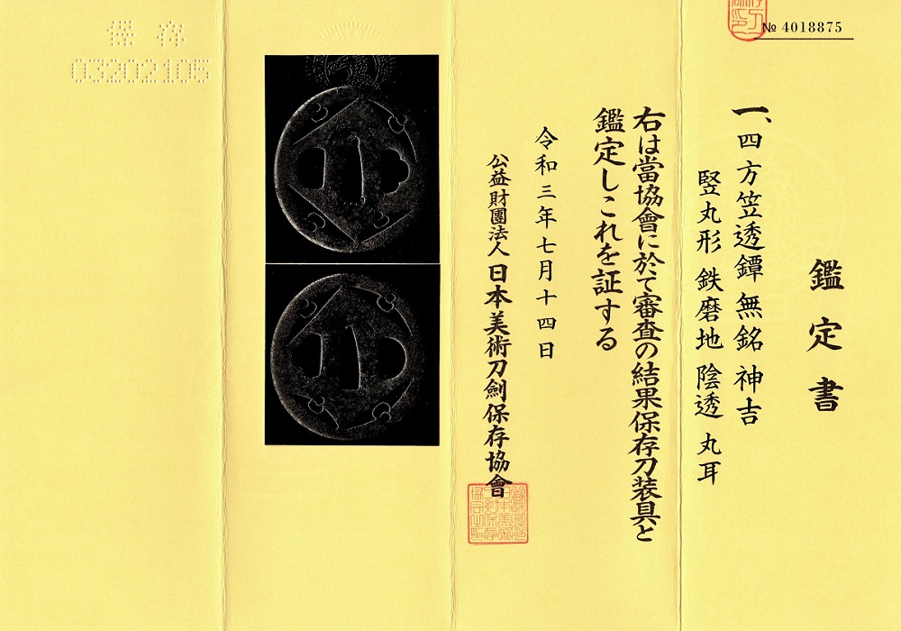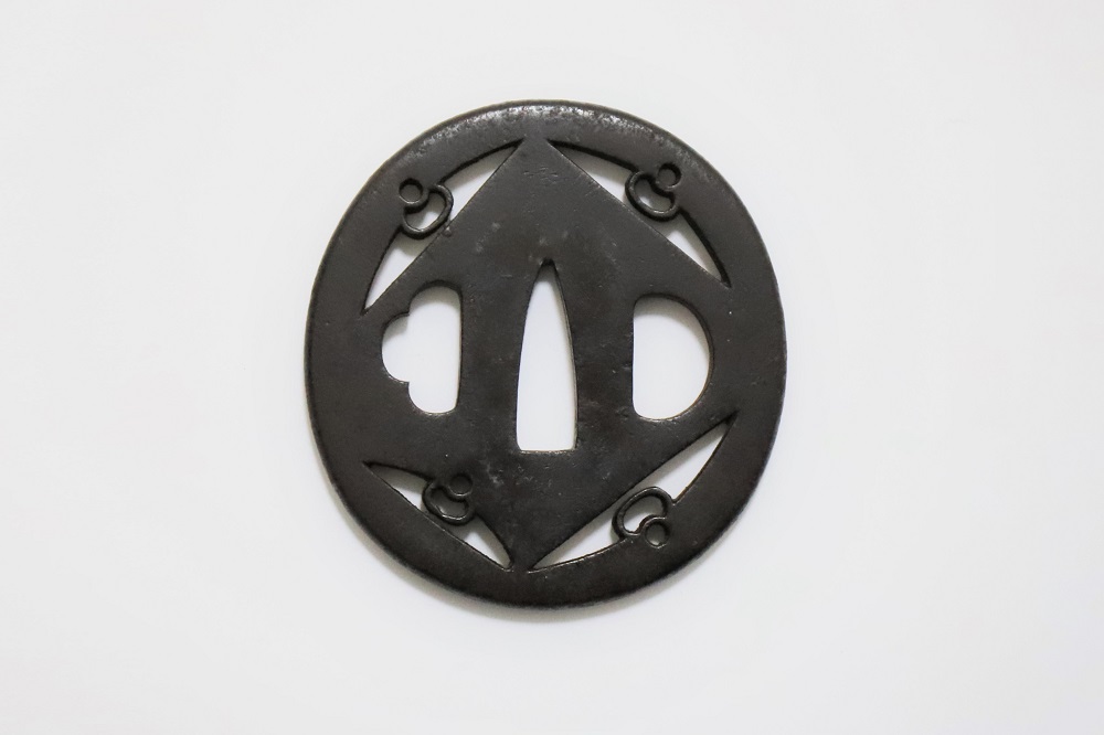 | 神吉と極められた肥後鐔。神吉(かみよし)は肥後金工の一派。藩主細川公が肥後金工の伝統を守るために技量の優れた林家(初代又七、二代重光)の三代藤八に命じて神吉寿平に林家の秘法すべてを相伝させ、その息子深信(寛政十年1798-嘉永四年1851)と楽寿(文化十四年1817-明治十四年1884)親子が近世の名工として名を馳せた。本作は、茎櫃の責鏨に特徴がある。構図は四方に菅笠(すげがさ)を配するが対称でなく、その意図に思いが巡る。 |