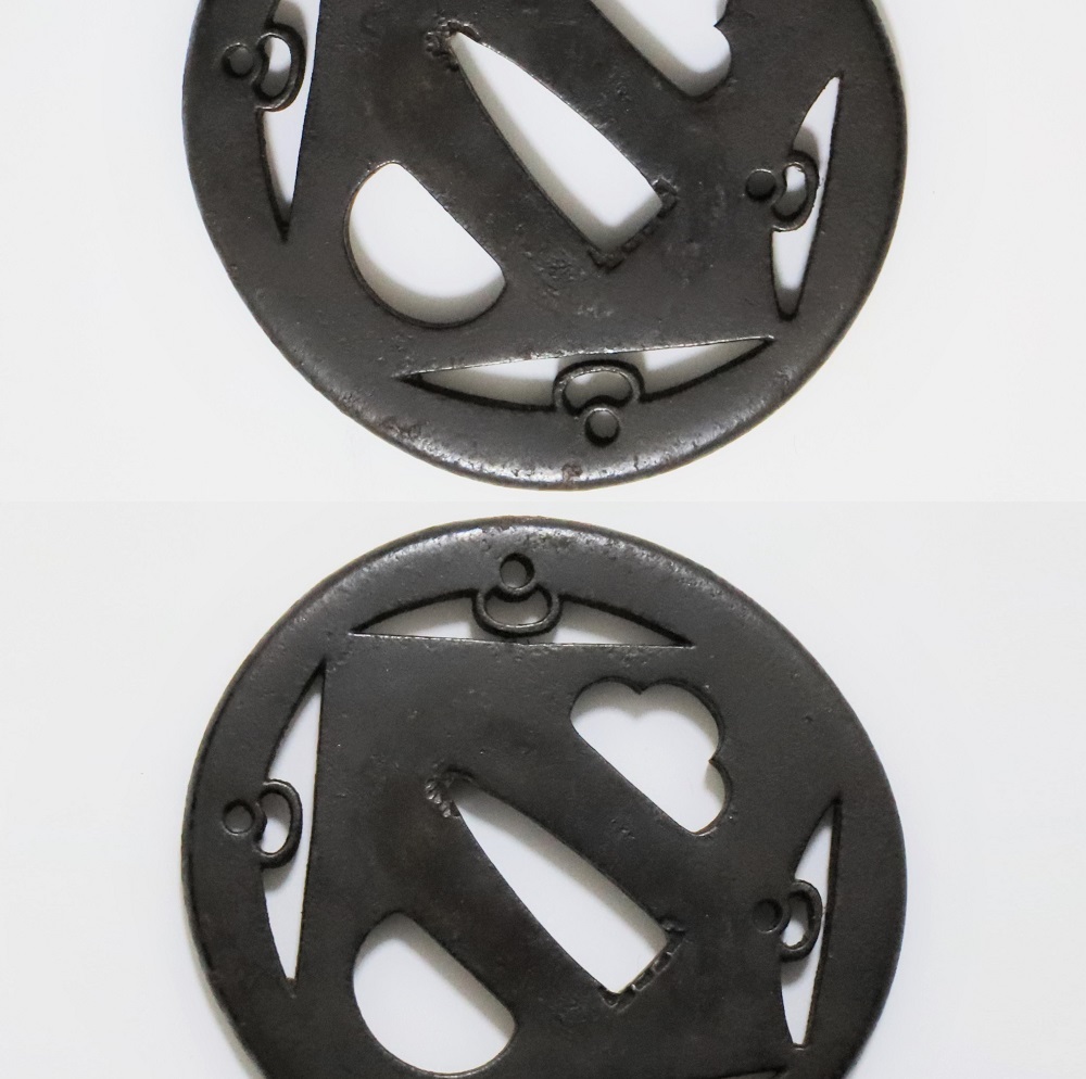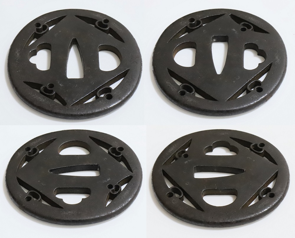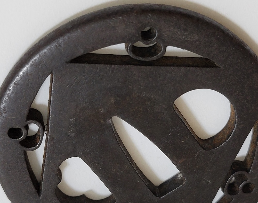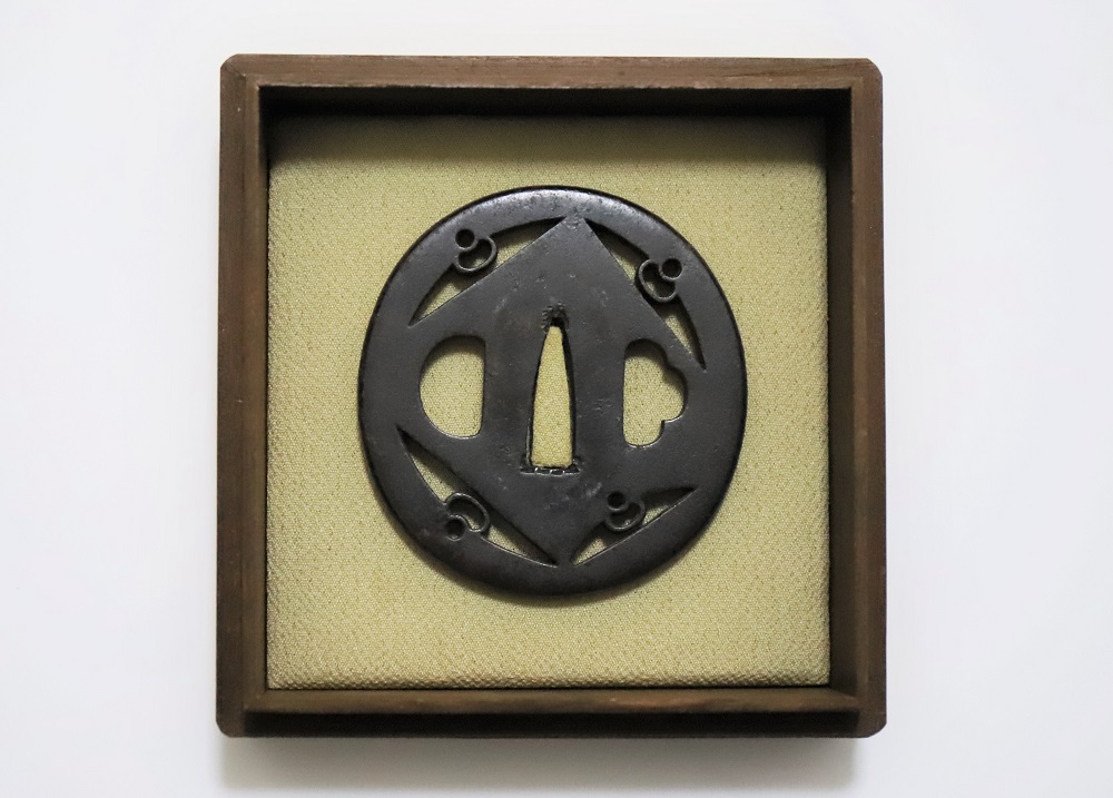 | 神吉と極められた肥後鐔。神吉(かみよし)は肥後金工の一派。藩主細川公が肥後金工の伝統を守るために技量の優れた林家(初代又七、二代重光)の三代藤八に命じて神吉寿平に林家の秘法すべてを相伝させ、その息子深信(寛政十年1798-嘉永四年1851)と楽寿(文化十四年1817-明治十四年1884)親子が近世の名工として名を馳せた。本作は、茎櫃の責鏨に特徴がある。構図は四方に菅笠(すげがさ)を配するが対称でなく、その意図に思いが巡る。 |