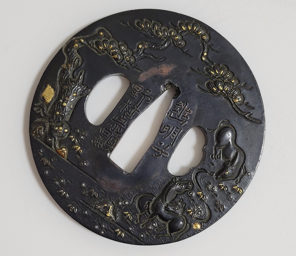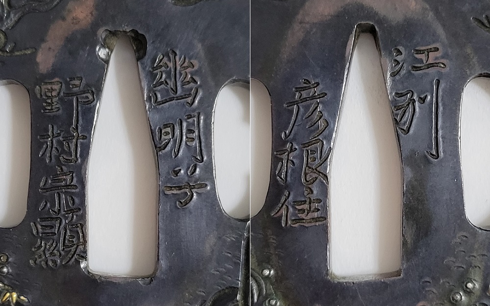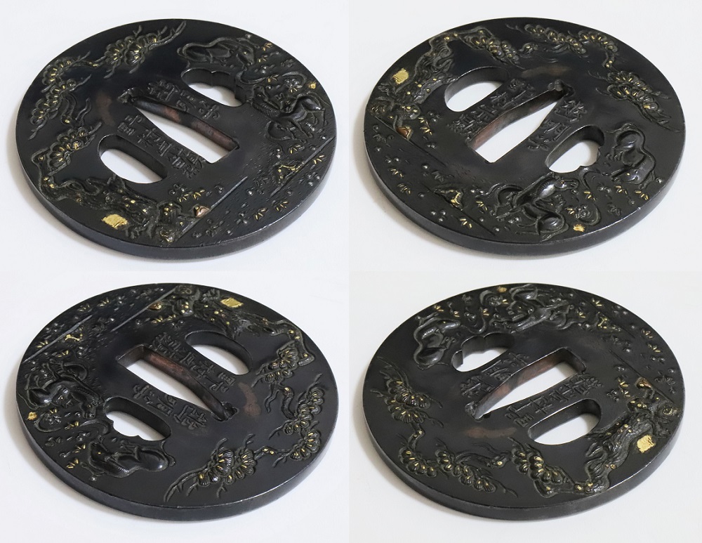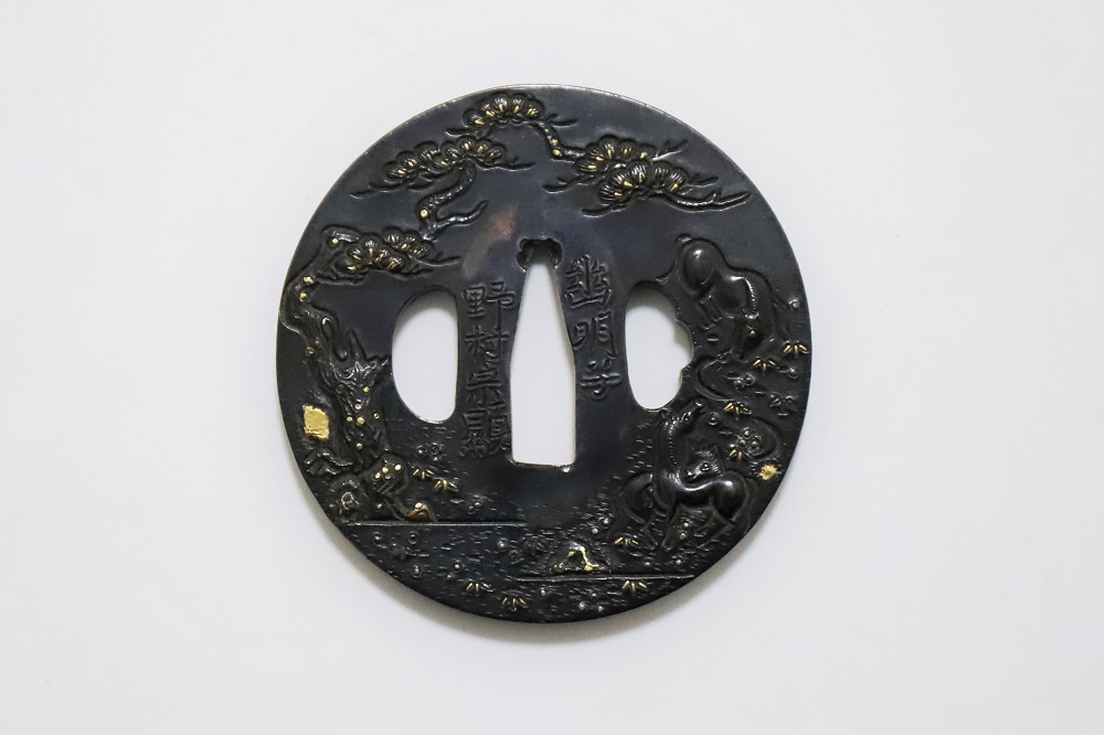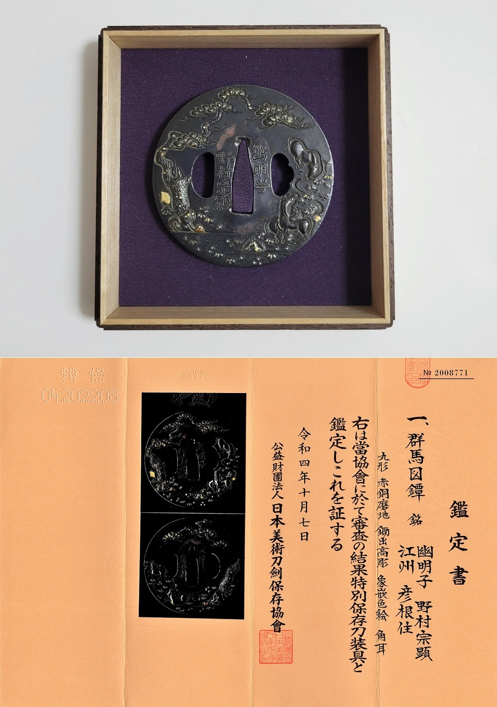 | 宗顕は野村氏。野村包教(かねのり)の門人。江戸中期、近江国彦根住。号は幽明子。本作は藻柄子宗典製(喜多川派)の特色ある作風。入念に作られた在銘鐔。2022年8月審査で特別保存合格。12月落し箱新調。 |