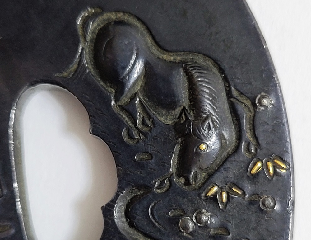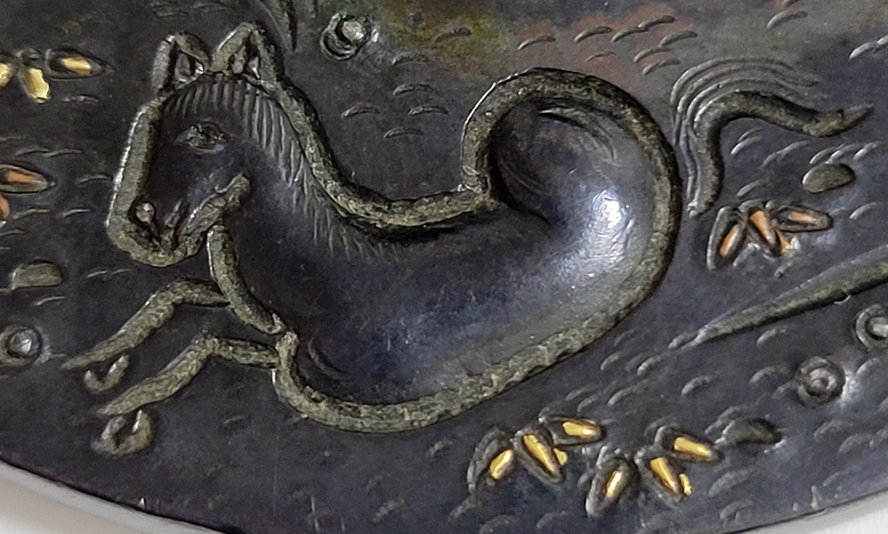 | 材質 | 赤銅磨地 丸形 鋤出高彫 象嵌色絵 角耳 |