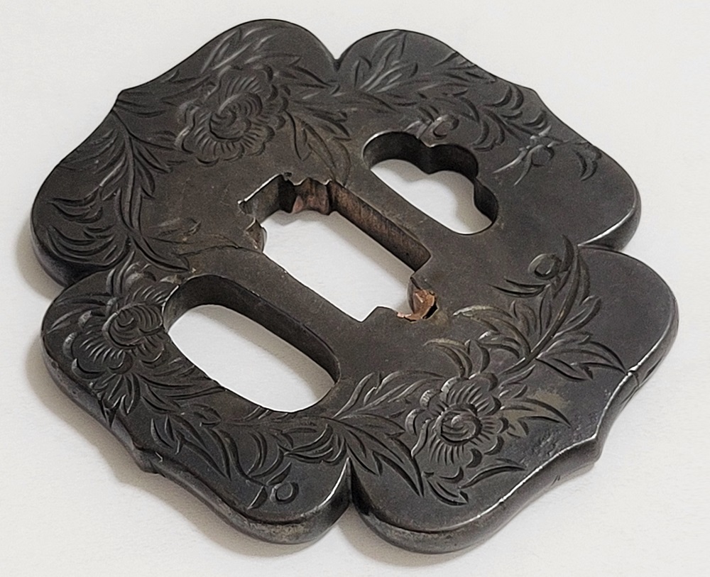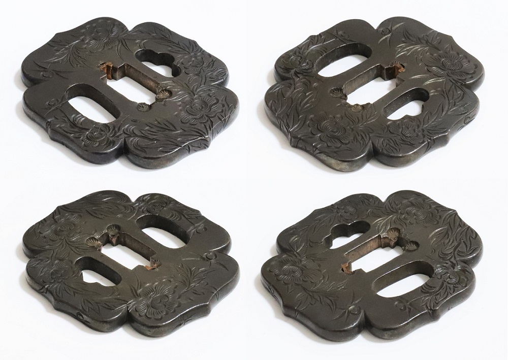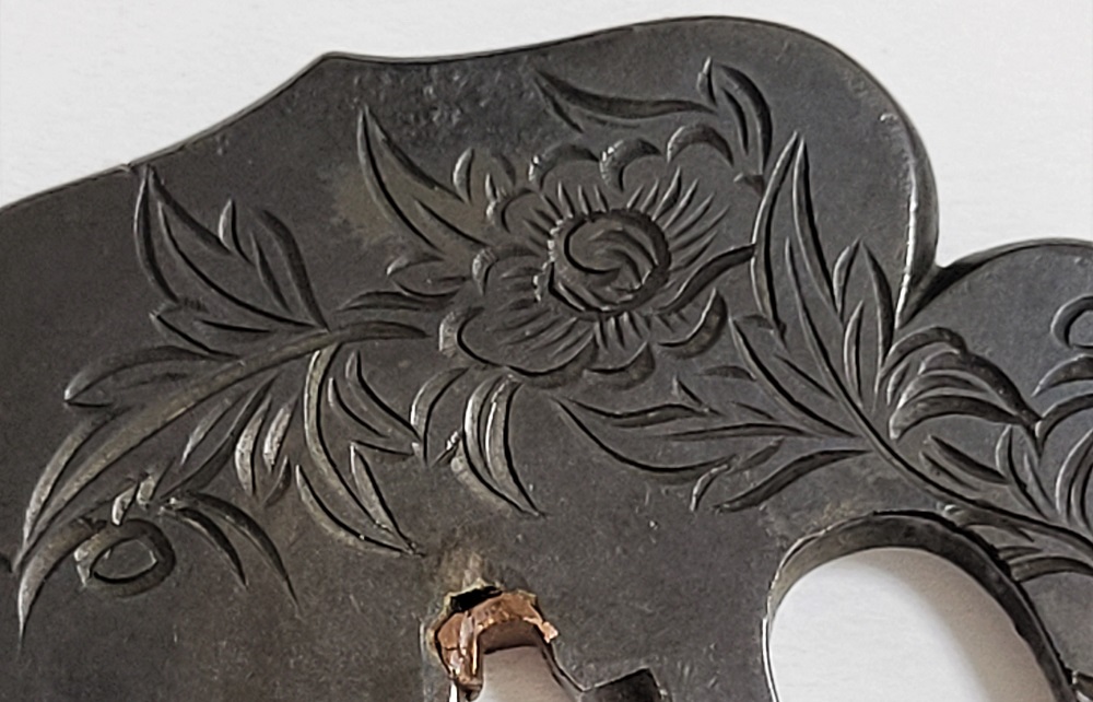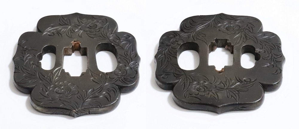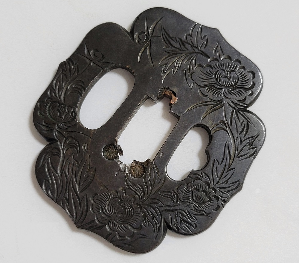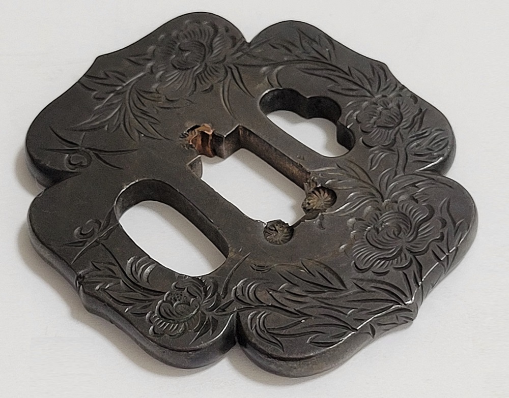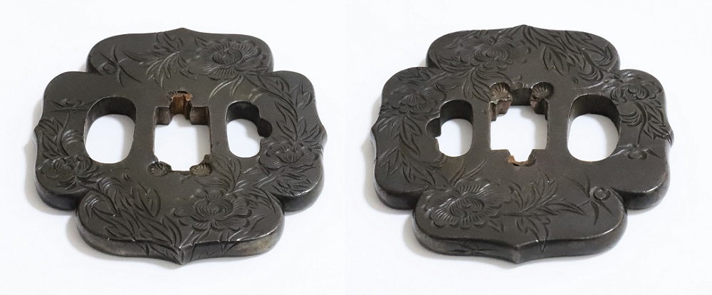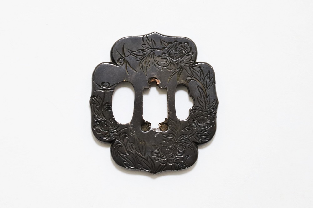 | 茎櫃孔や菊座鏨の責め方から特殊に作られた鐔であろう。四分一磨地、太刀木瓜小形、片切彫の牡丹図鐔。 |